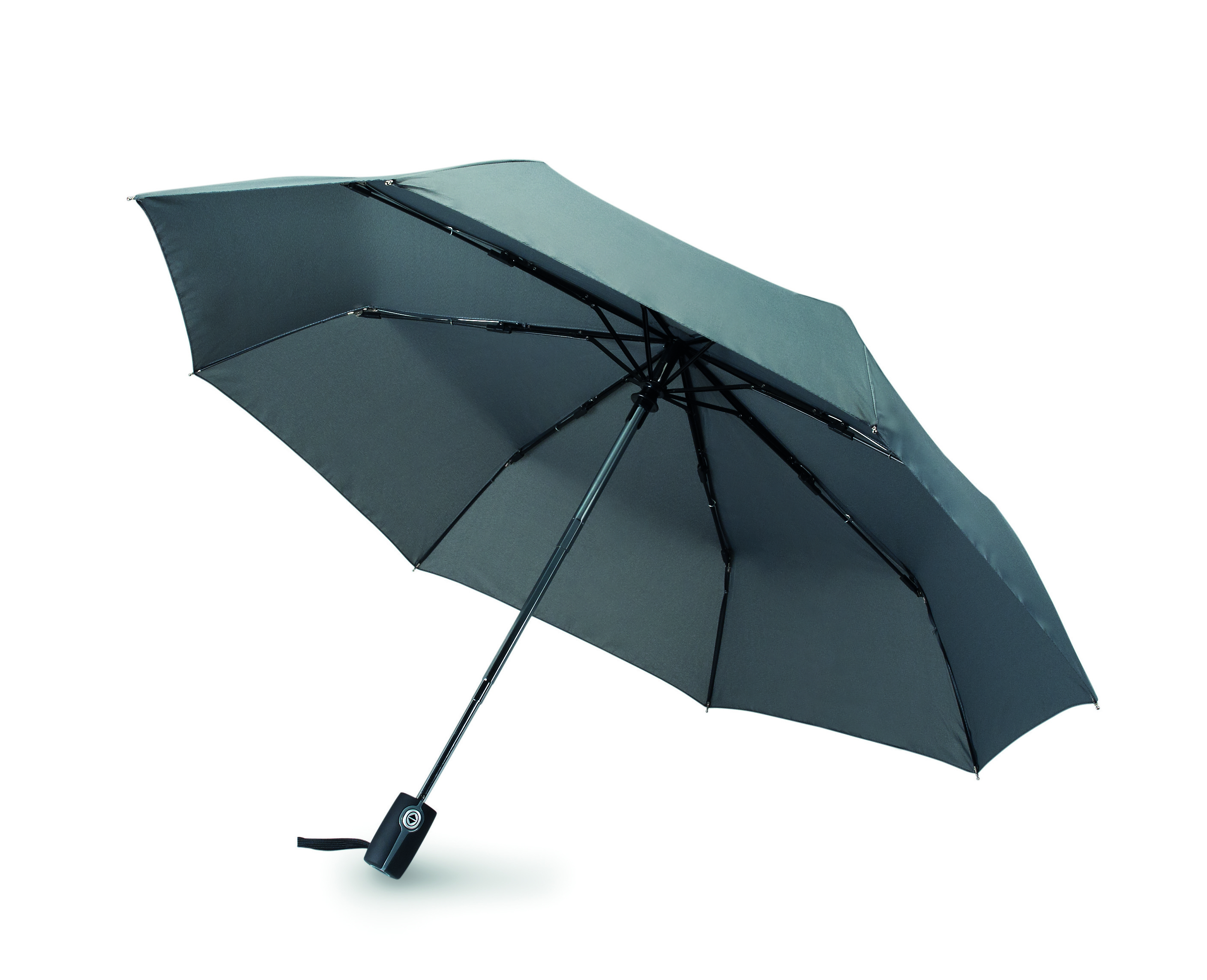 Ekskluzywny 21 calowy automatyczny parasol wykonany z wysokogatunkowego materiału 190T. Trzon metalowy, czarne ożebrowanie 2 sekcyjne wykonane z włókna szklanego zakończenia chromowane. Czarna gumowana rączka z automatycznym zamknięciem.
