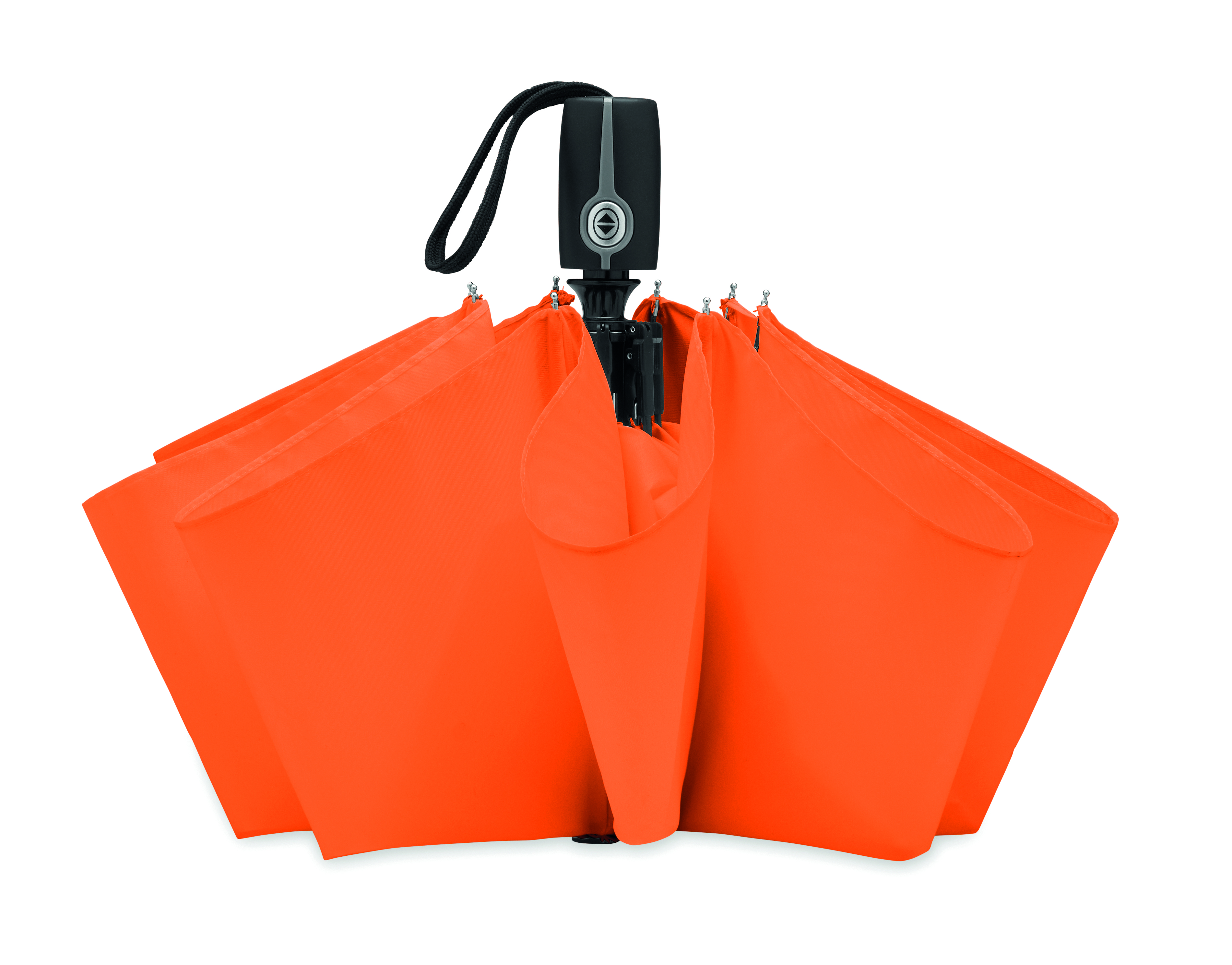 Ekskluzywny 21 calowy automatyczny parasol wykonany z wysokogatunkowego materiału 190T. Trzon metalowy, czarne ożebrowanie 2 sekcyjne wykonane z włókna szklanego zakończenia chromowane. Czarna gumowana rączka z automatycznym zamknięciem.