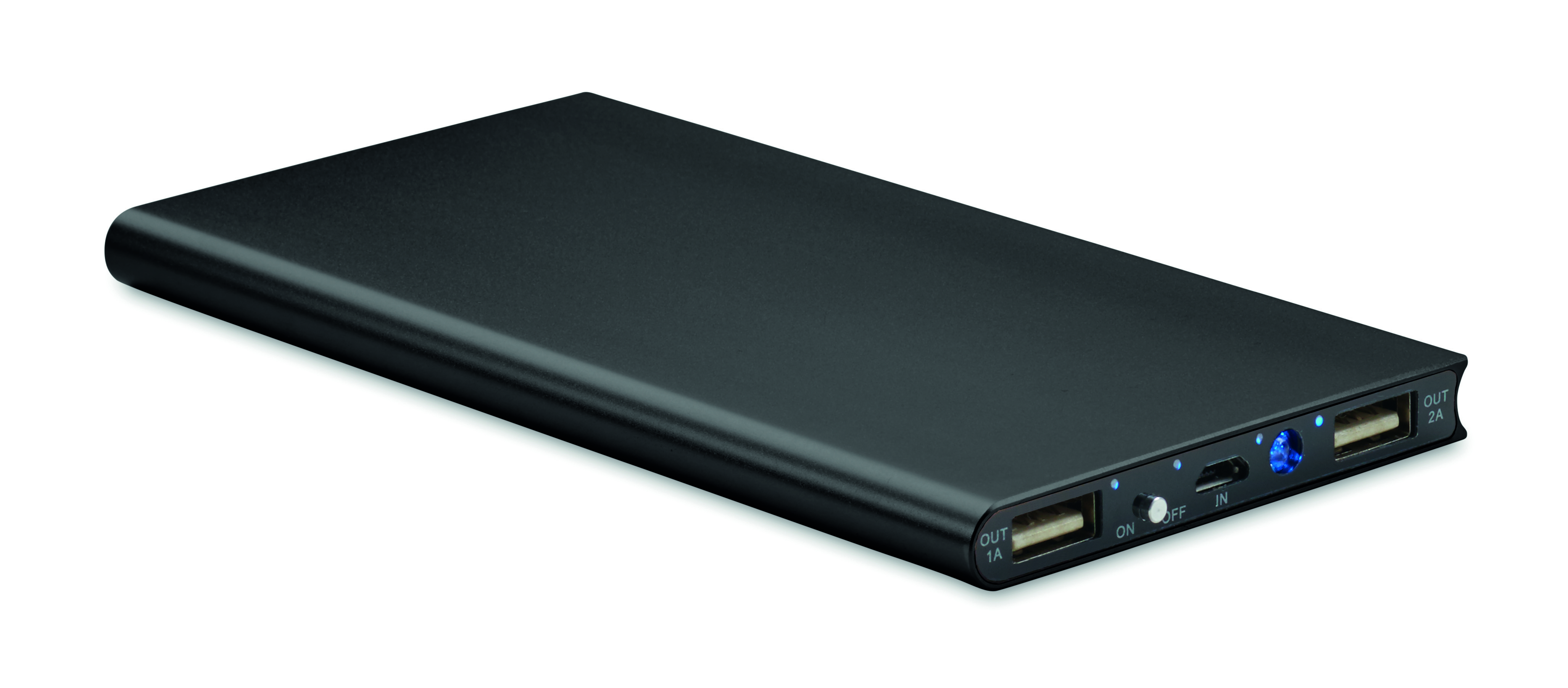 Power bank 8000 mAh wykonany z aluminium. Nadaje się do ładowania smartfonów, dane prądu wyjściowego DC5V/1A i DC5V/2A. Zawiera wskaźnik LED i kabel USB z wtyczką micro USB.