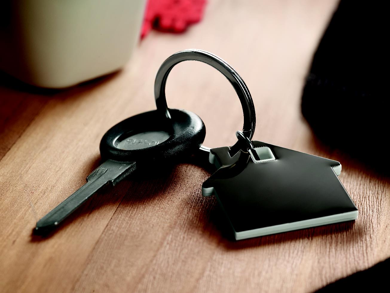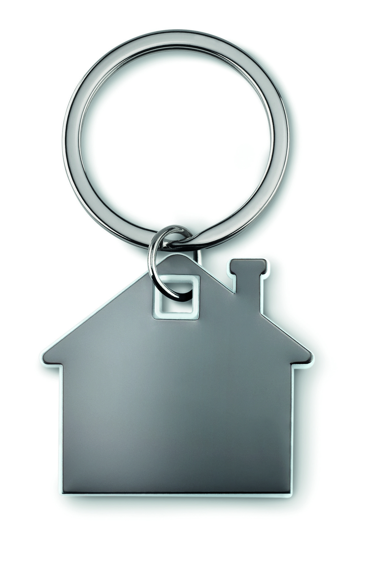 Brelok na klucze w kształcie domku, wykonany ze stali nierdzewnej oraz ABS.