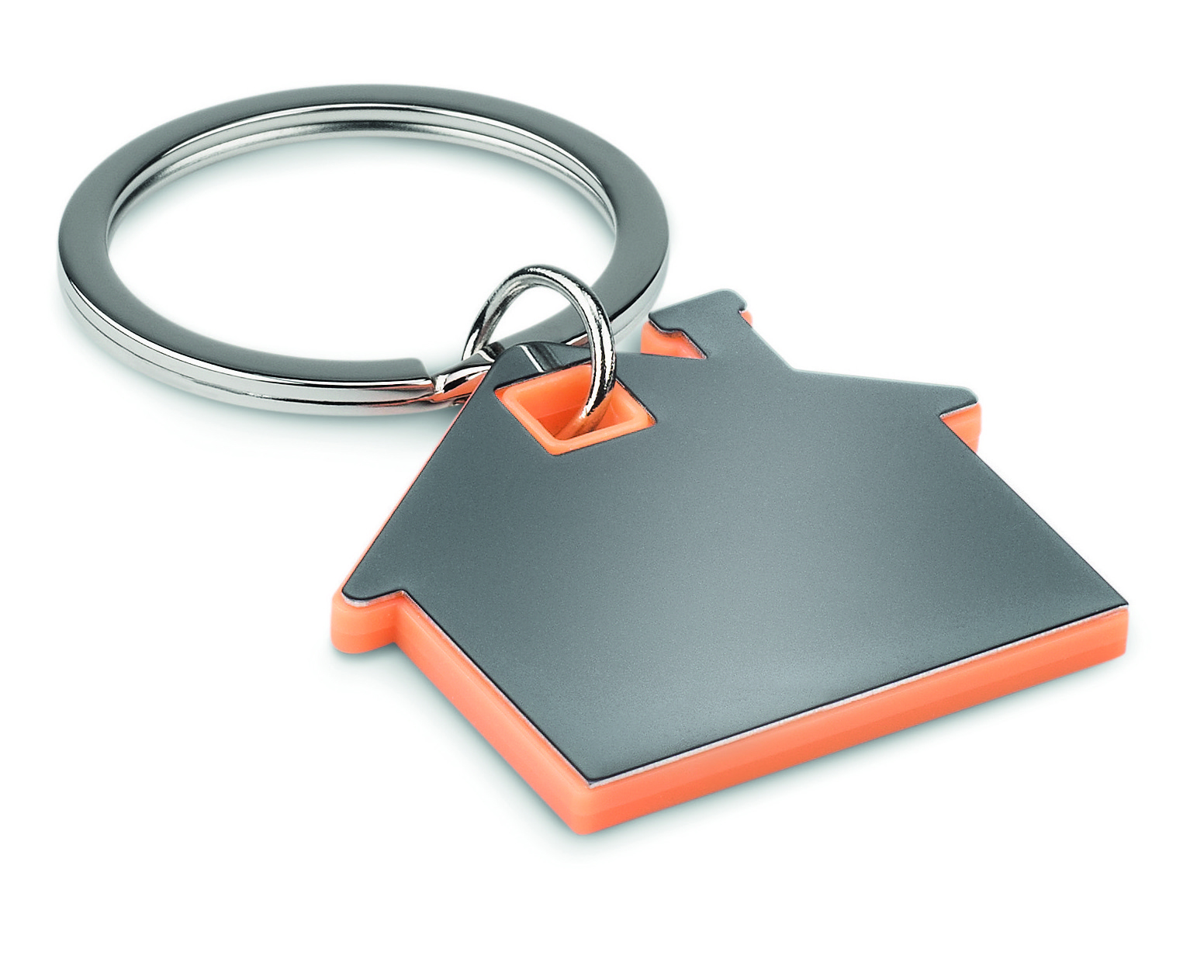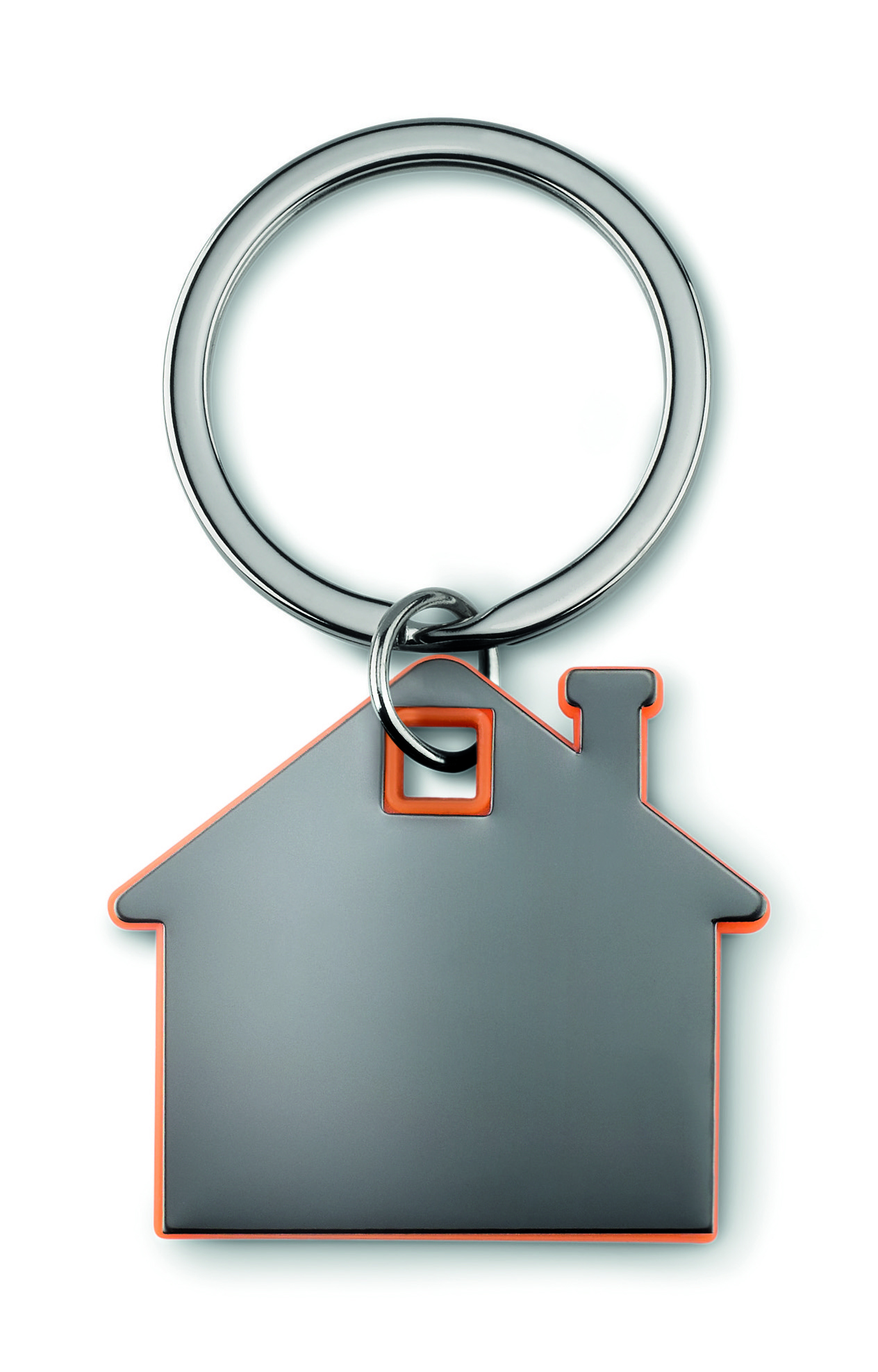 Brelok na klucze w kształcie domku, wykonany ze stali nierdzewnej oraz ABS.