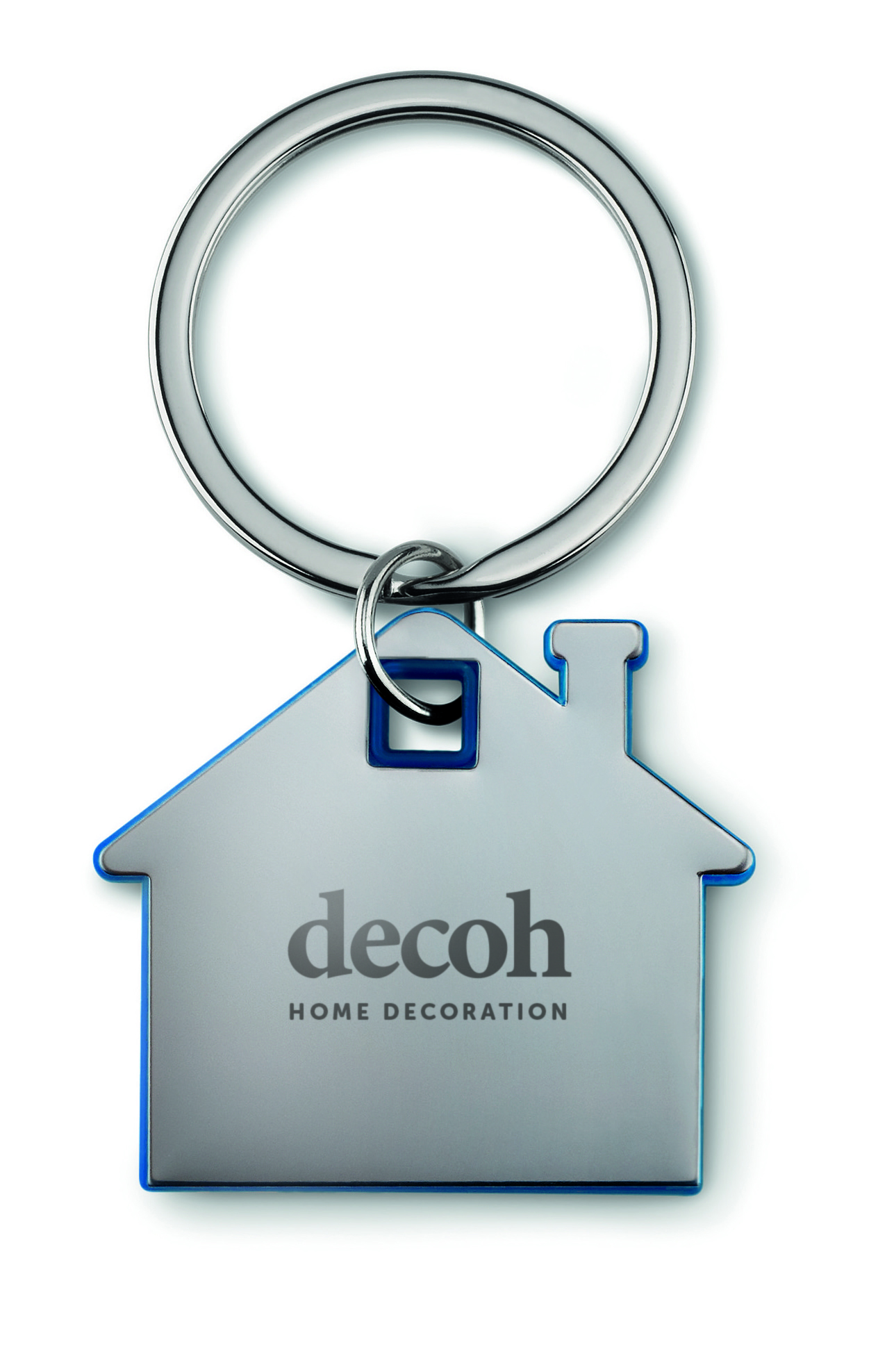 Brelok na klucze w kształcie domku, wykonany ze stali nierdzewnej oraz ABS.
