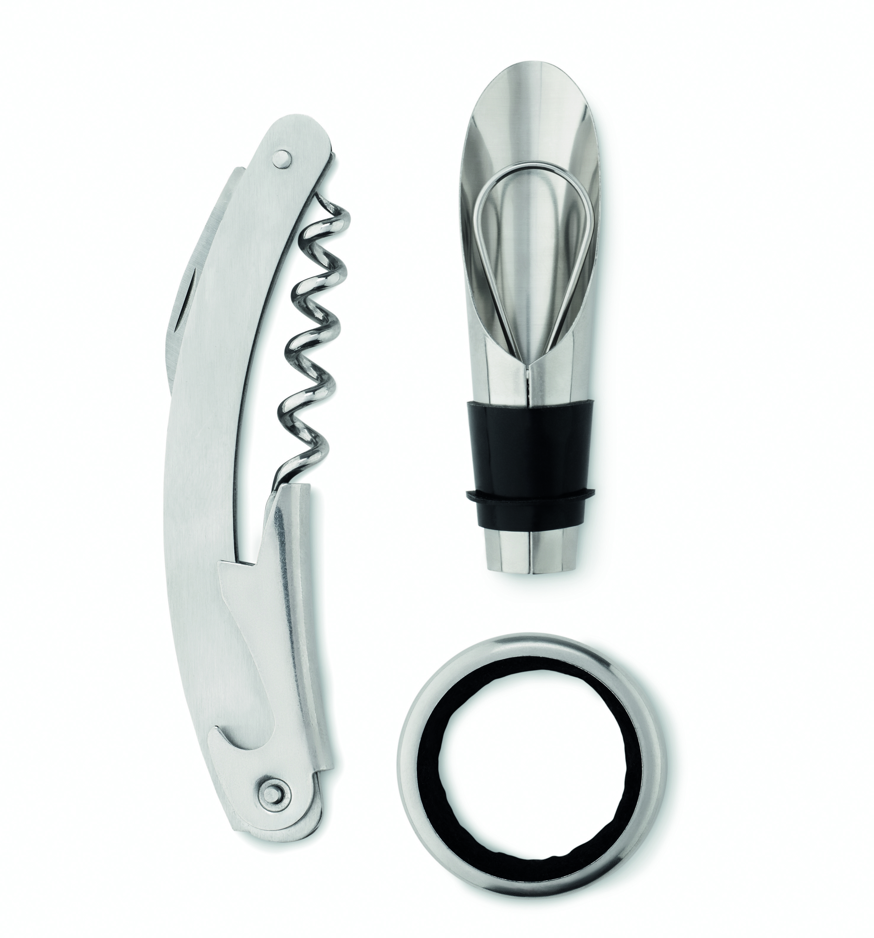 Zestaw do wina zapakowany w pudełko w kształcie butelki, składający się z korka do wina, korkociągu oraz okapnika. Magnetyczne zapięcie.