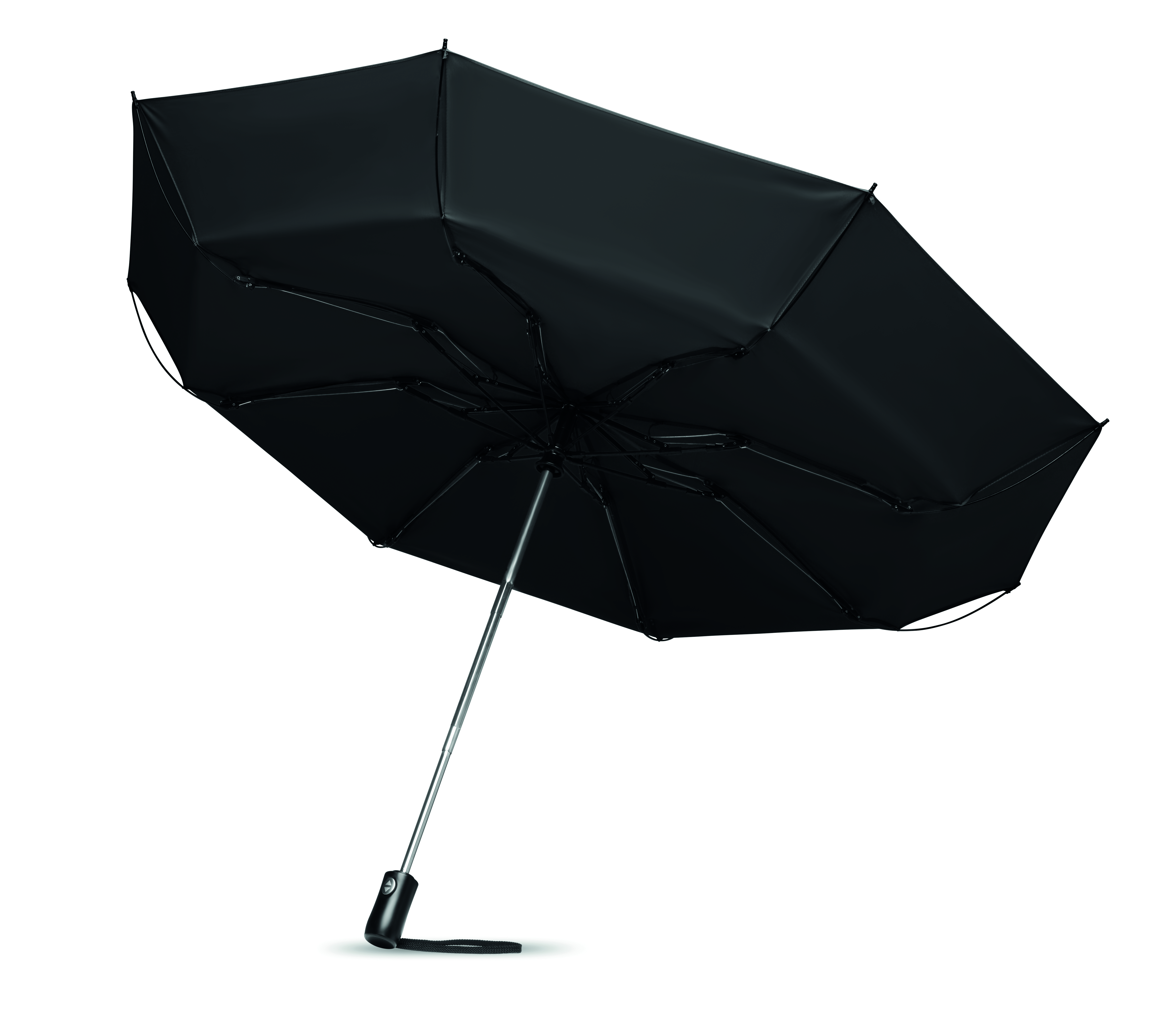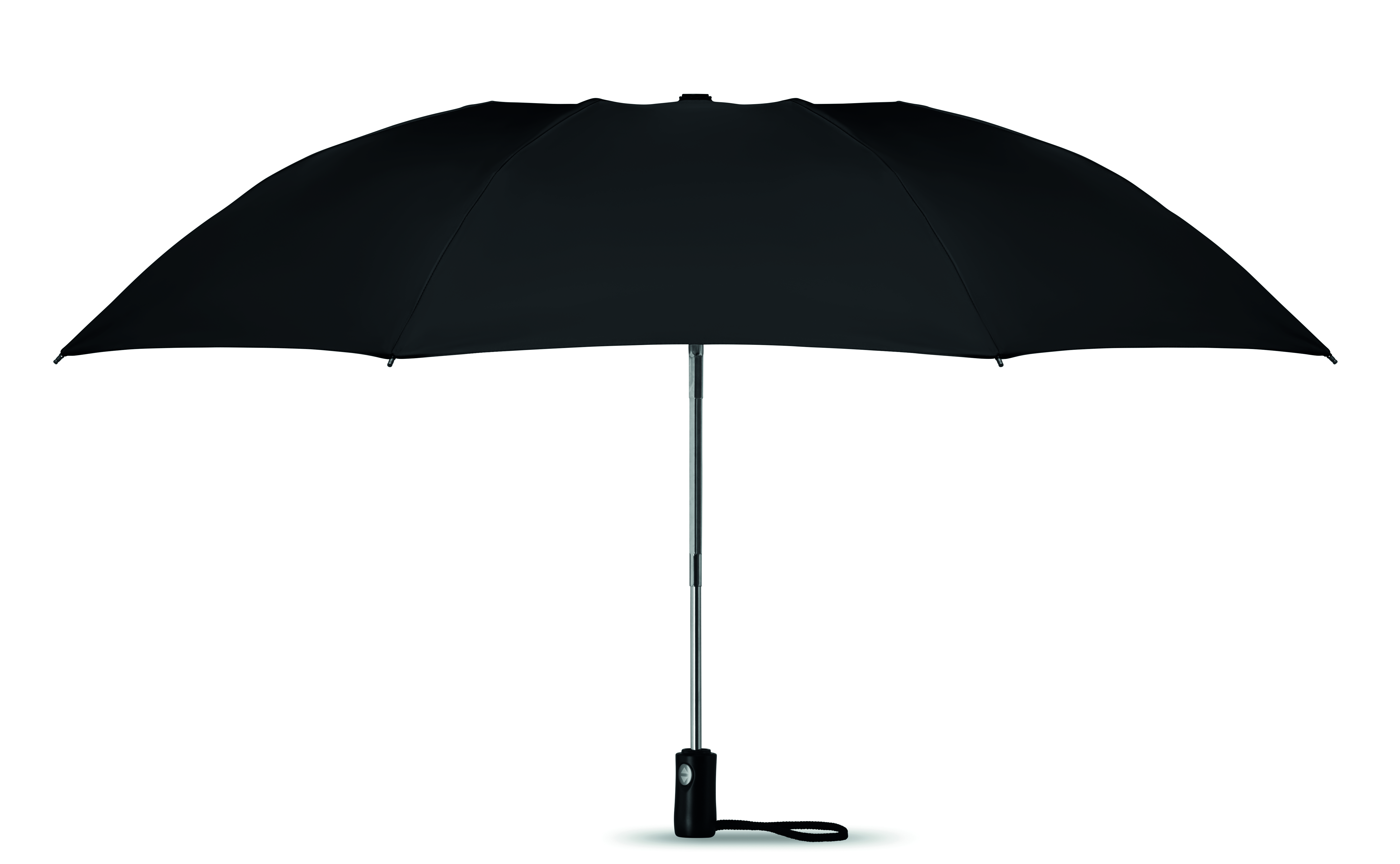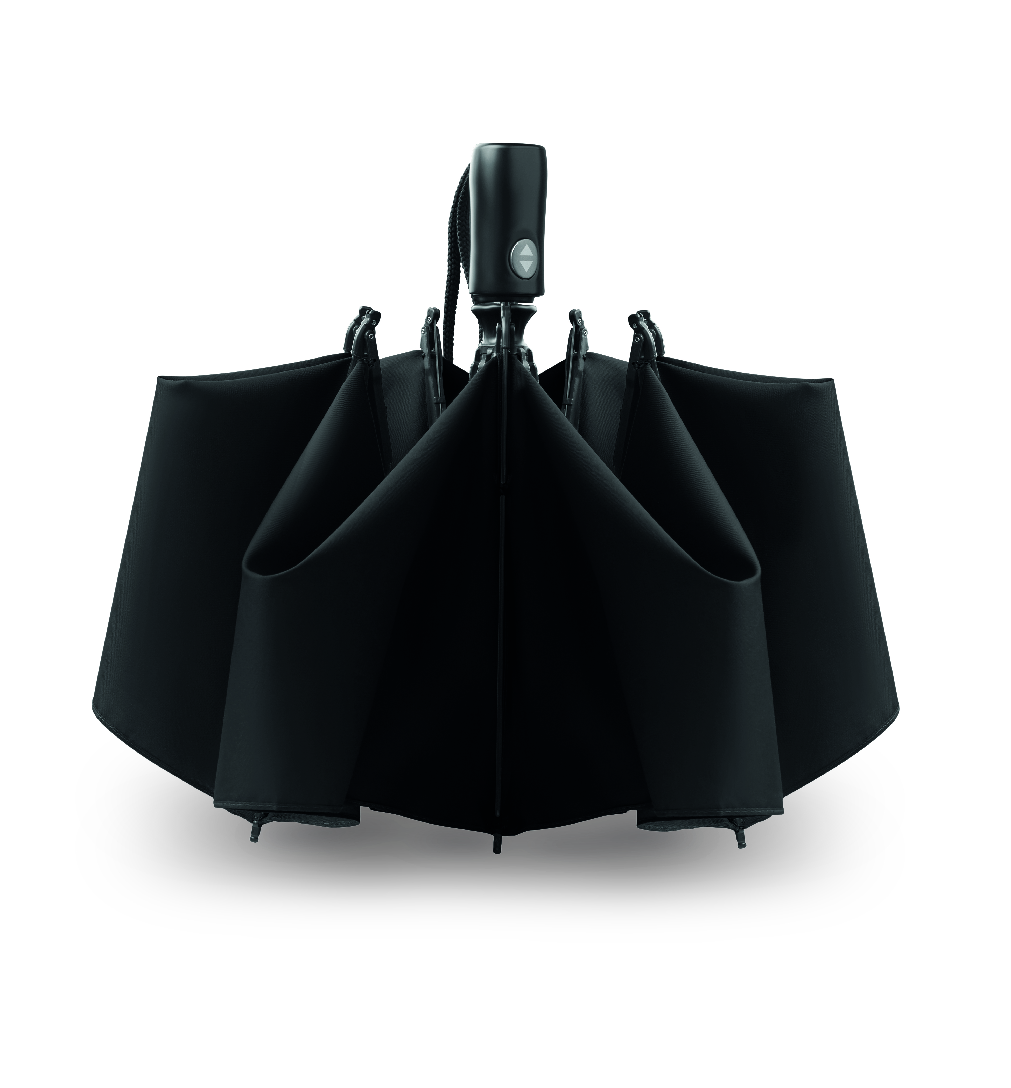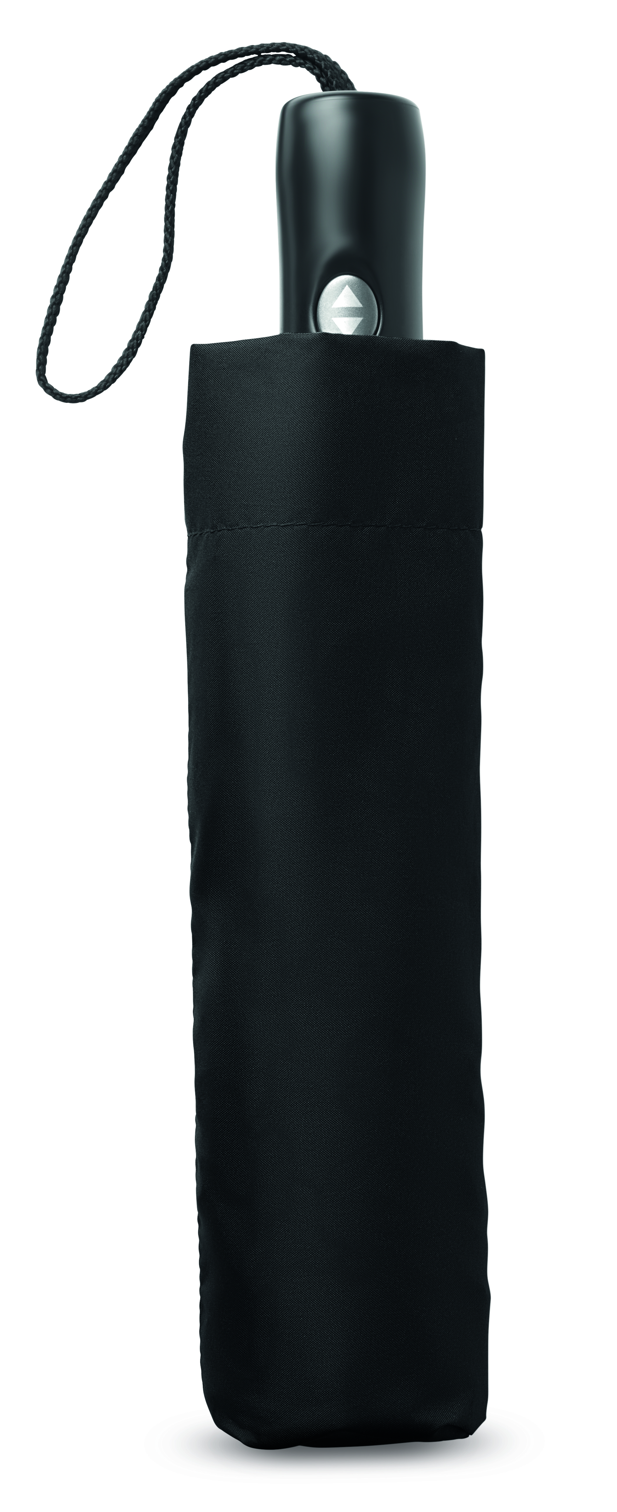 3-krotnie składany parasol 23'' z materiału 190T pongee, automatycznie otwierany/zamykany. Stalowy, chromowany trzon, żebra z włókna szklanego. Czarna rączka z ABS z przyciskiem. Dopasowany pokrowiec.