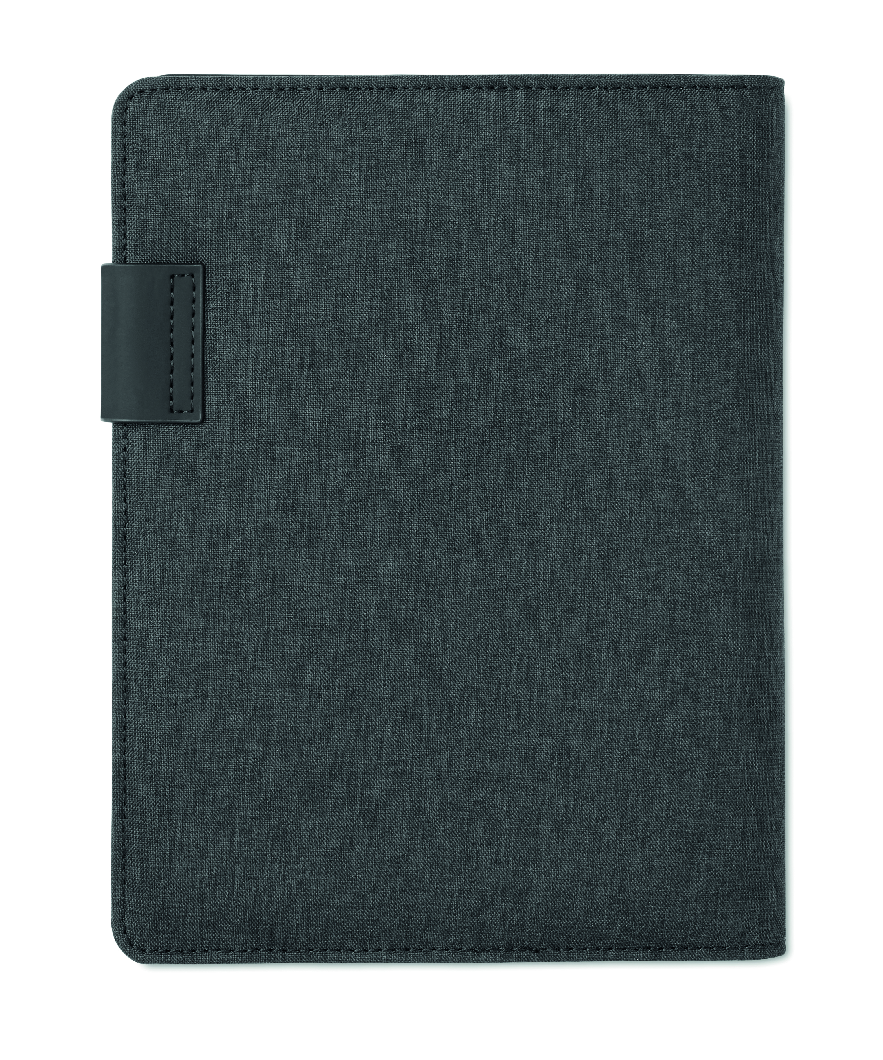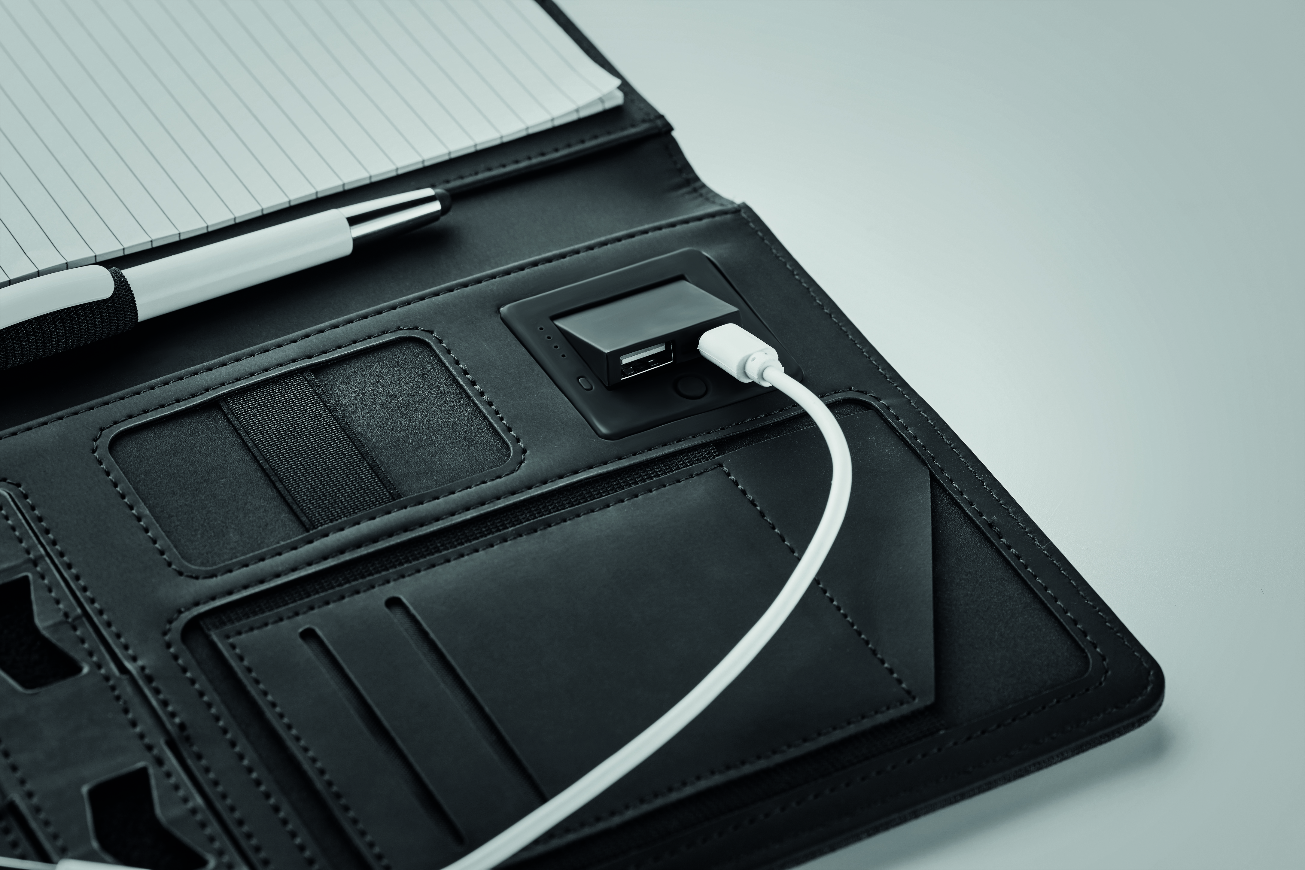 Teczka konferencyjna A5 z okładką z płótna PU. Powerbank o pojemności 4000 mAh. Wbudowane złącze micro USB do złącza typu C. Notatnik z 20 kartkami w linie. Wiele wewnętrznych przegródek. Zamknięcie magnetyczne. Elastyczny uchwyt na długopis.