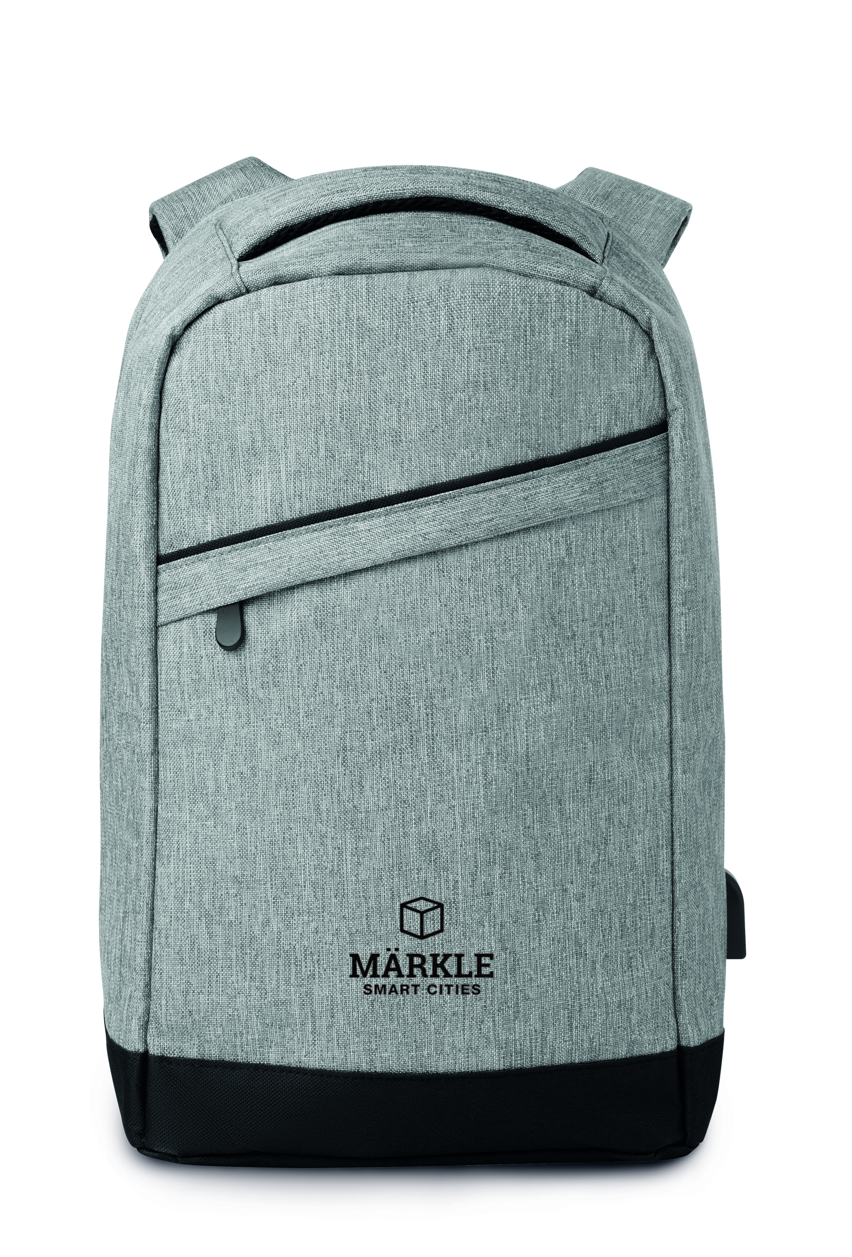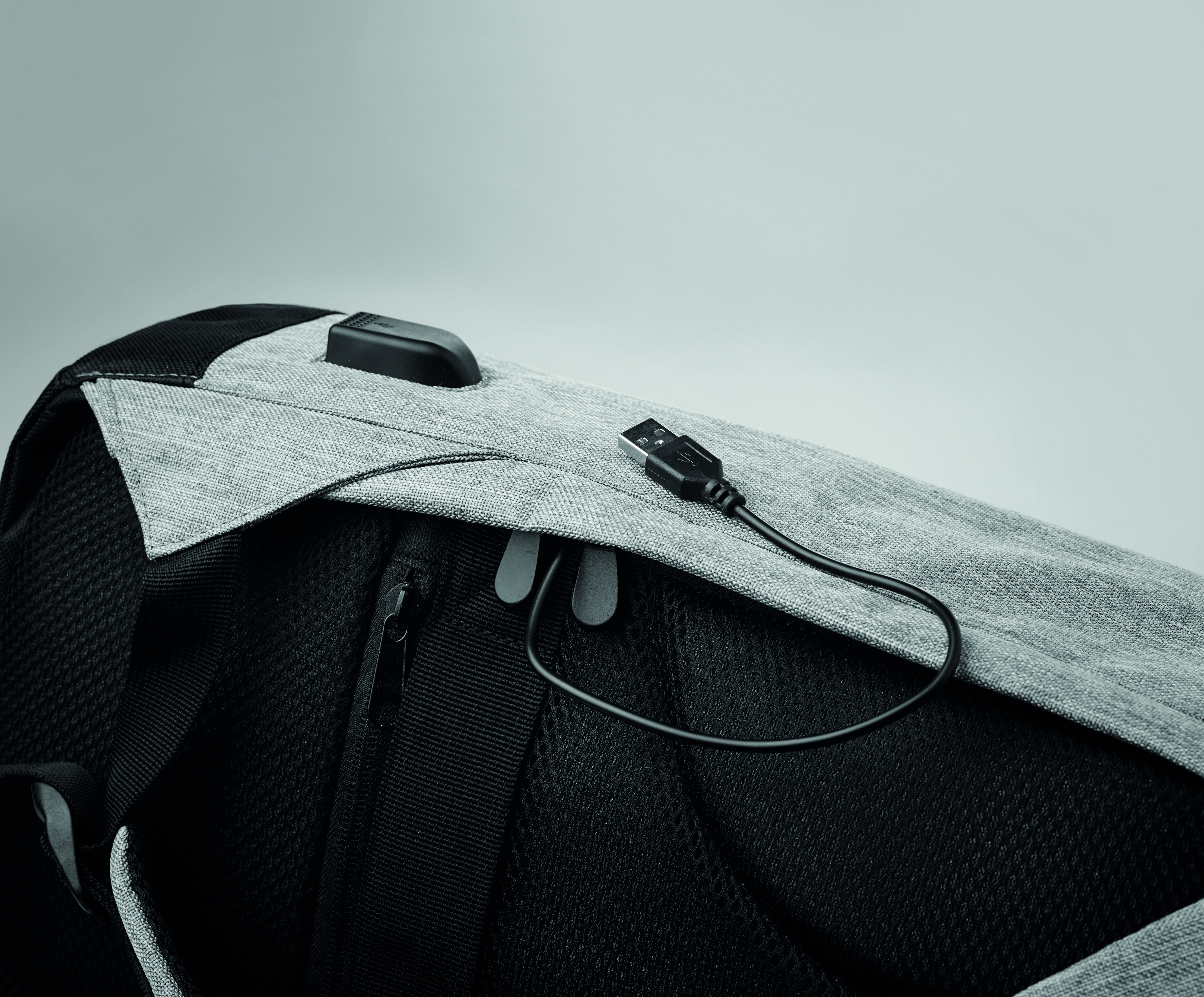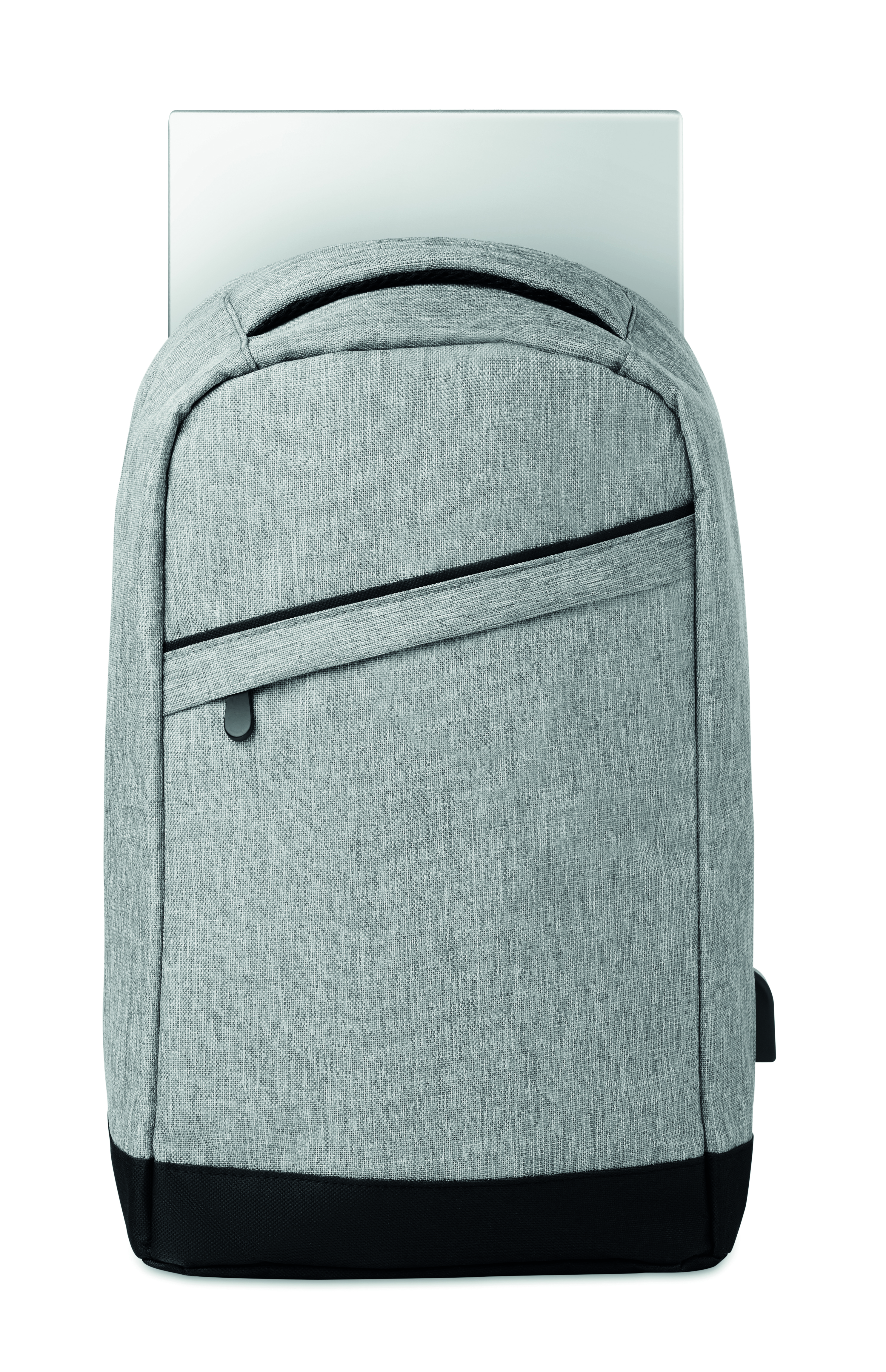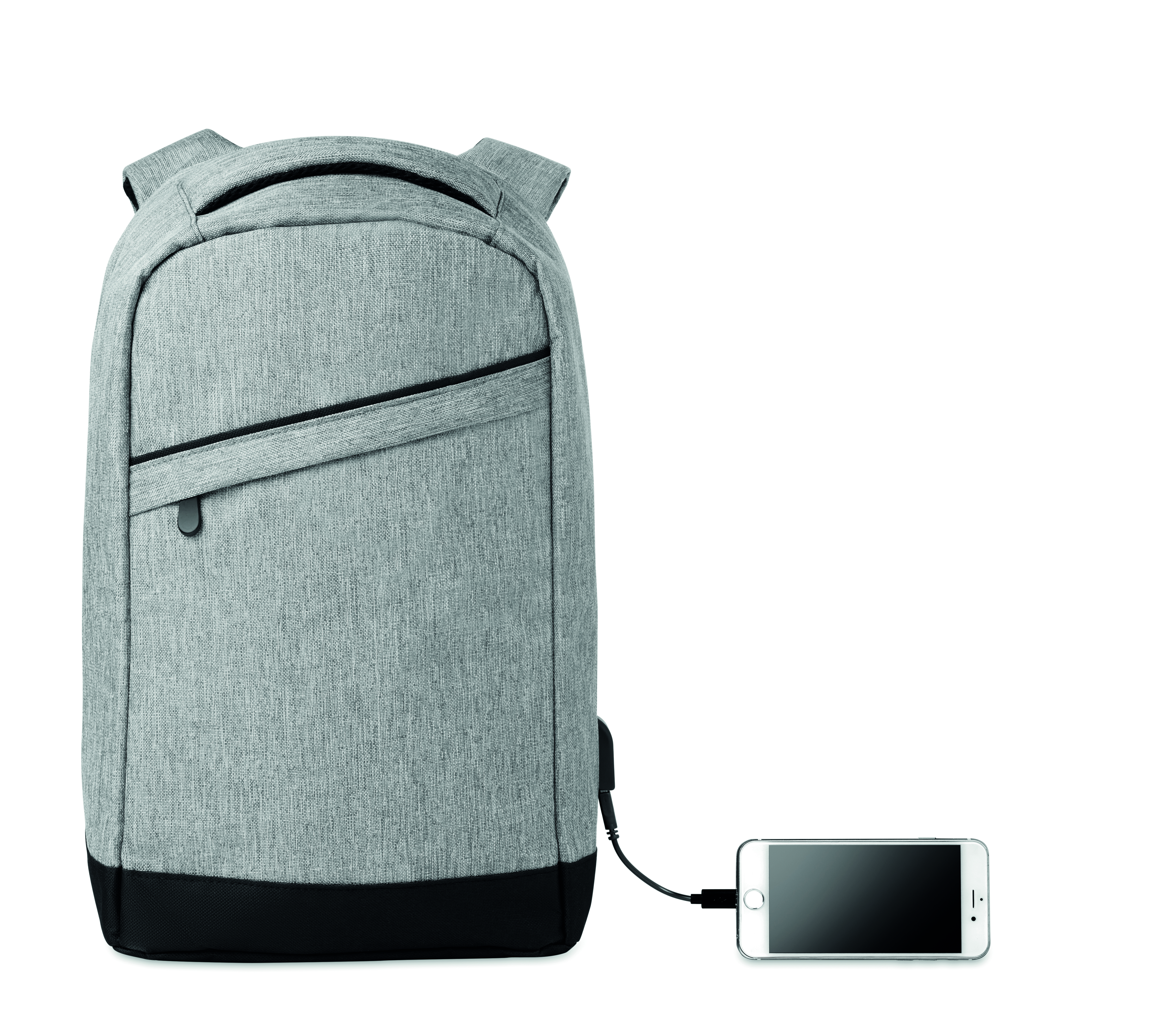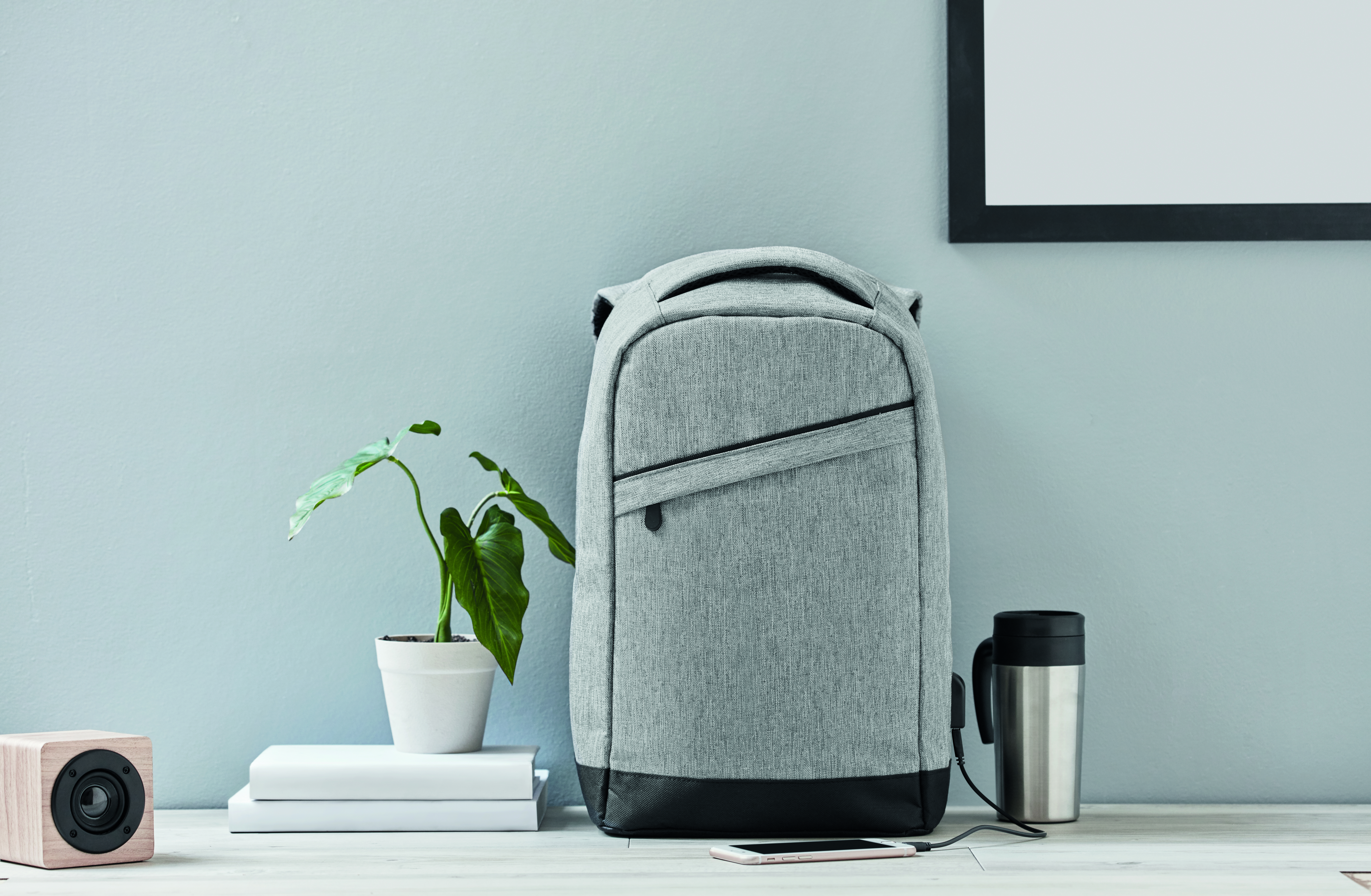 Plecak z poliestru 600D. Wyściełane paski na ramiona, wewnątrz jedna główna przegroda na laptop 13 inch oraz kabel ładujący USB. Sposób umieszczenia zamka chroni przed kradzieżą.