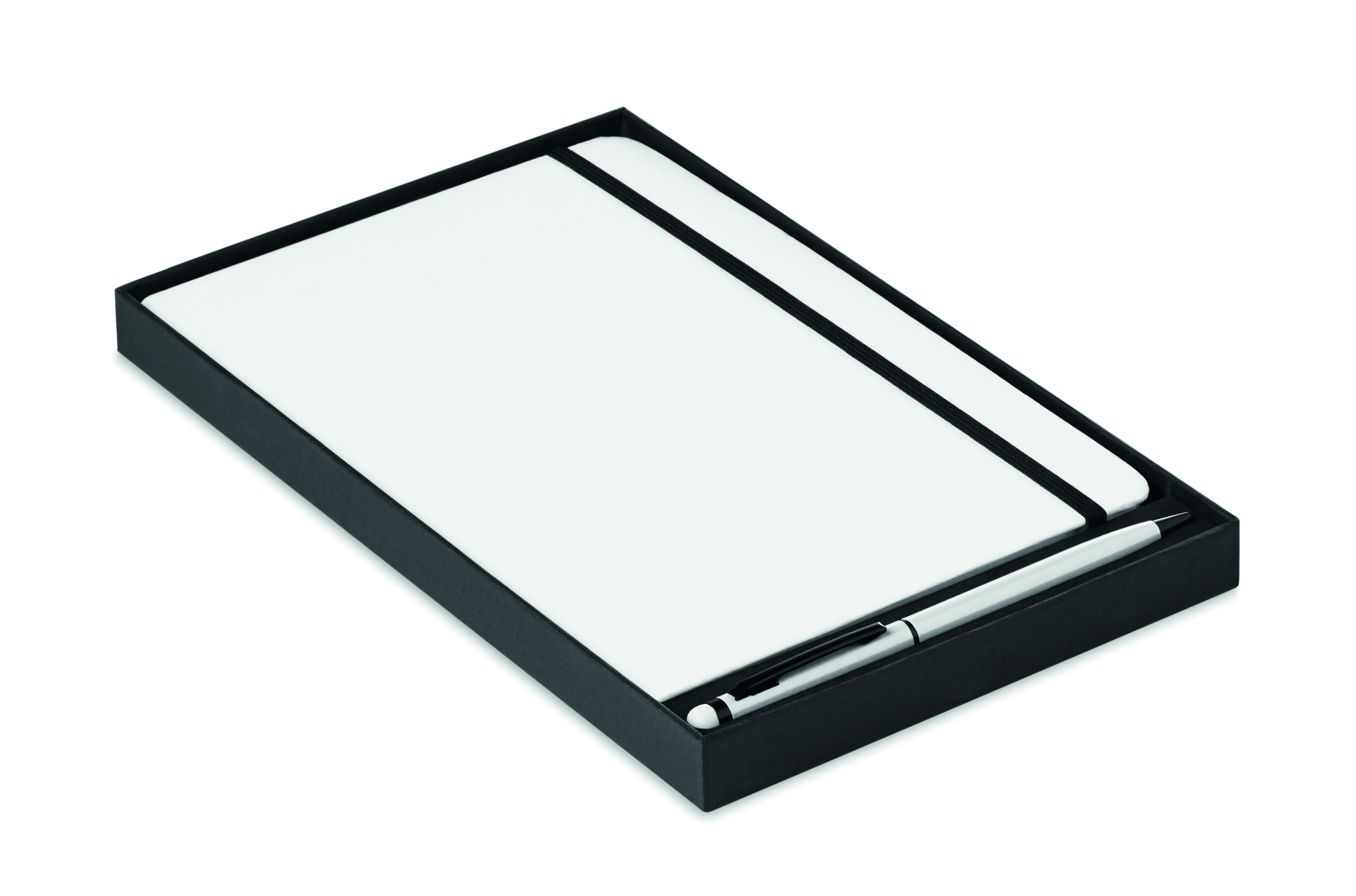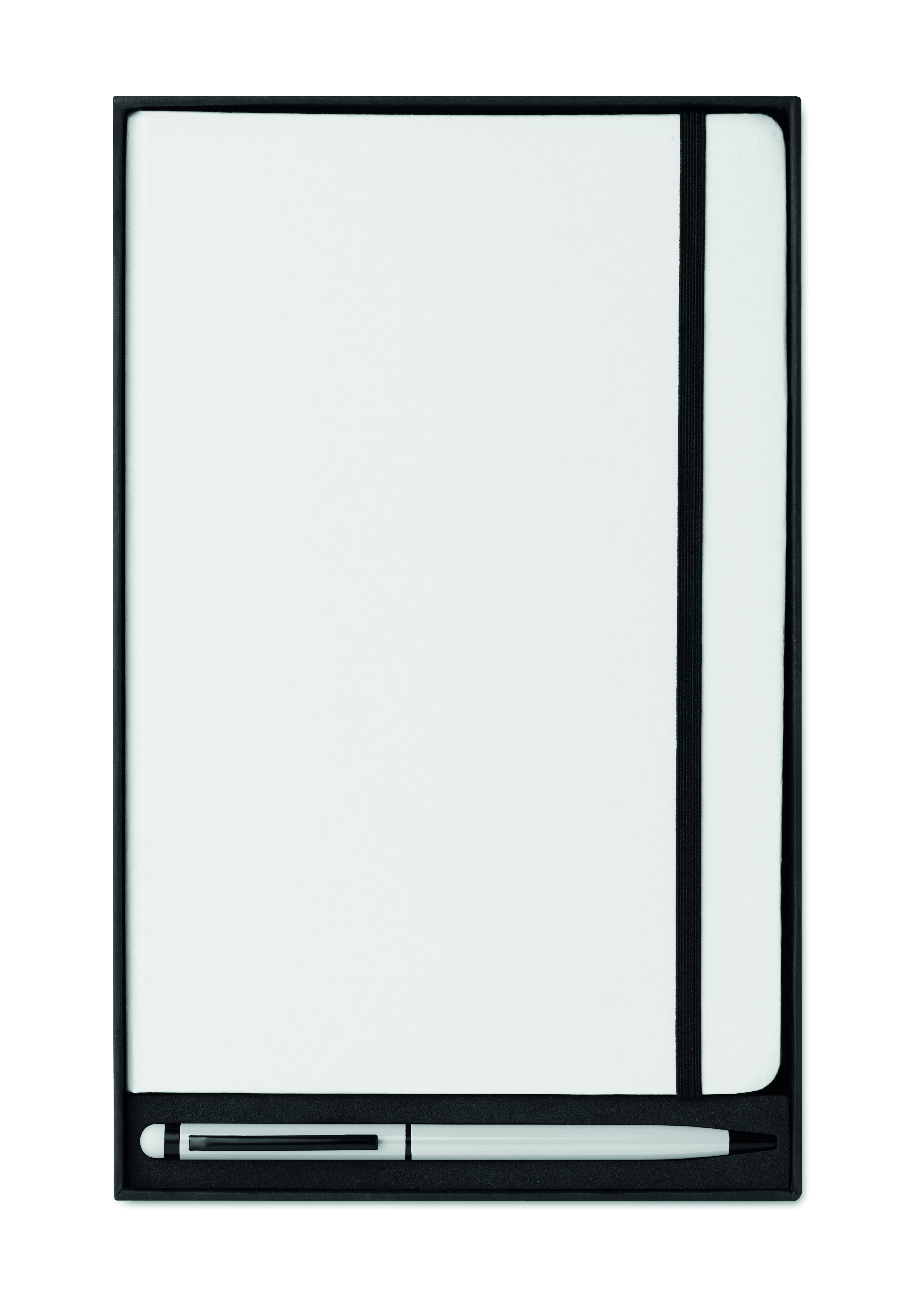 Notes A5 z długopisem z rysikiem 2 w 1. Twarda okładka. 144 strony w linie (72 kartki). Pasujący długopis z rysikiem do ekranów dotykowych. Niebieski tusz. Dopasowany elastyczny pasek zamykający i zakładka z tasiemki. FSC MIX CREDIT | P7.1 | FSC-C213206
