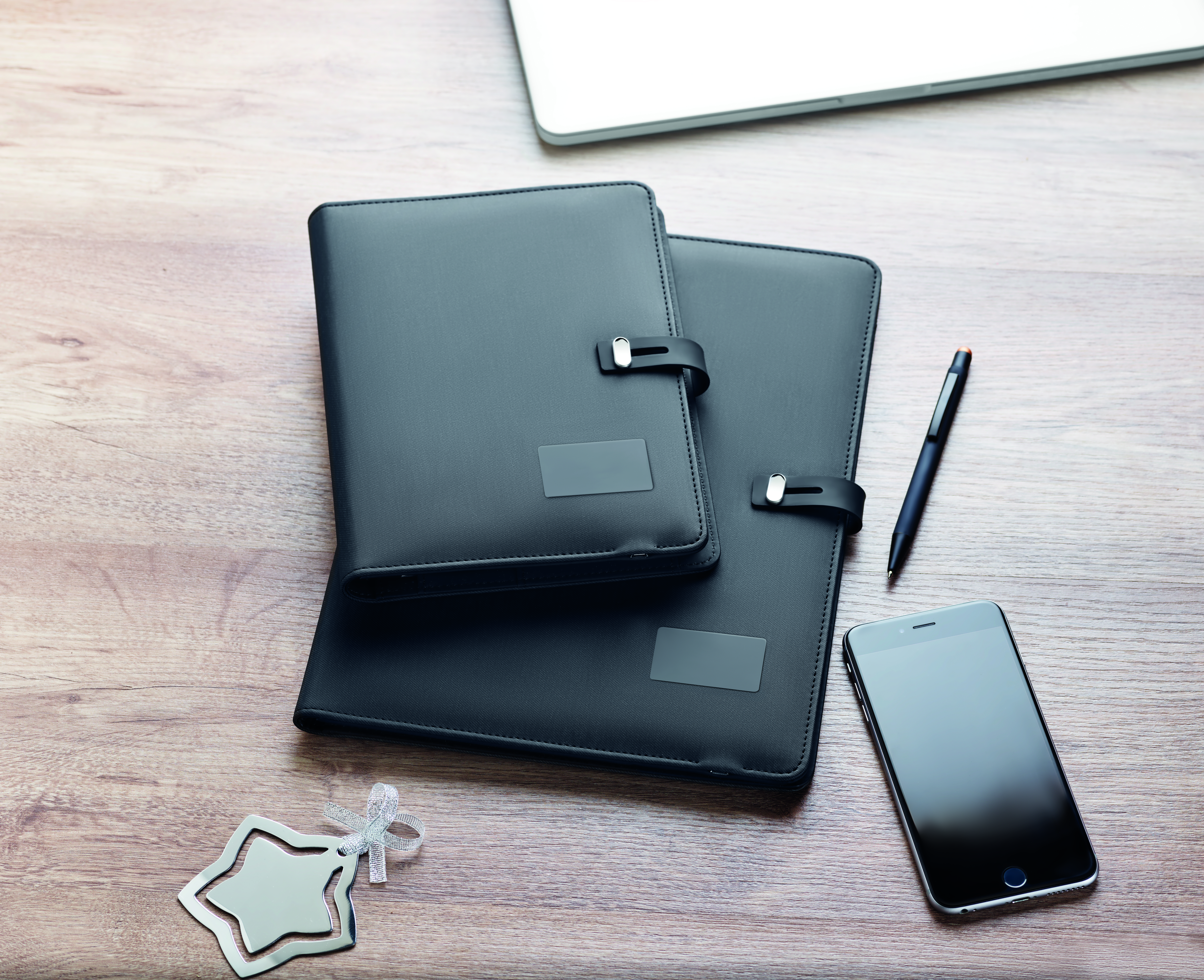 Teczka A4 z wykończeniem lniano-PU, z zamknięciem, zamykana na zatrzask. Ładowanie bezprzewodowe DC5V/1A. Power bank o pojemności 4000 mAh z łączem micro USB na złącze typu C. Notes z 20 kartkami w linie. Zawiera uchwyt na karty oraz uchwyt na długopis. Czarna aluminiowa płytka idealna do umieszczenia logo.
