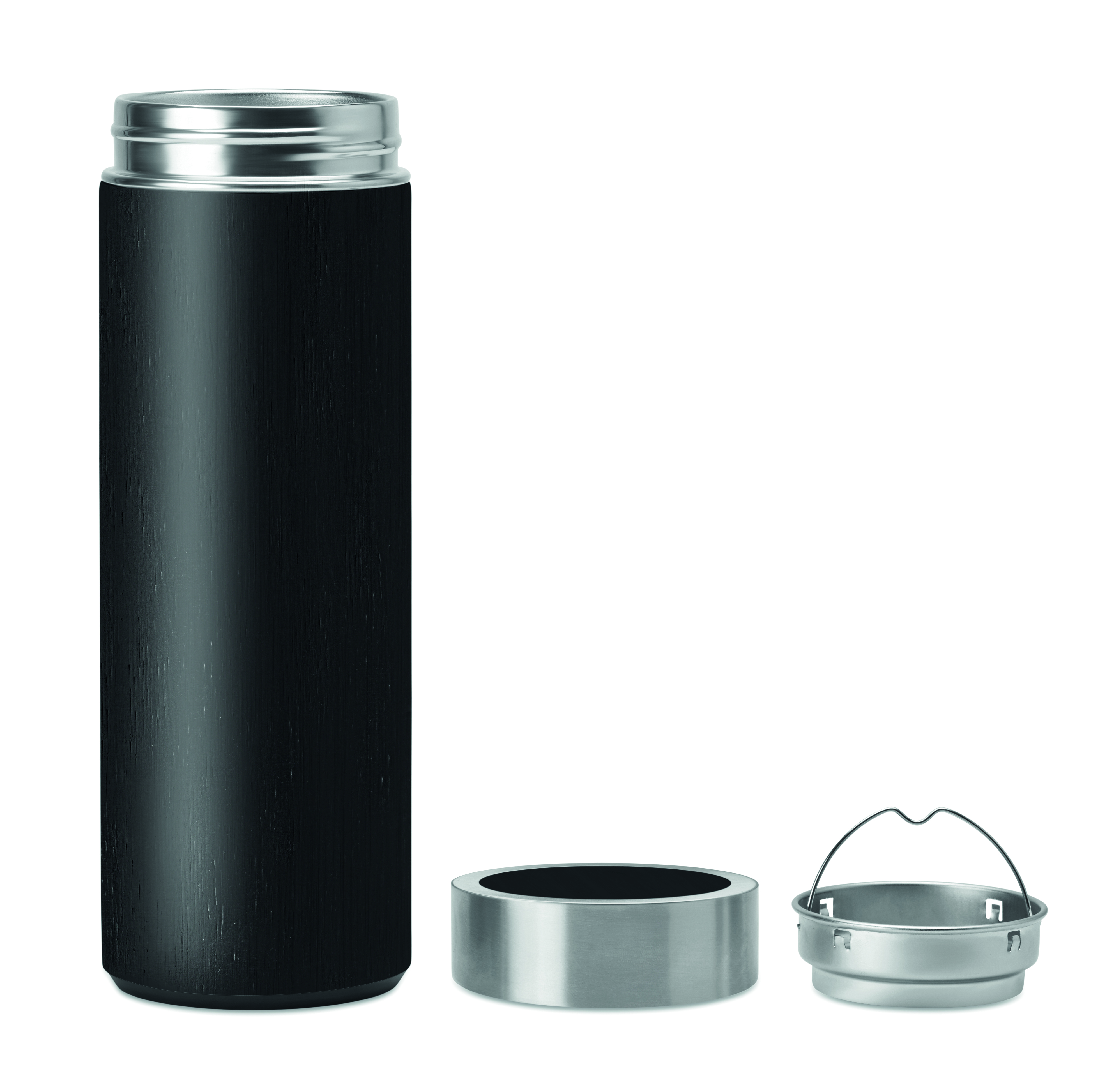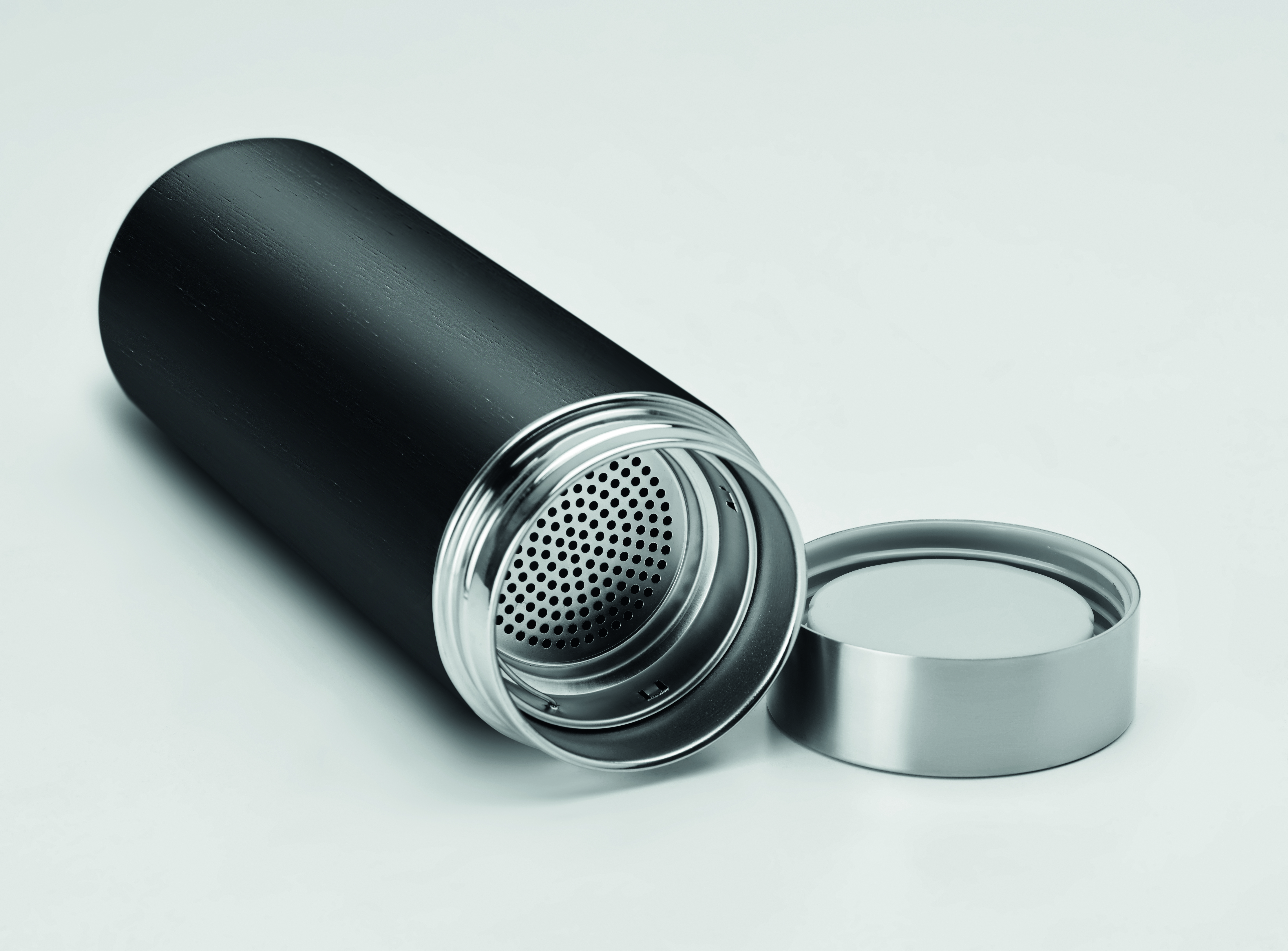 Termos z podwójnymi ściankami, stal nierdzewna z bambusową obudową, 400 ml, z dodatkowym zaparzaczem do herbaty. Ponieważ bambus jest materiałem naturalnym, kolory poszczególnych produktów mogą się różnić. Bambus jest produktem naturalnym, dlatego mogą wystąpić nieznaczne różnice w kolorze, wzorze i rozmiarze. FSC®-certified | FSC 100%, N5.7, FSC-C213206