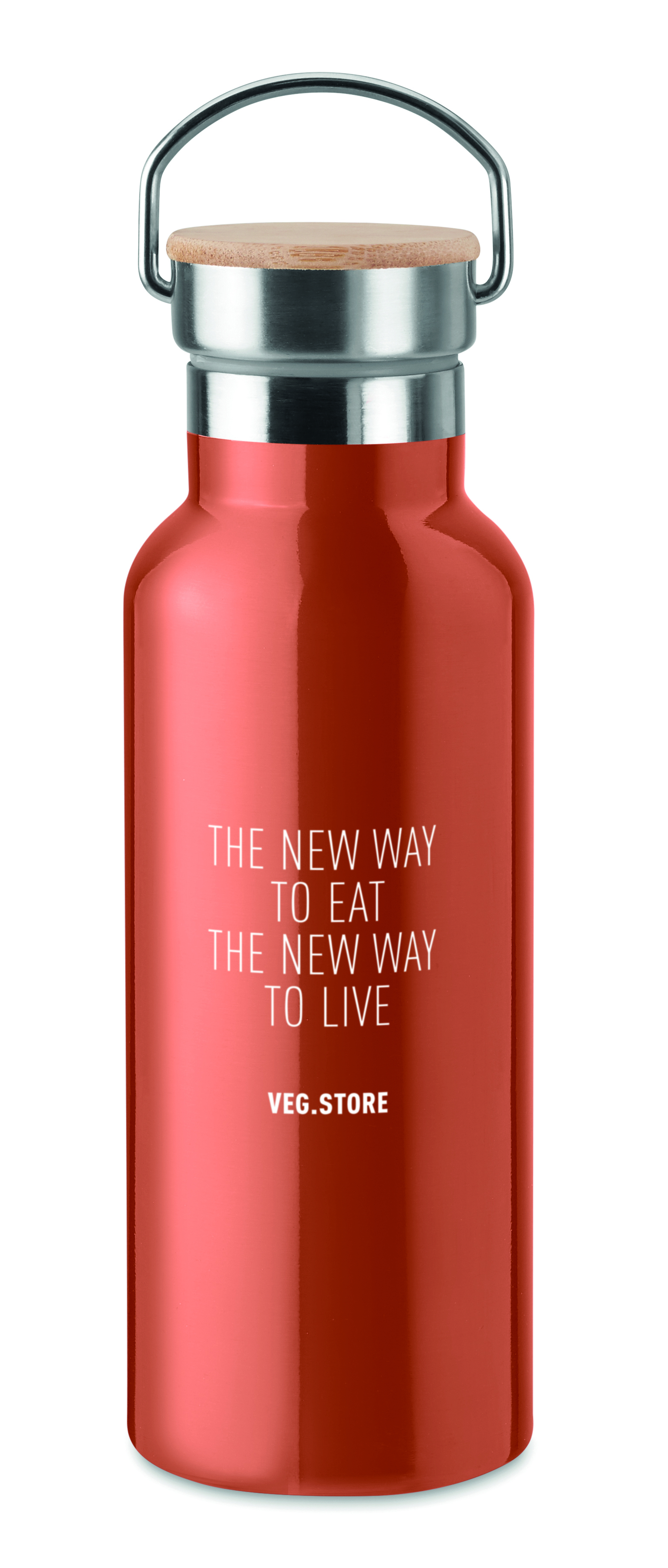 Termos ze stali nierdzewnej z podwójnymi ściankami, 500 ml. Pokrywka z bambusa, z uchwytem. Znakowanie sublimacją jest możliwe tylko na białych produktach. Szczelna. Bambus jest produktem naturalnym, dlatego mogą wystąpić nieznaczne różnice w kolorze, wzorze i rozmiarze.