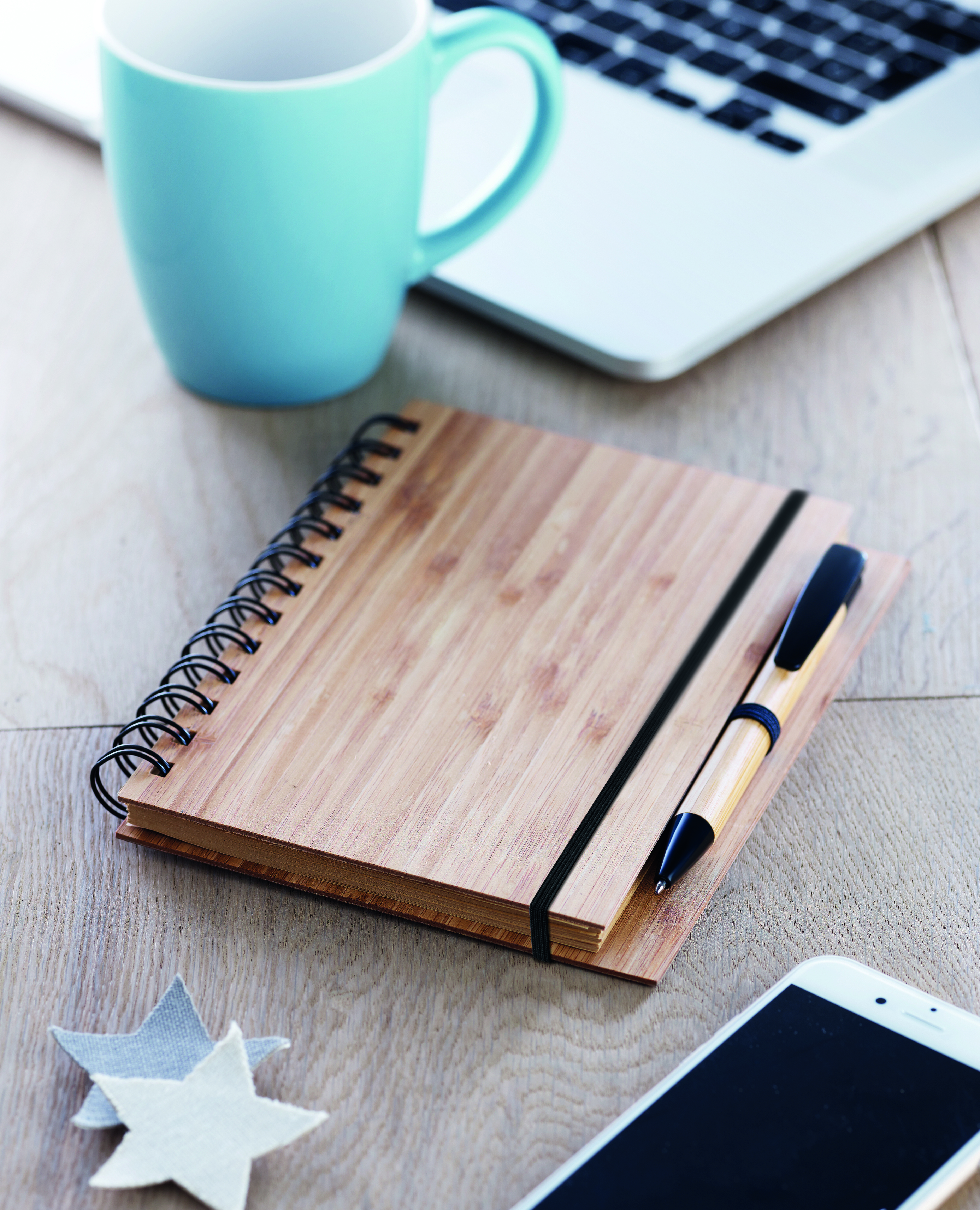 Notes w okładce bambusowej z dopasowanym długopisem. Podwójna spirala. 140 stron (70 kartek) czystego papieru z recyklingu. Dopasowany długopis z bambusowym korpusem i elementami z tworzywa ABS. Elastyczny uchwyt na długopis. Bambus jest produktem naturalnym, dlatego mogą wystąpić nieznaczne różnice w kolorze, wzorze i rozmiarze. FSC®-certified | FSC 100%, N5.7, FSC-C213206