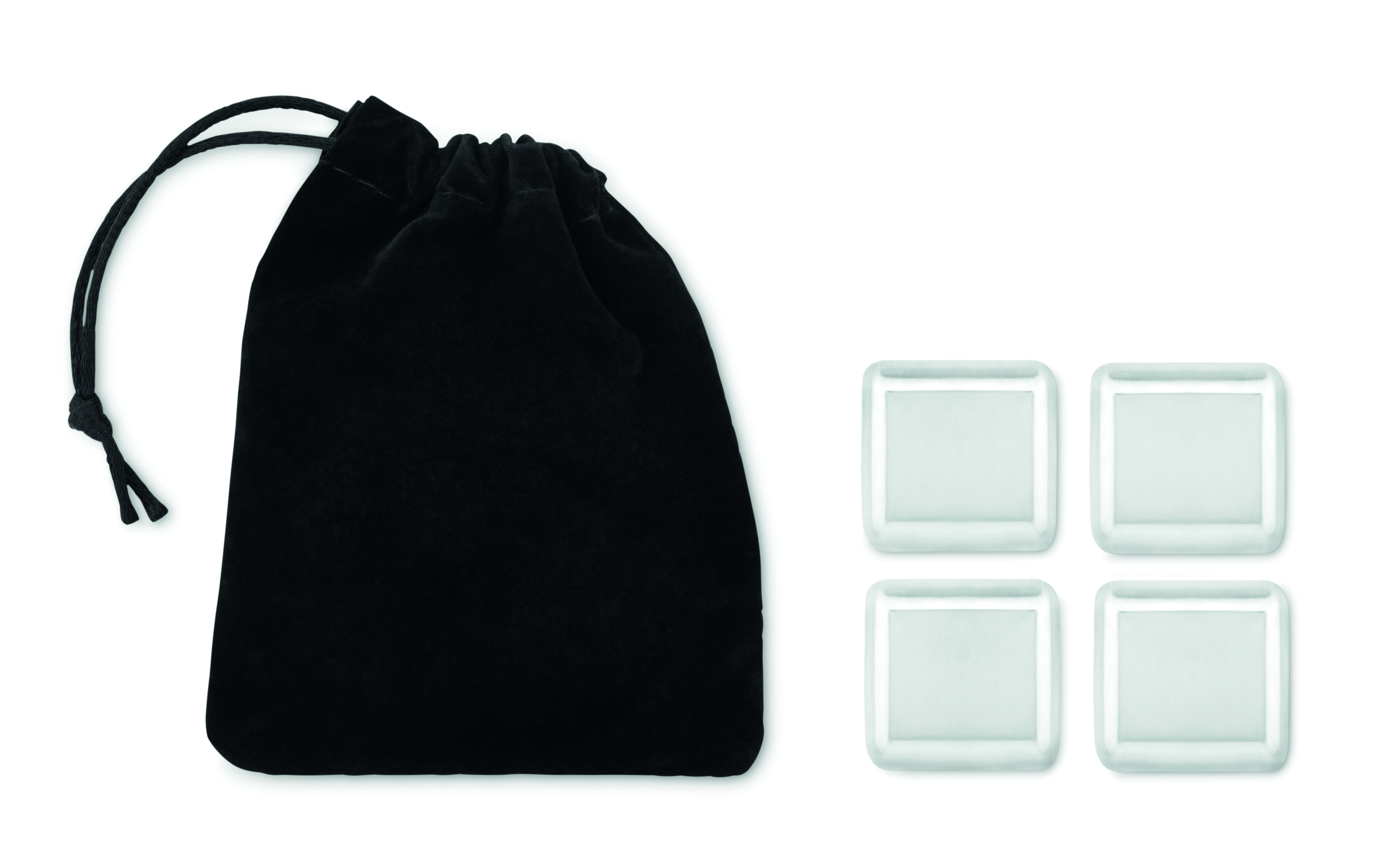 Zestaw 4 kostek do lodu wielokrotnego użytku ze stali nierdzewnej, w aksamitnym etui.