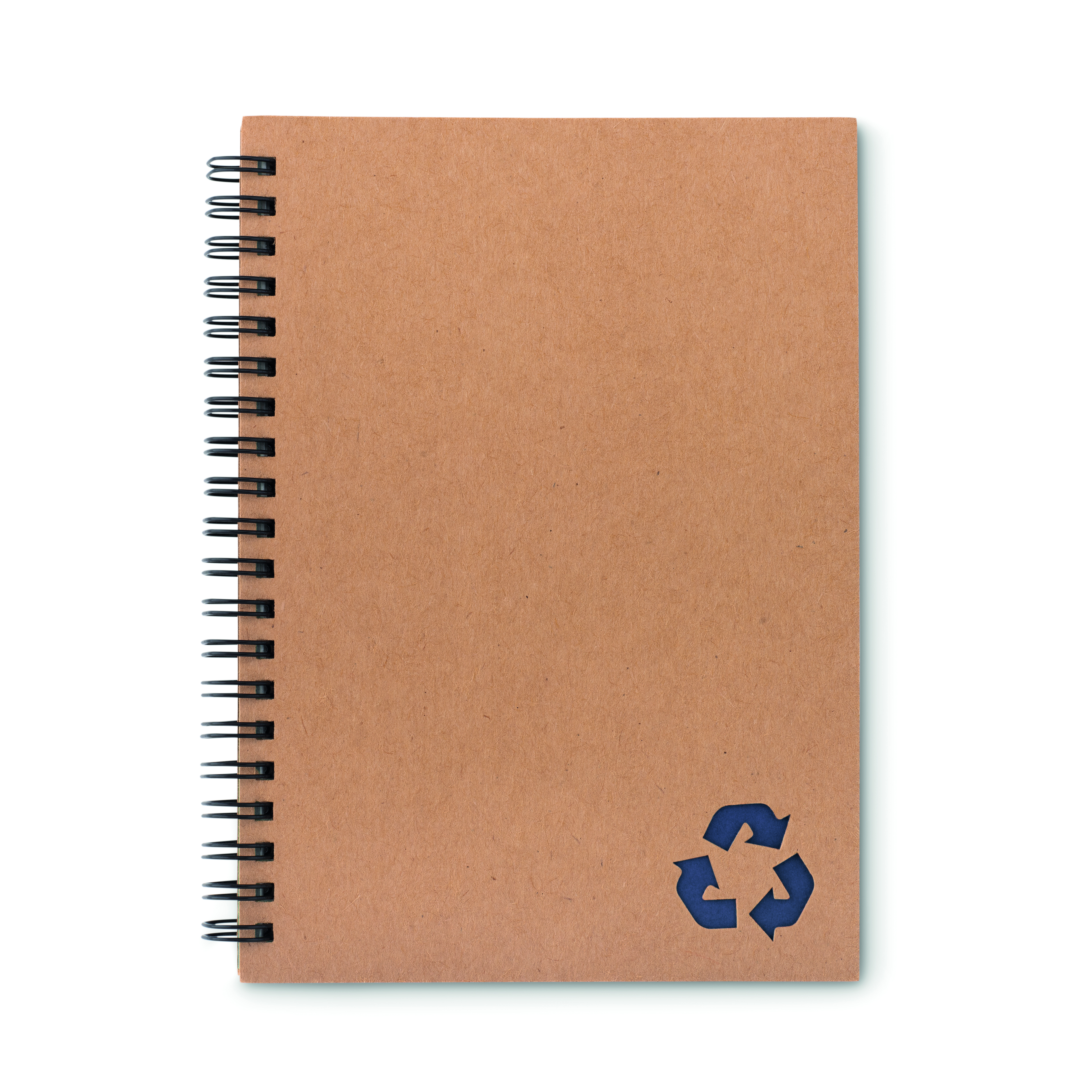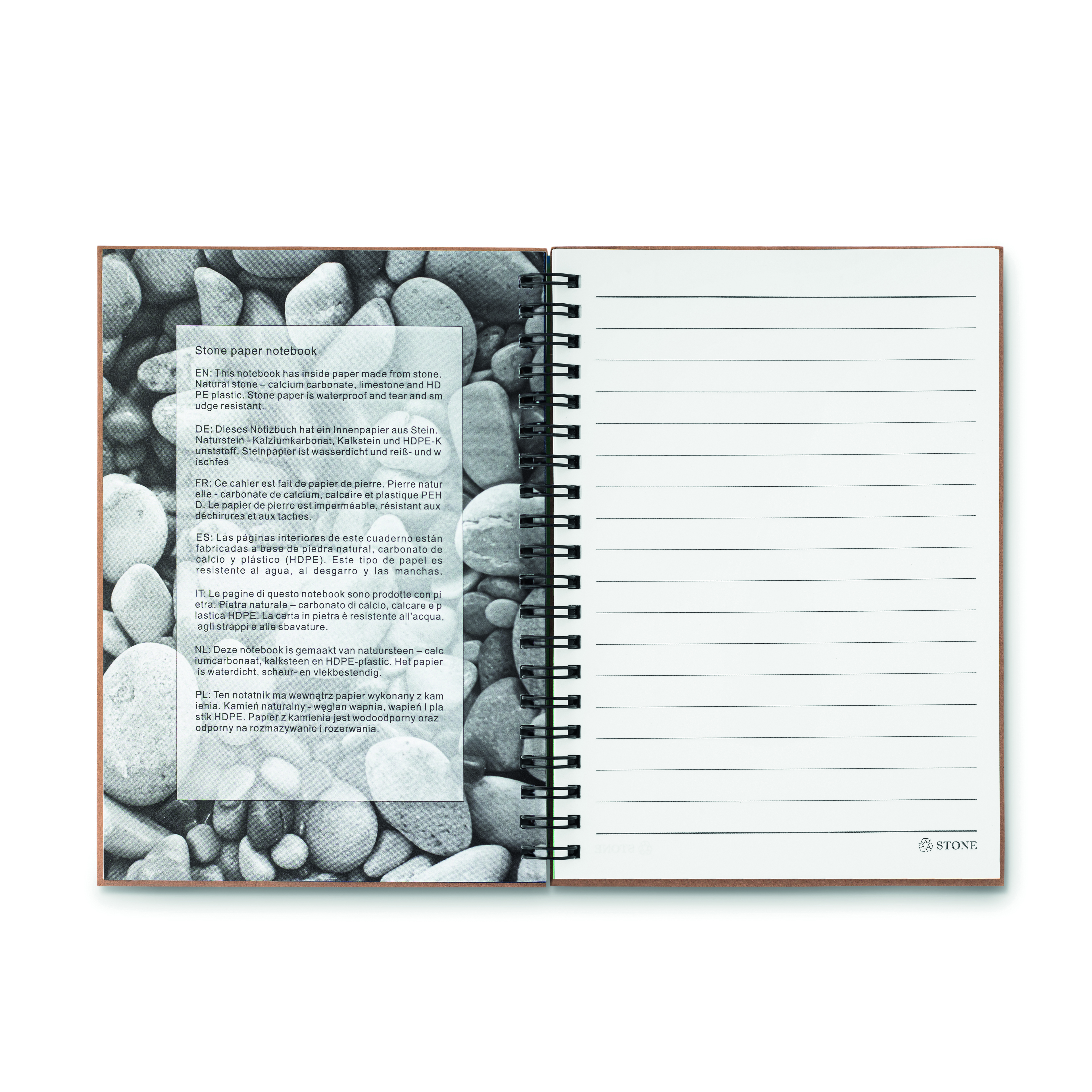 Notatnik z okładką z kartonu z recyklingu. Podwójna spirala. 140 stron w linie z papieru mineralnego (70 arkuszy). Papier mineralny jest wykonany z węglanu wapnia i HDPE (żywicy polietylenowej) stosowanej jako spoiwo. Jest wodoodporny i odporny na tłuszcz.