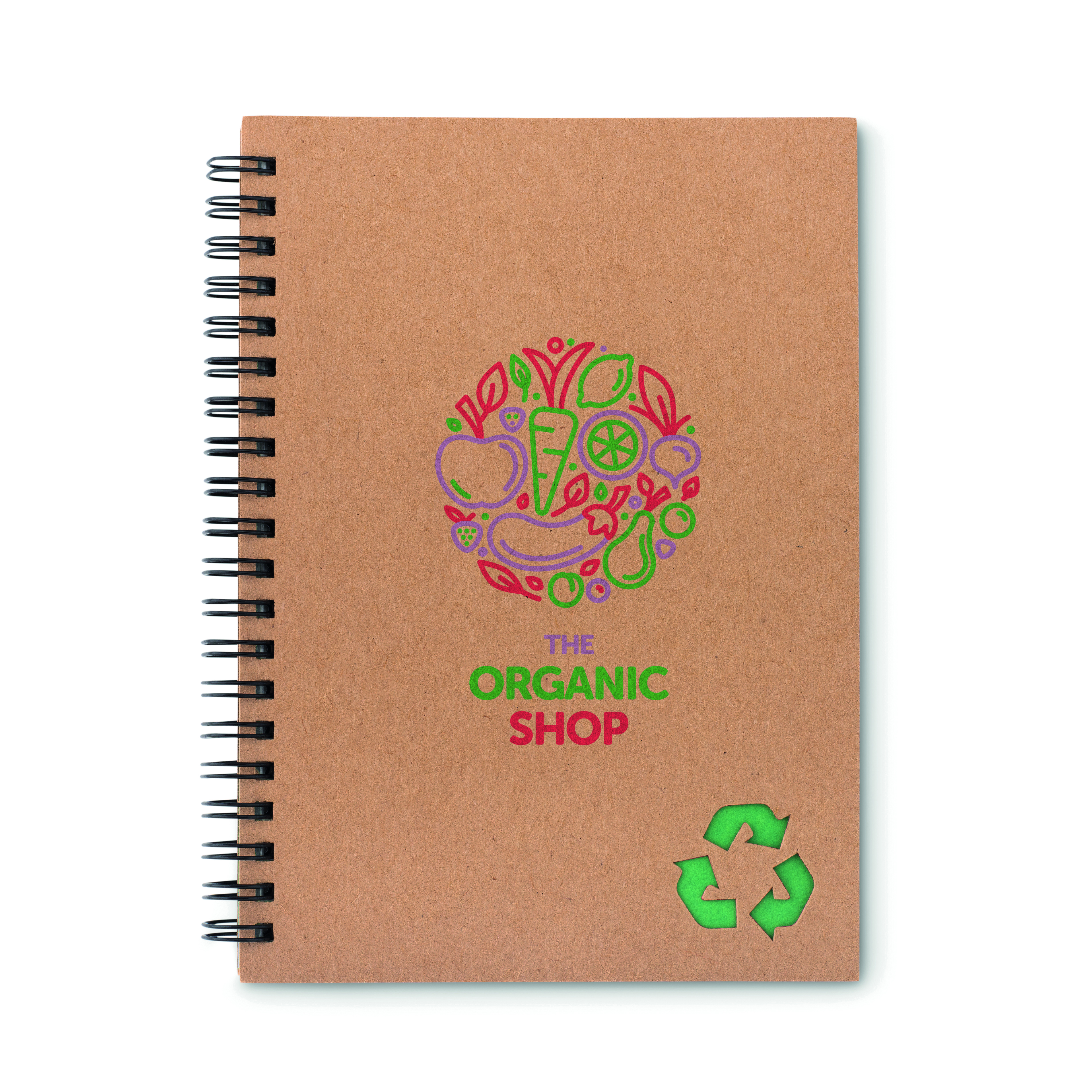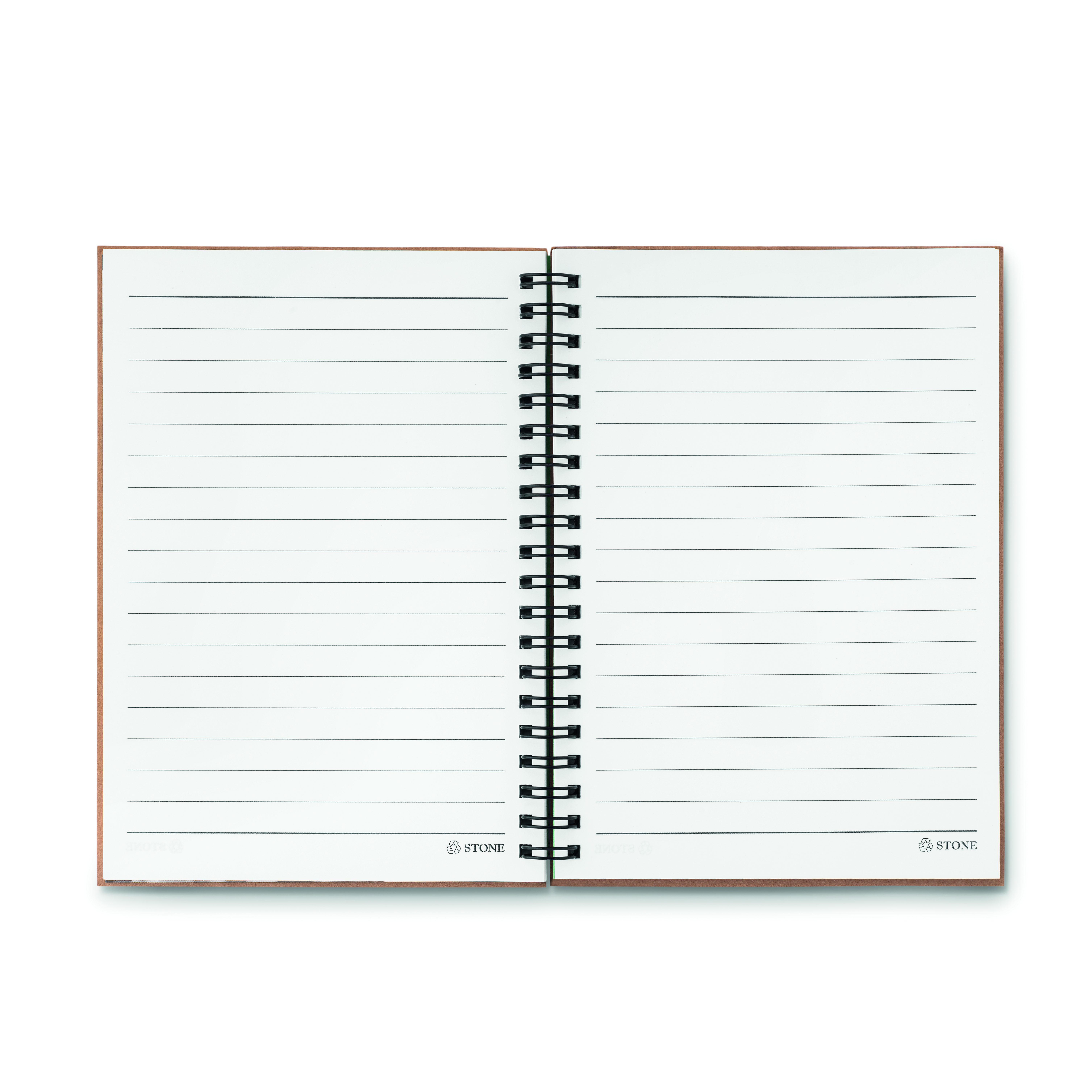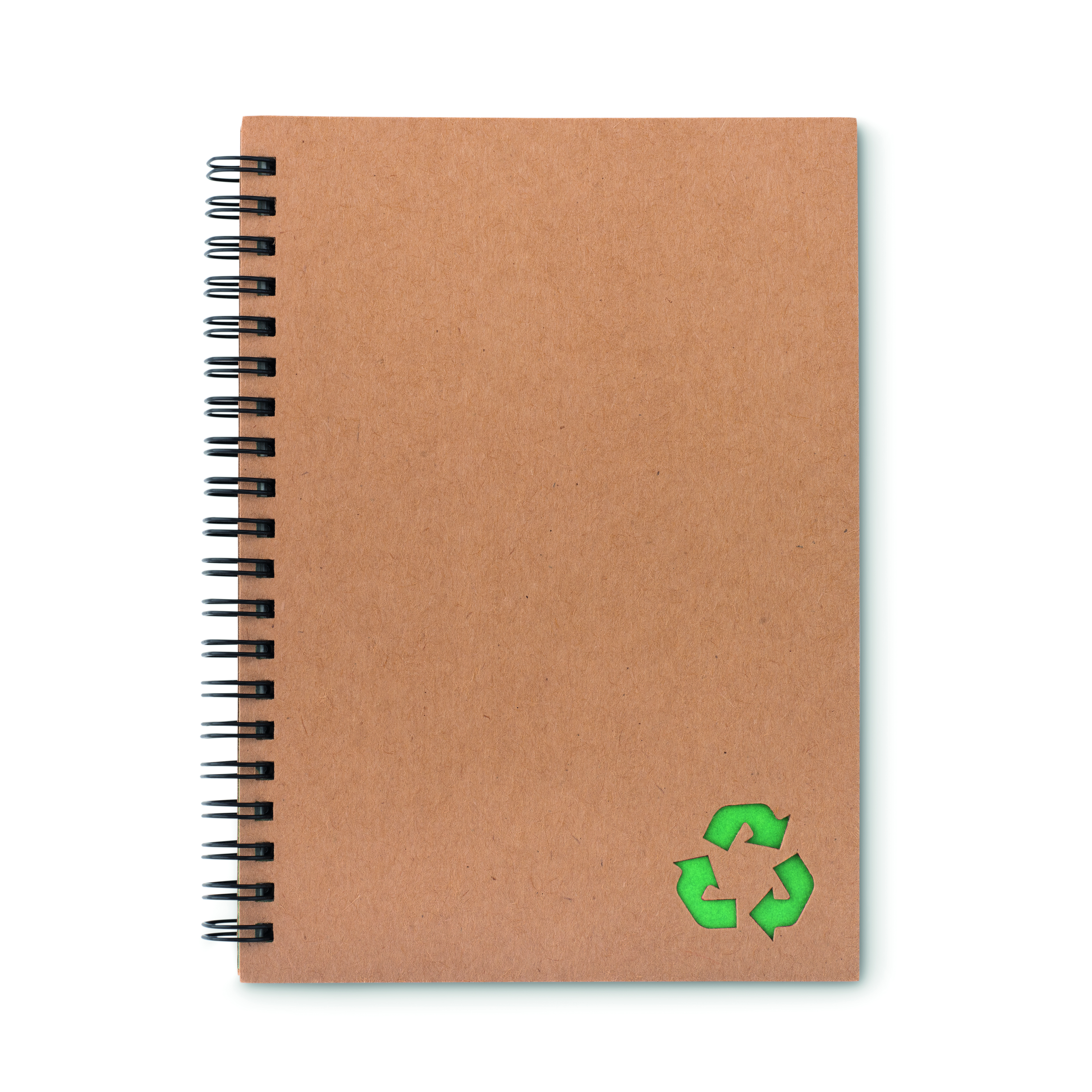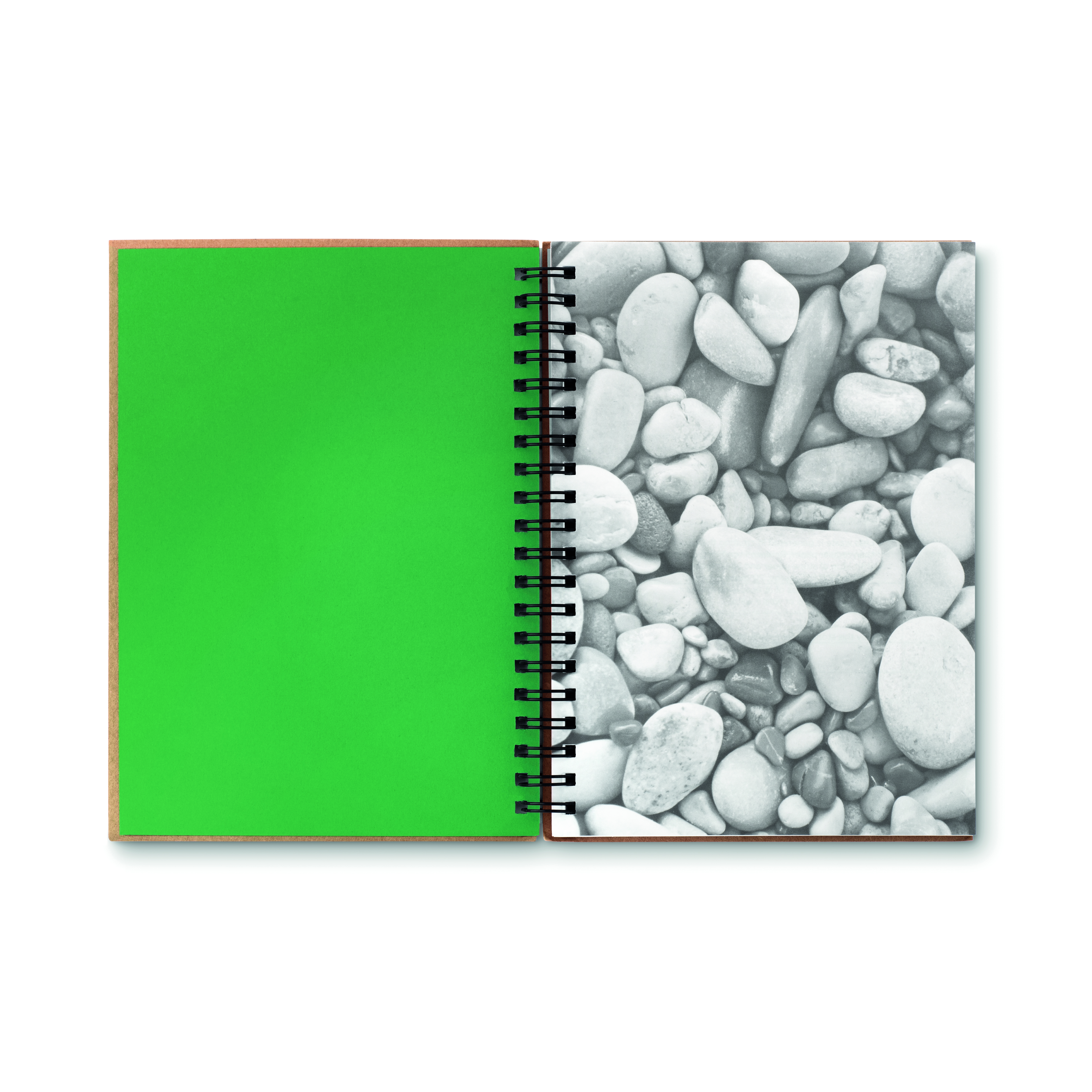 Notatnik z okładką z kartonu z recyklingu. Podwójna spirala. 140 stron w linie z papieru mineralnego (70 arkuszy). Papier mineralny jest wykonany z węglanu wapnia i HDPE (żywicy polietylenowej) stosowanej jako spoiwo. Jest wodoodporny i odporny na tłuszcz.