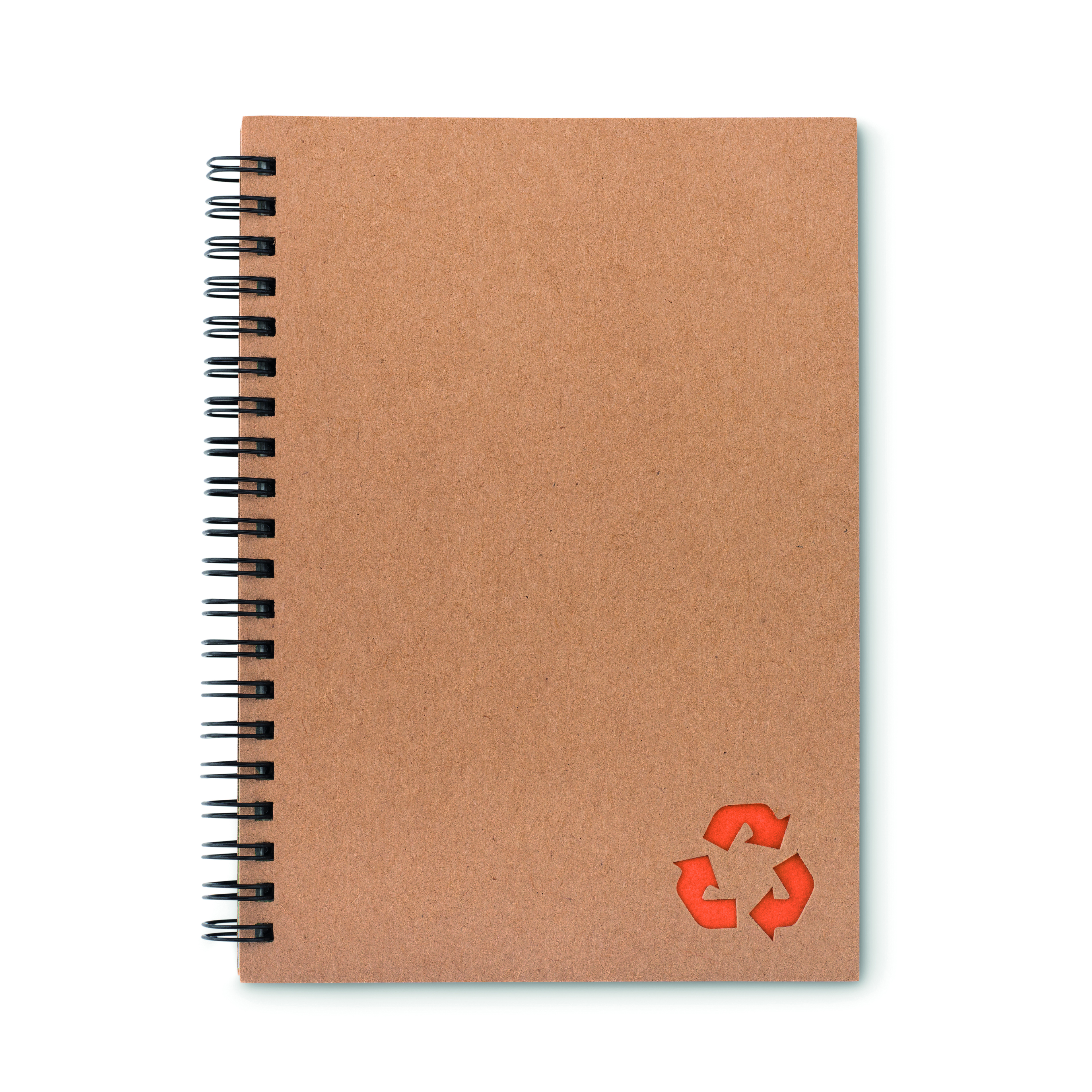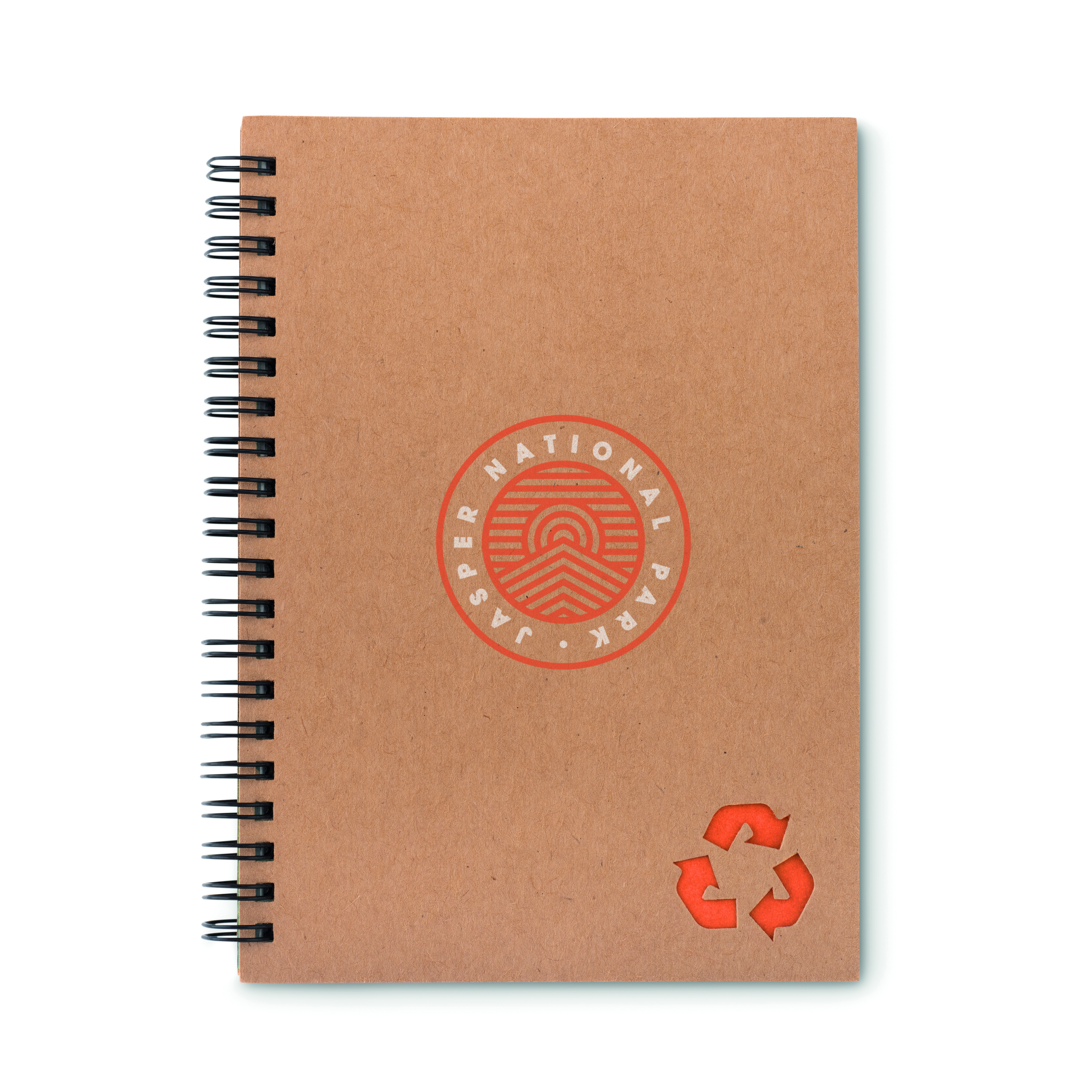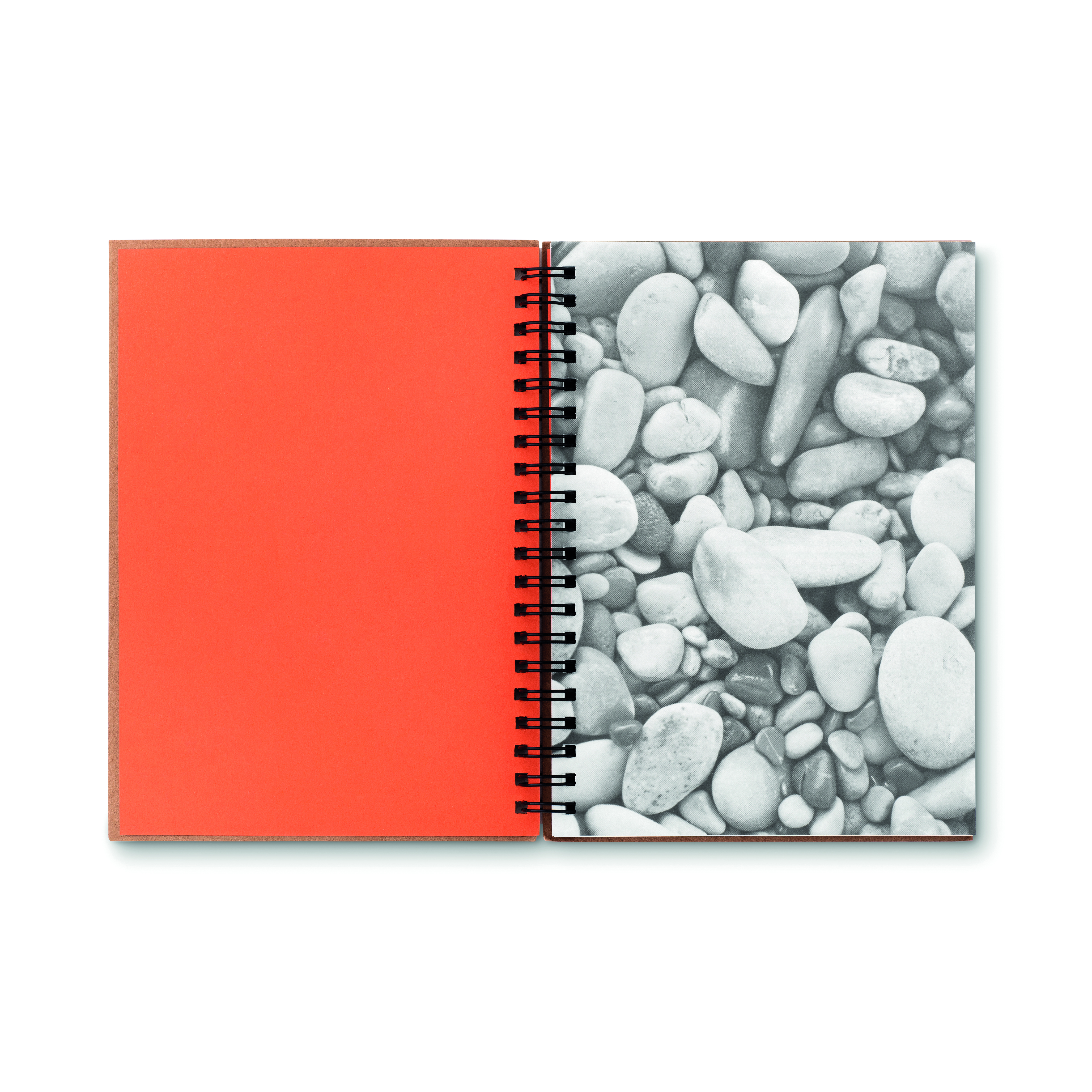 Notatnik z okładką z kartonu z recyklingu. Podwójna spirala. 140 stron w linie z papieru mineralnego (70 arkuszy). Papier mineralny jest wykonany z węglanu wapnia i HDPE (żywicy polietylenowej) stosowanej jako spoiwo. Jest wodoodporny i odporny na tłuszcz.