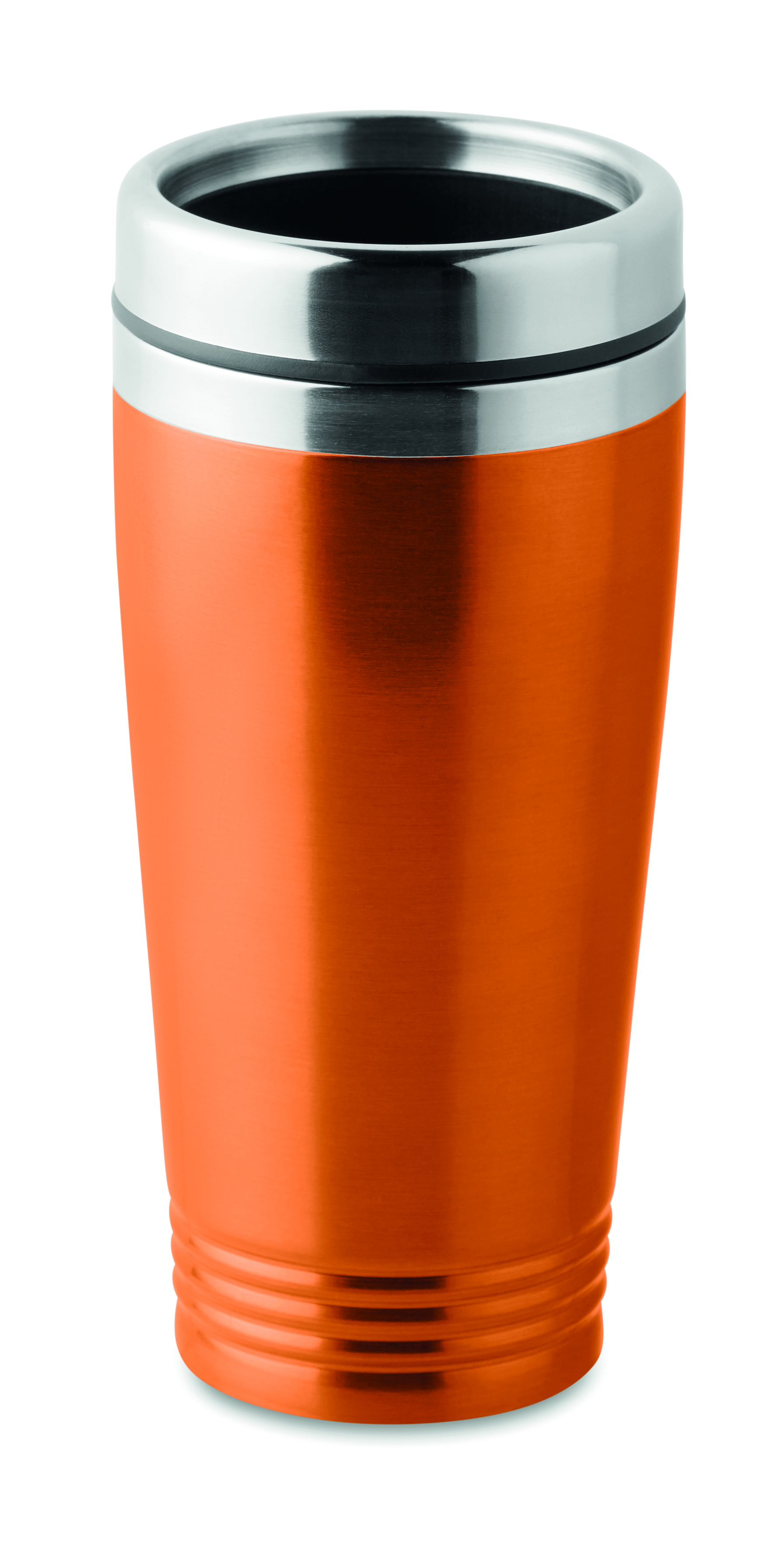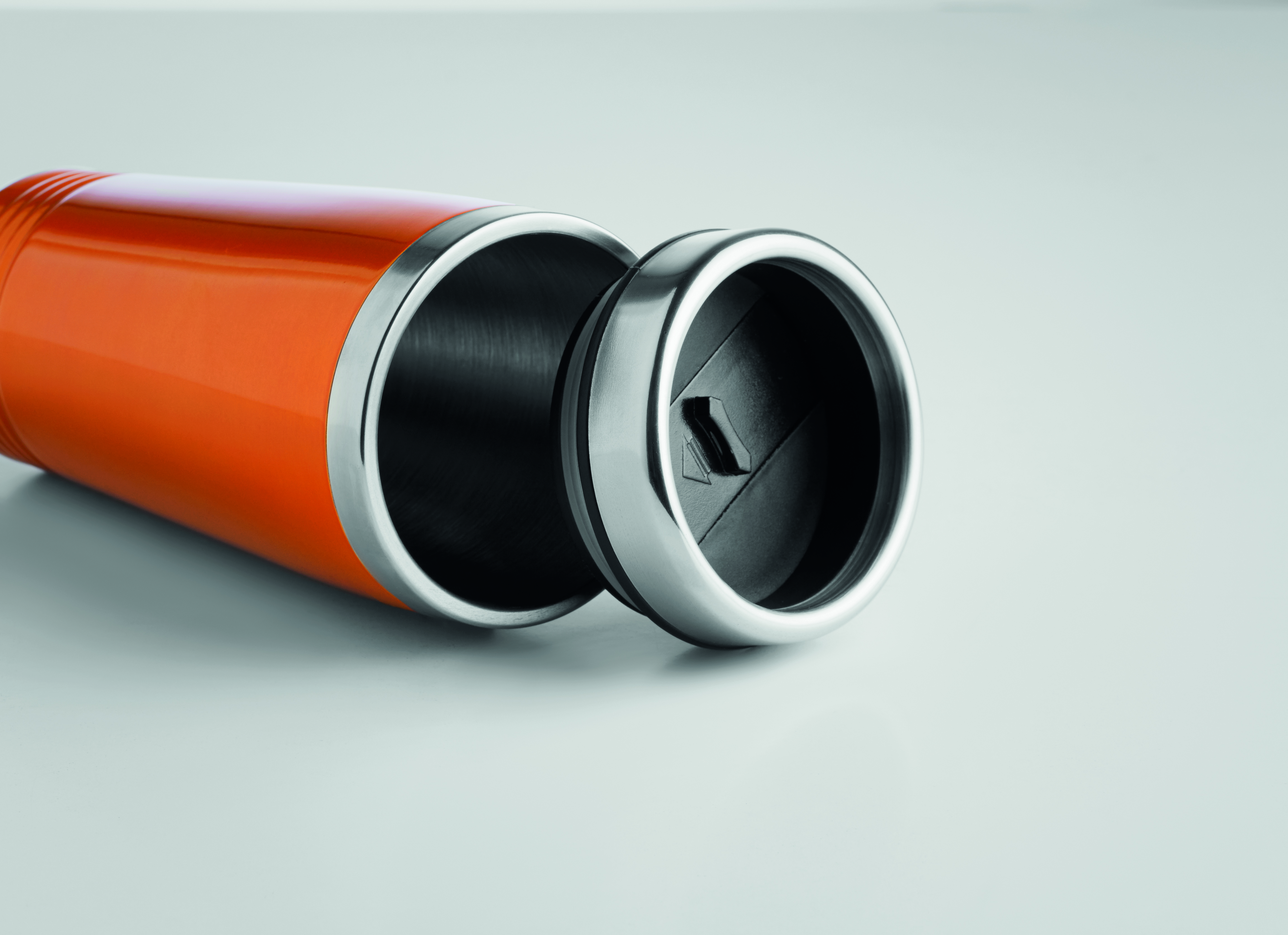 Kubek podróżny ze stali nierdzewnej z podwójnymi ściankami, z czarną pokrywką z PP. Pojemność: 400 ml.