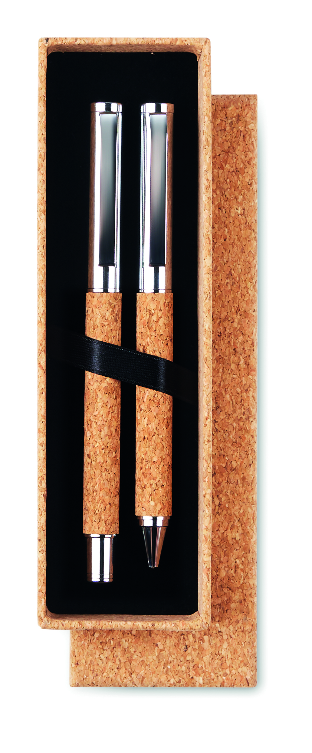 Metalowy zestaw do pisania. Długopis (mechanizm obrotowy) i roller (ze skuwką). Obudowa z korka. Zapakowane w dopasowane pudełko z korka. Odpowiednio niebieski i czarny atrament. Korek jest materiałem naturalnym, ze względu na jego strukturalną naturę i porowatość powierzchni ostateczny wygląd nadruku na każdym artykule może się różnić.