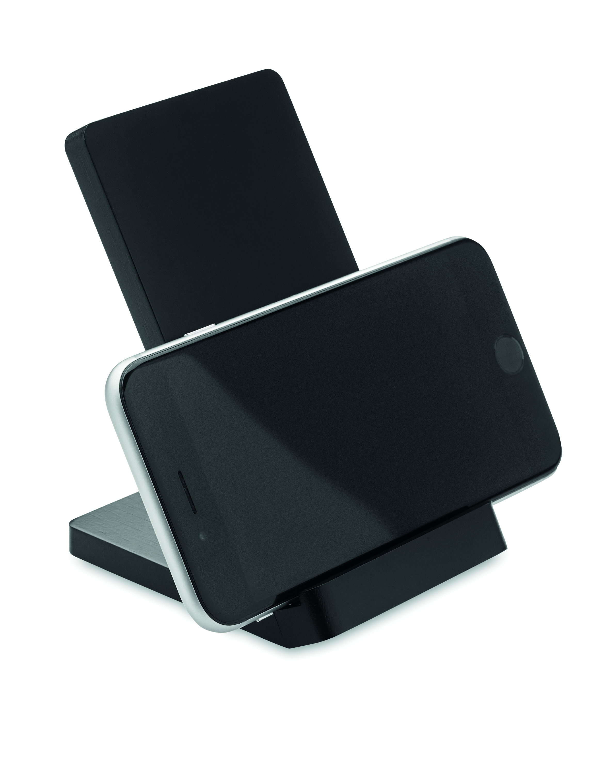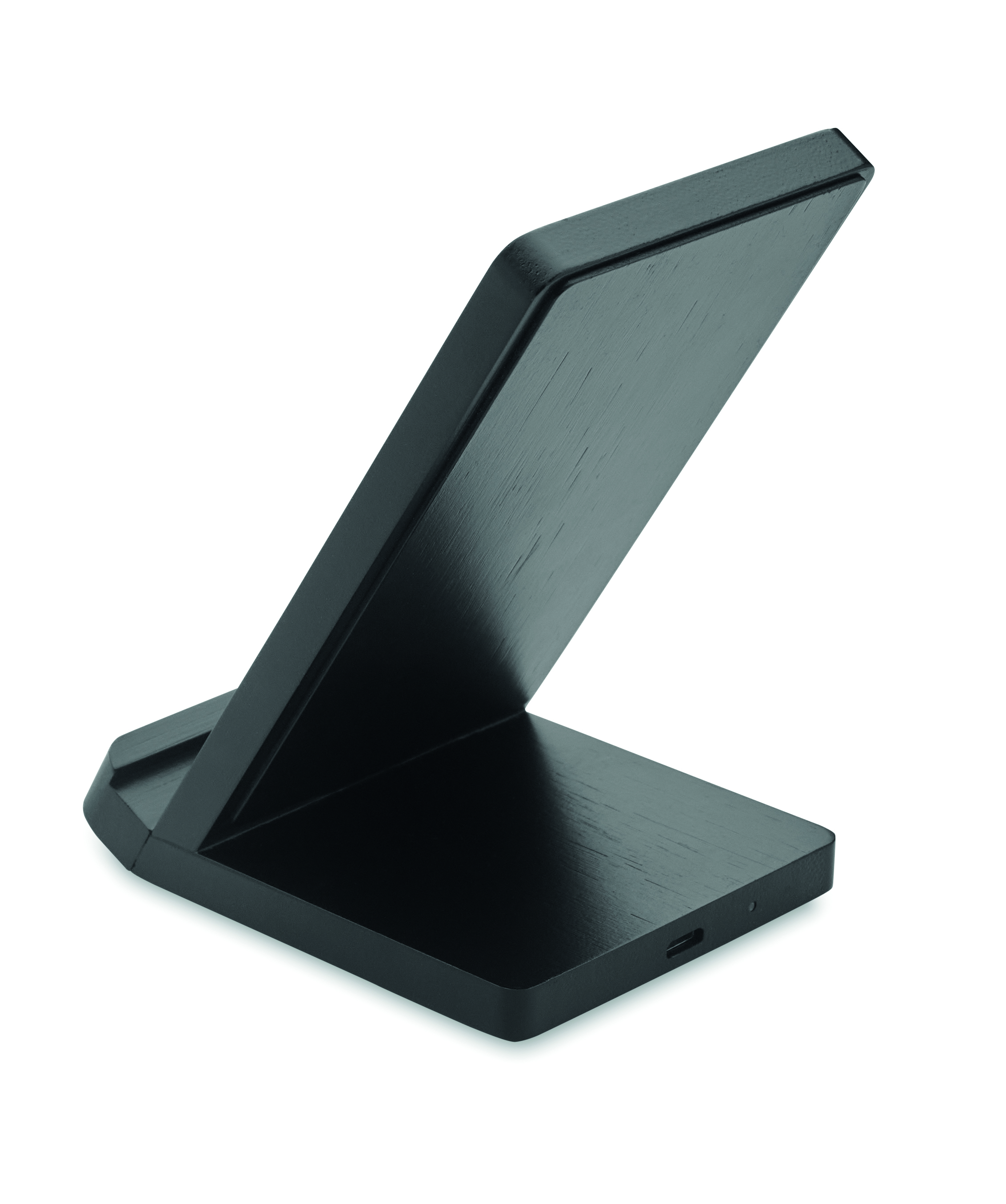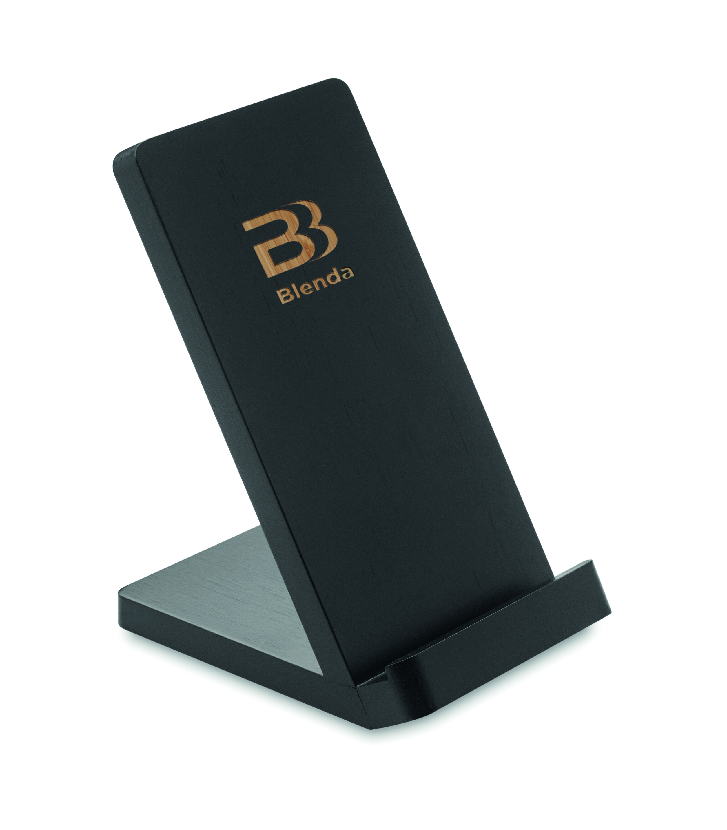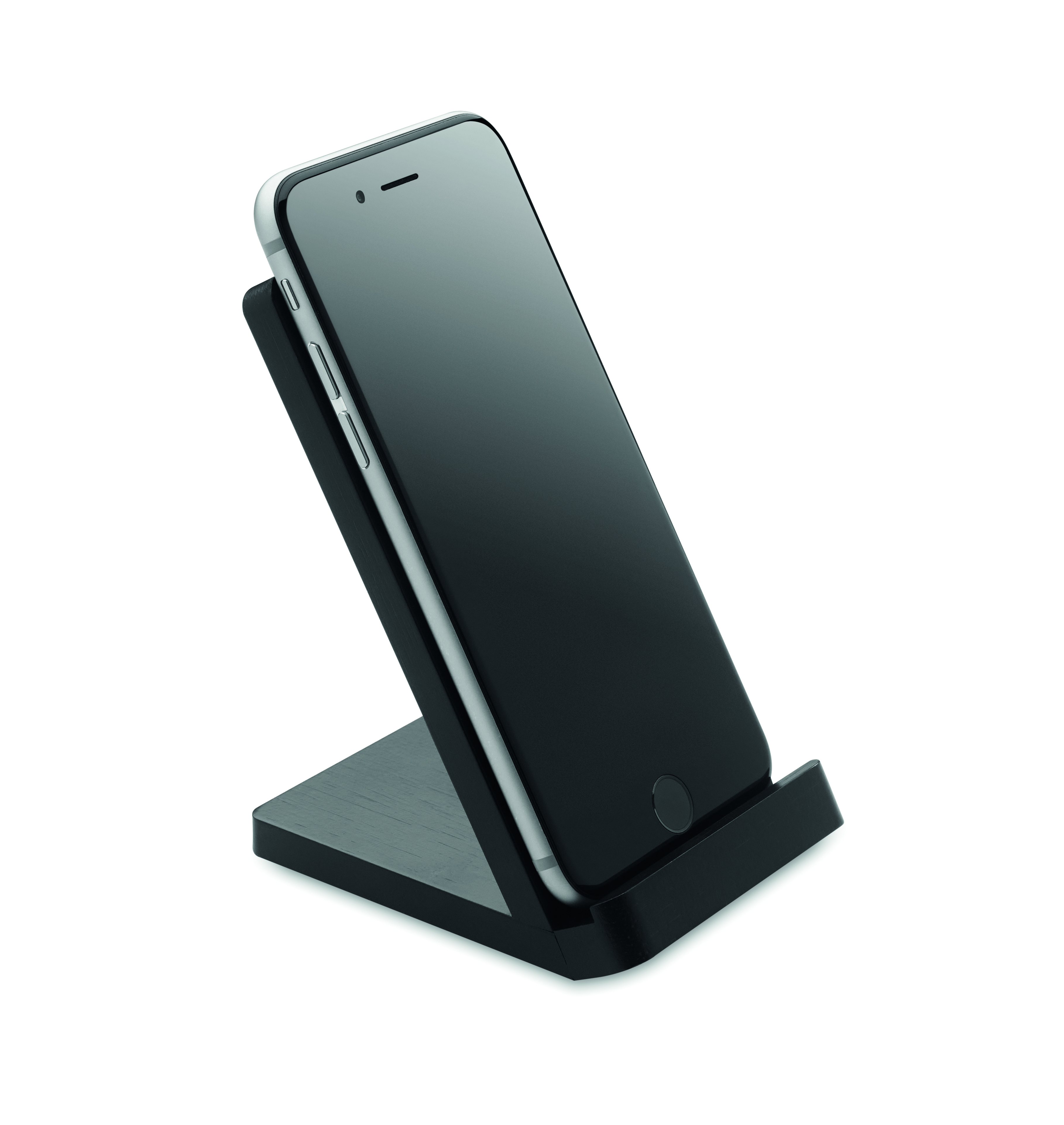 Bezprzewodowa ładowarka z podwójną cewką dla 1 urządzenia w bambusowej obudowie i funkcją podstawki. Umieść na niej smartfon, aby rozpocząć ładowanie. Wyjście: DC5V/1A (15W).
