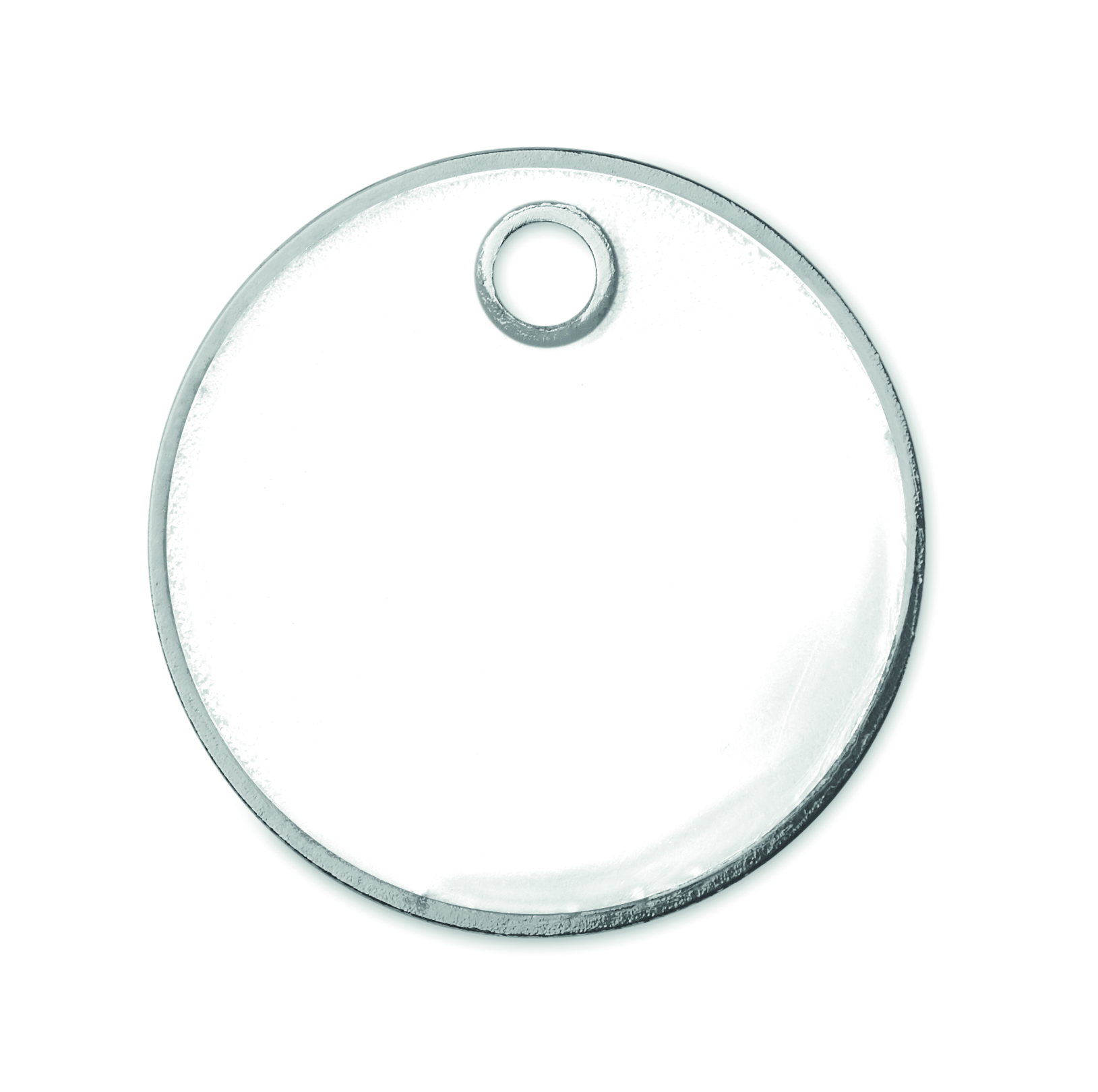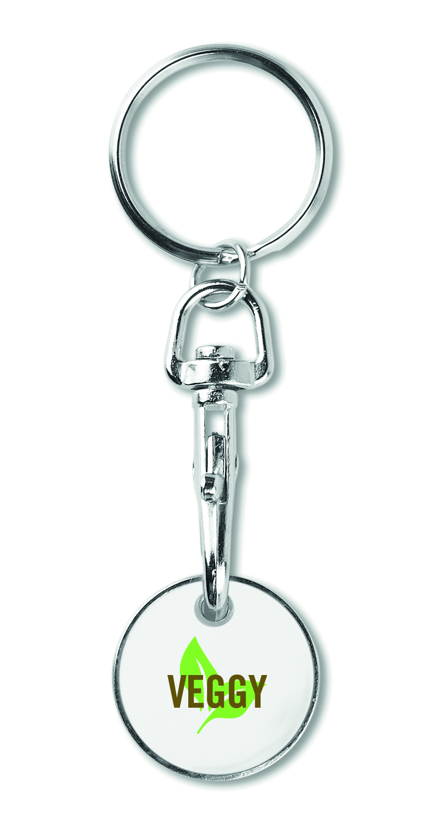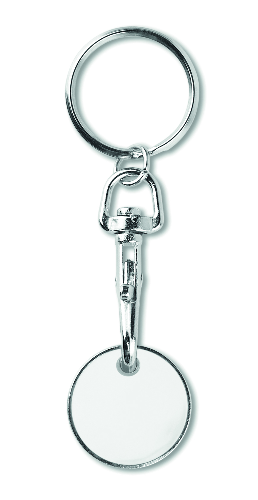 Brelok z żetonem (EURO) do wózka. Lakierowany na przedniej stronie. Żeton o wymiarach Ø2,3 cm i grubości 2,1 mm.