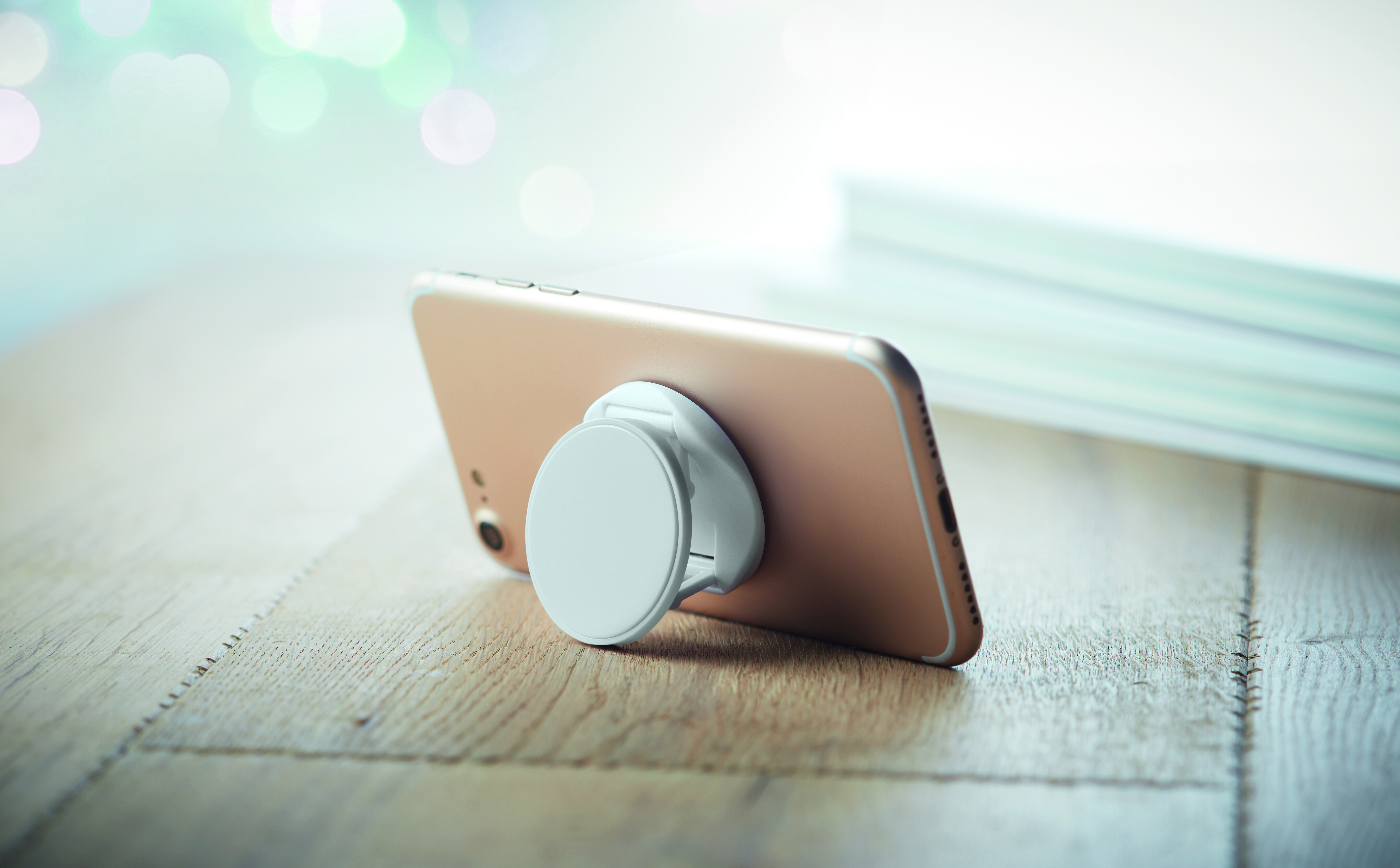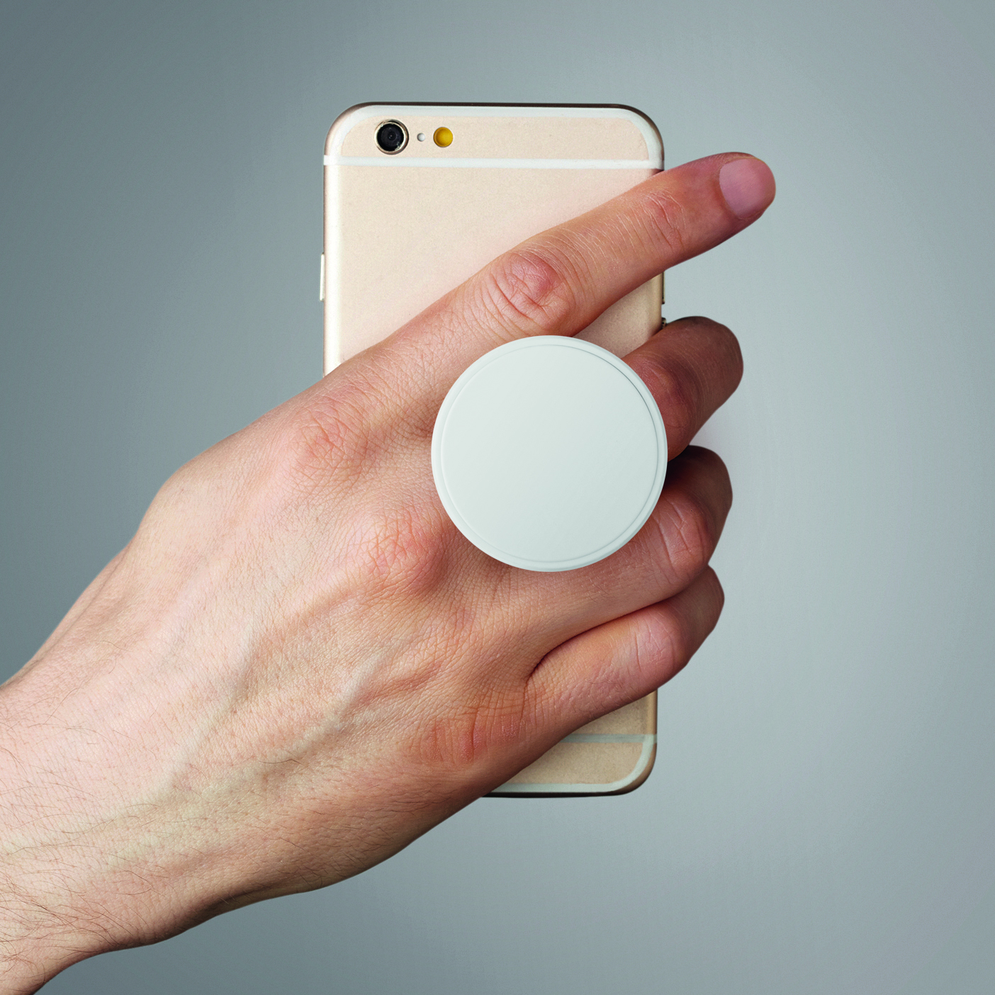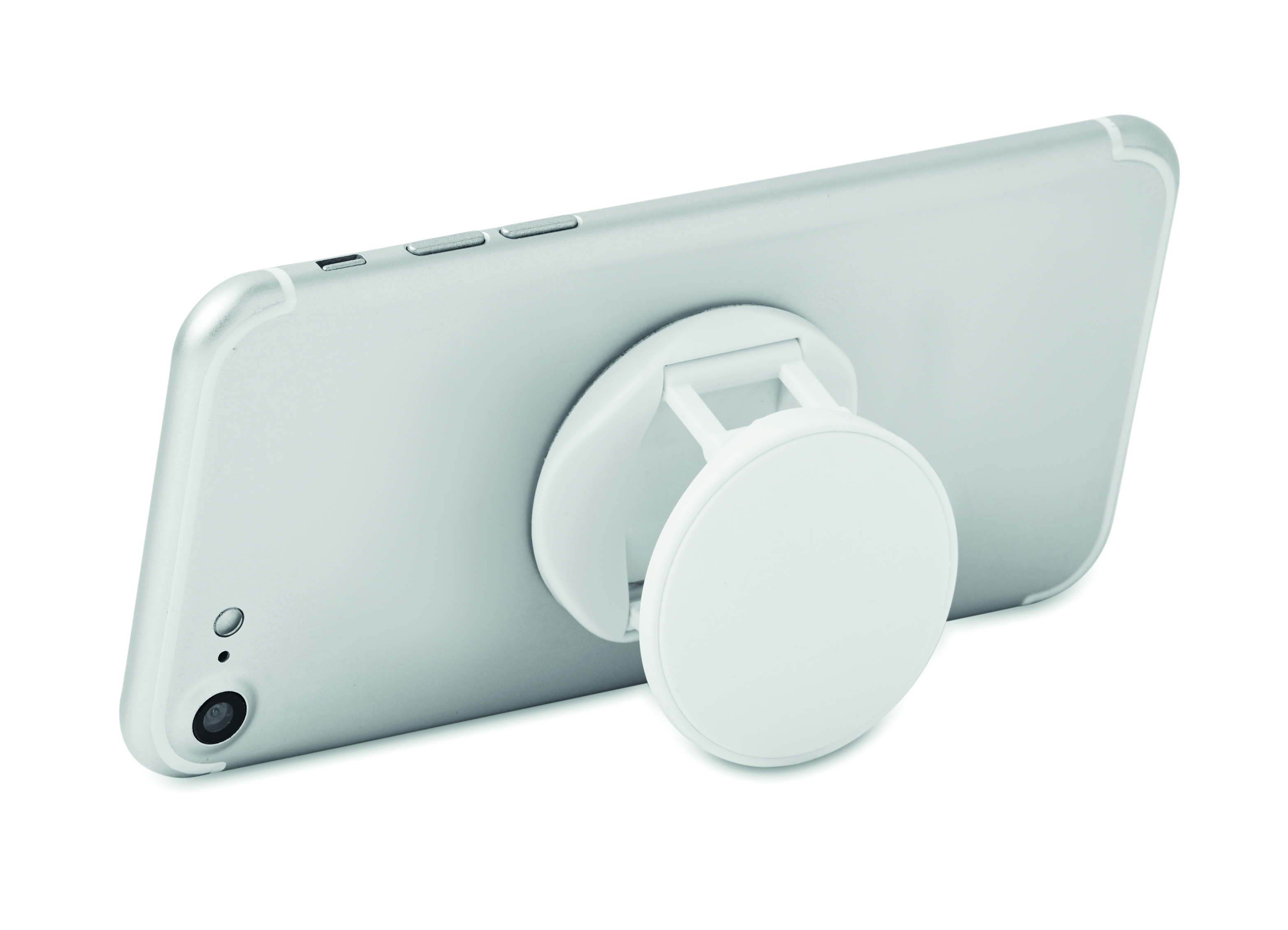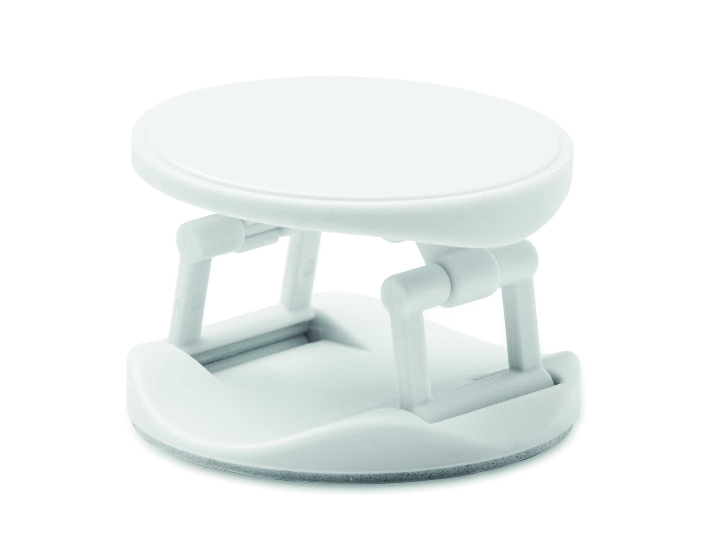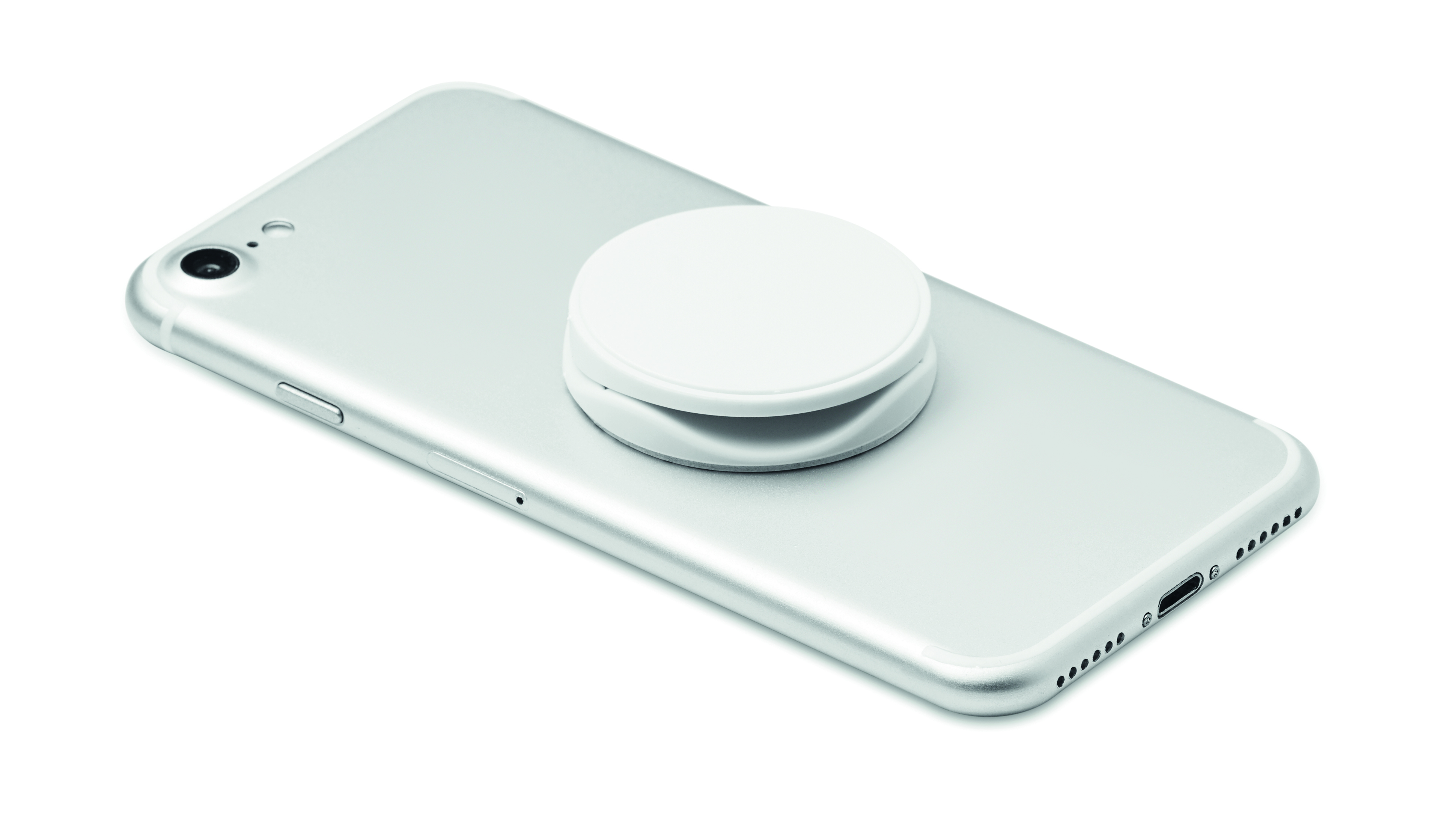 Składany okrągły uchwyt na telefon z ABS. Posiada 2 funkcje: stojak oraz uchwyt na telefon. Z tyłu ma naklejkę 3M.