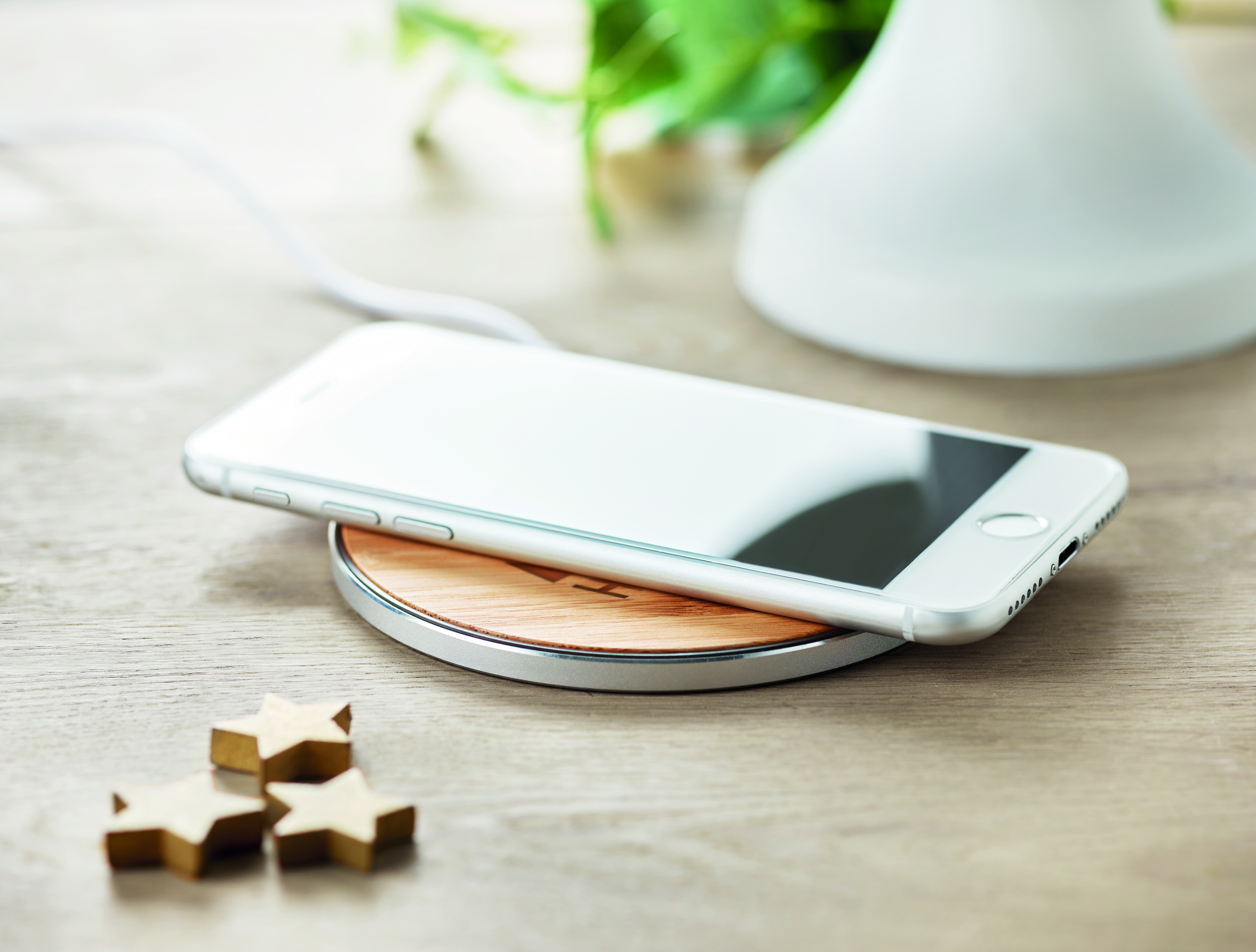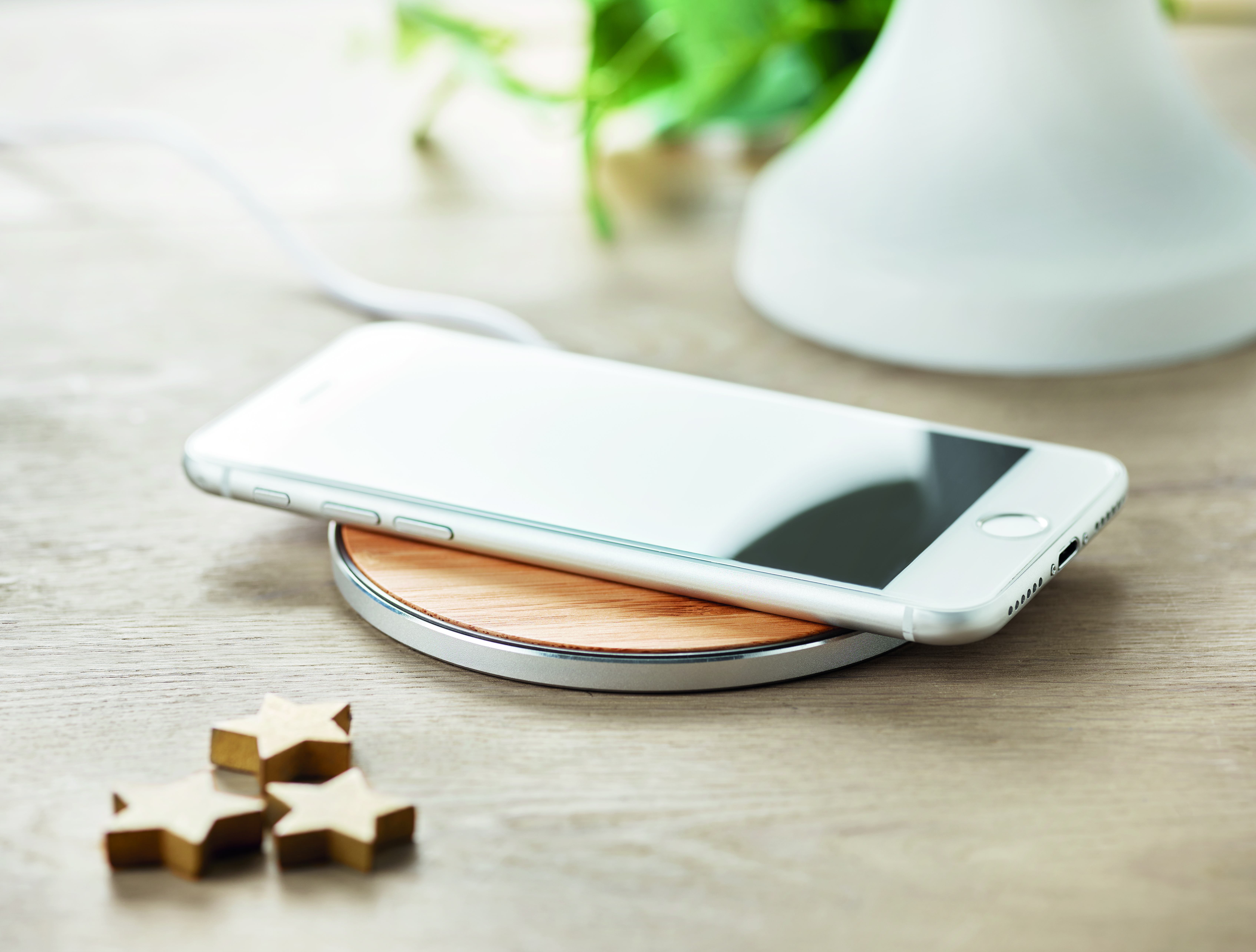 Bezprzewodowa szybka ładowarka z bambusa i aluminium. Niebieskie światło świeci podczas ładowania. Wyjście: DC9V/1.1A (10W). Bambus jest produktem naturalnym, dlatego mogą występować niewielkie różnice w kolorze i rozmiarze poszczególnych elem