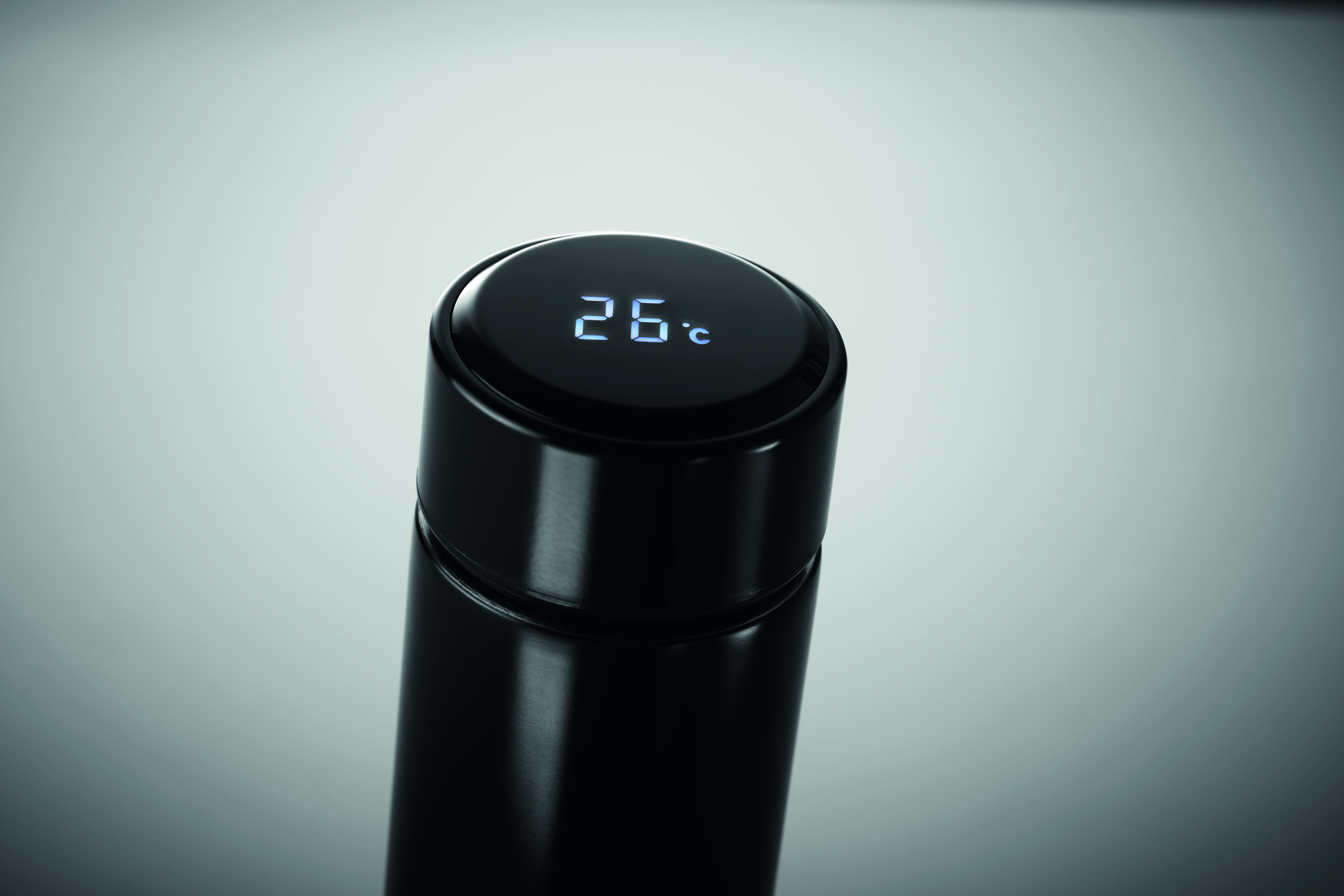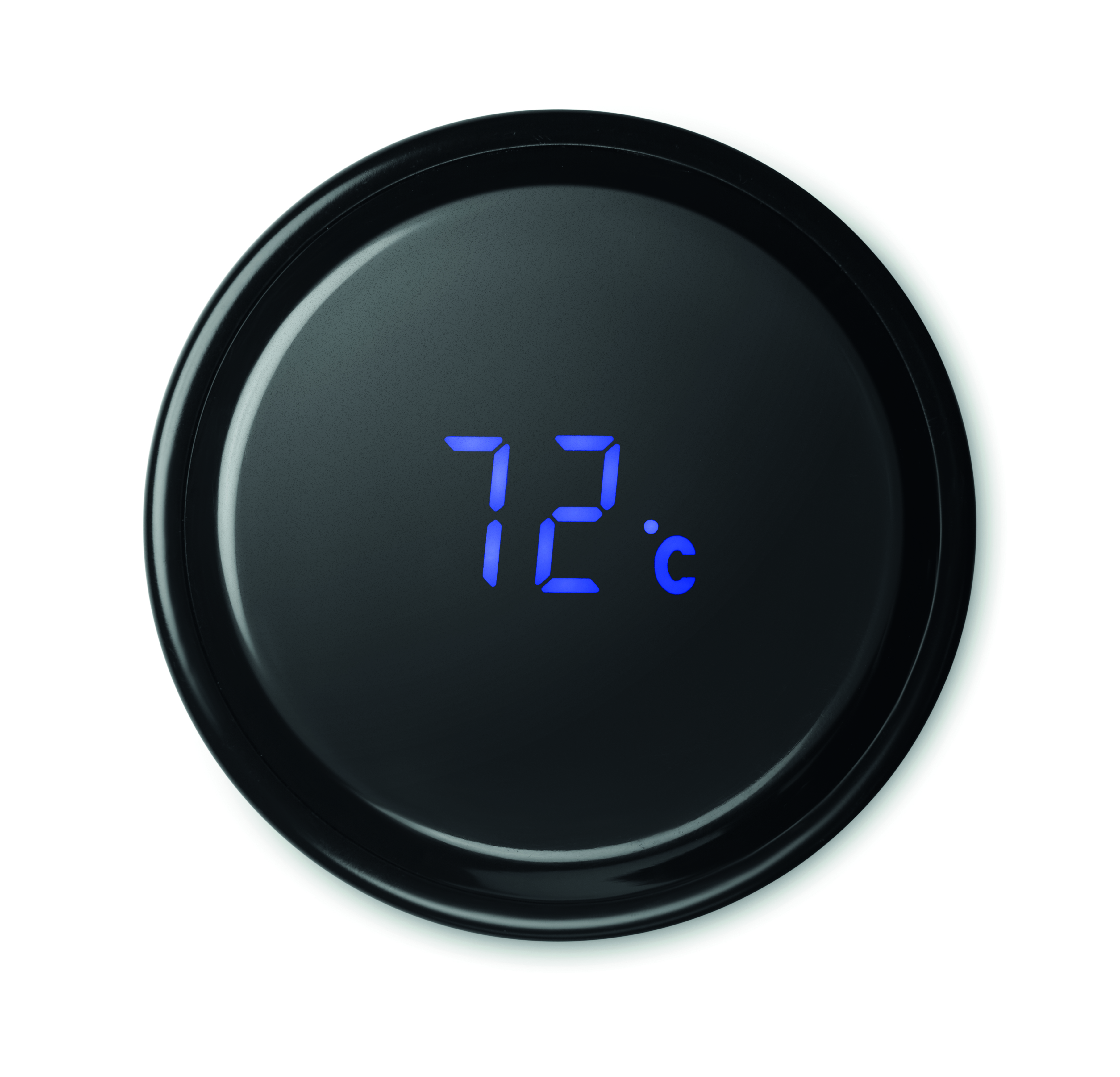 Butelka ze stali nierdzewnej, posiada podwójne ścianki z izolacyjną komorą próżniową. Wbudowany dotykowy termometr LED na pokrywie i zaparzacz do herbaty.Zawiera 1 wymienną bateria CR2032. Szczelna. Poj. 450 ml. Szczelna.