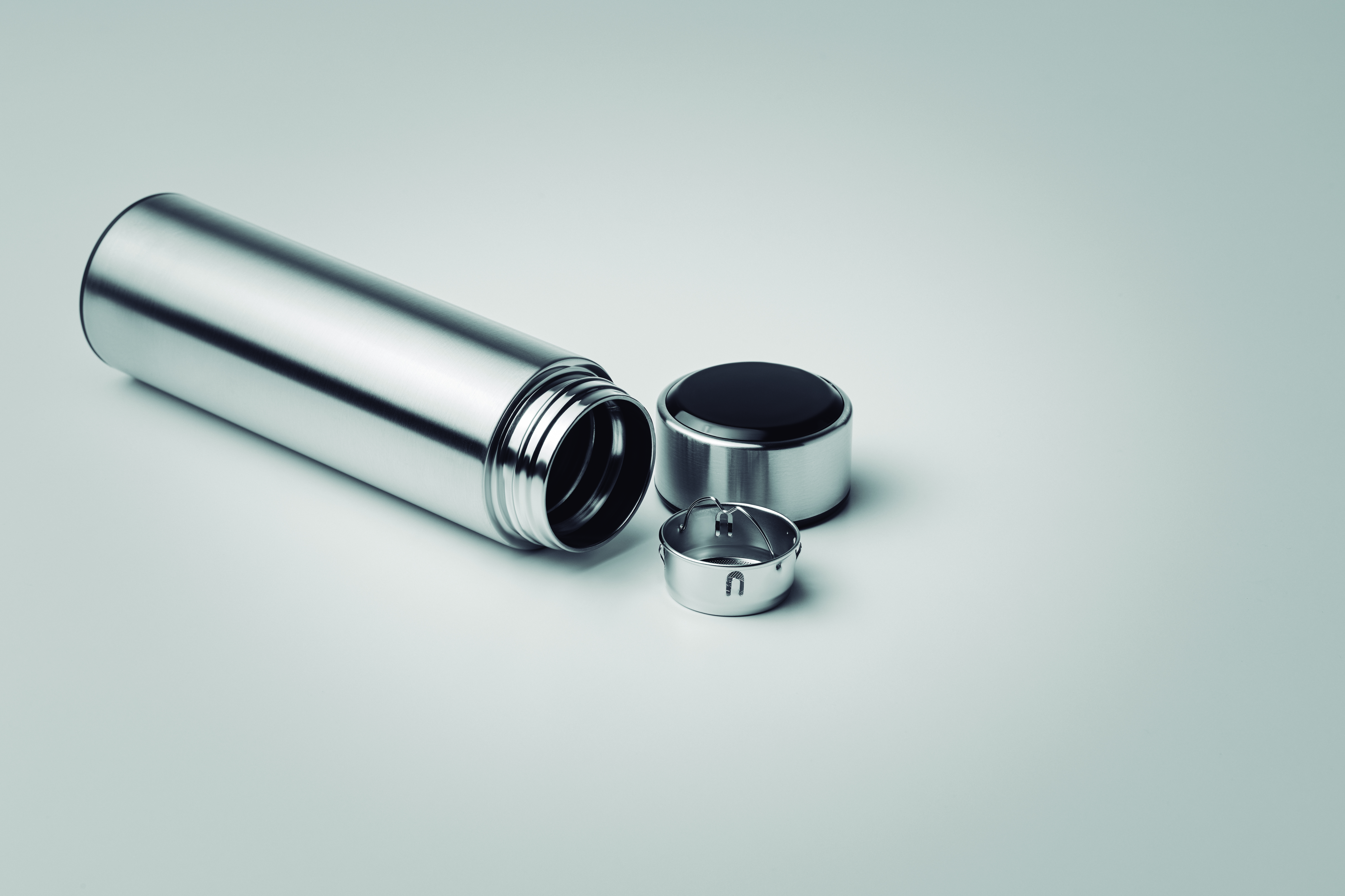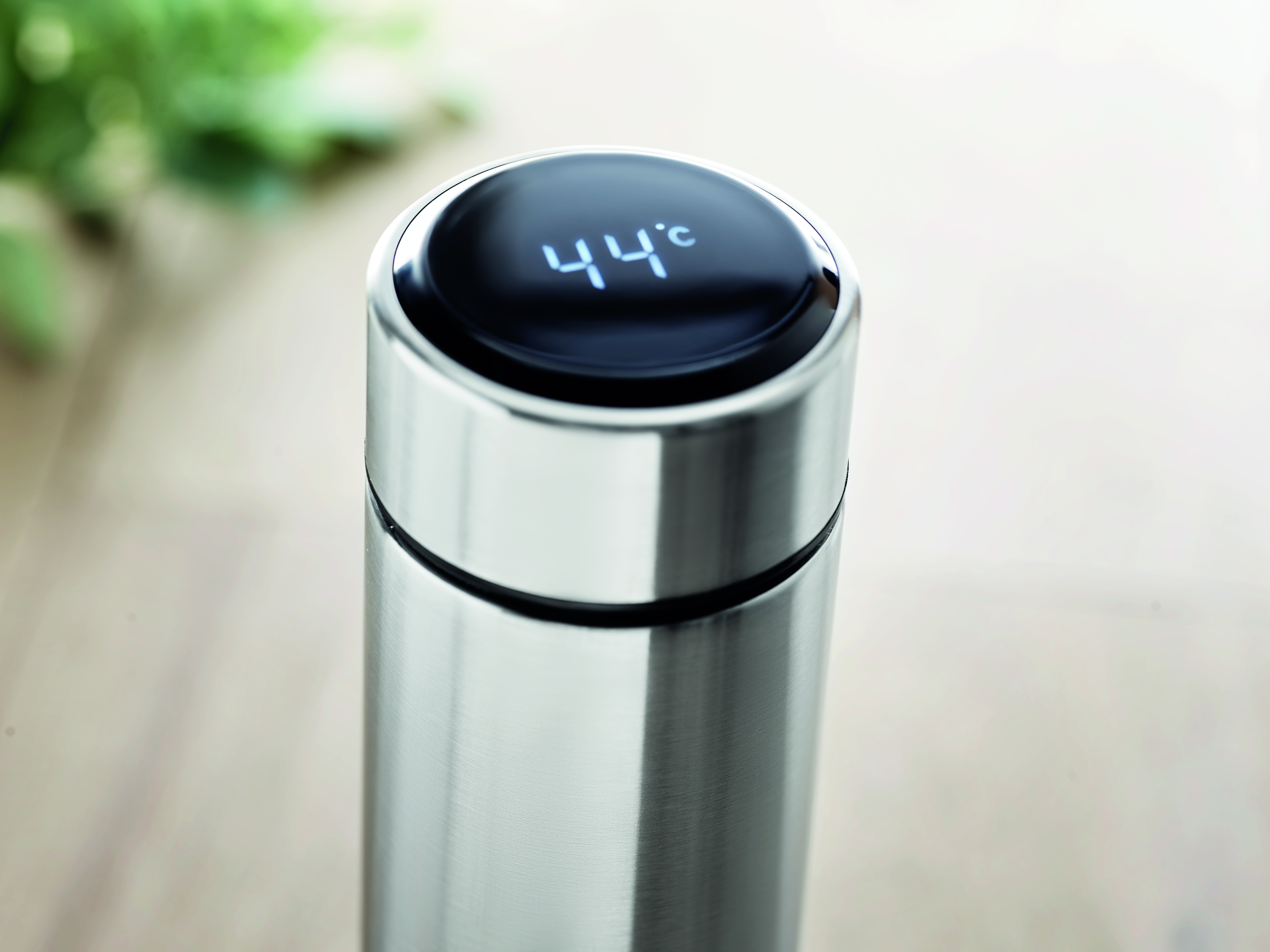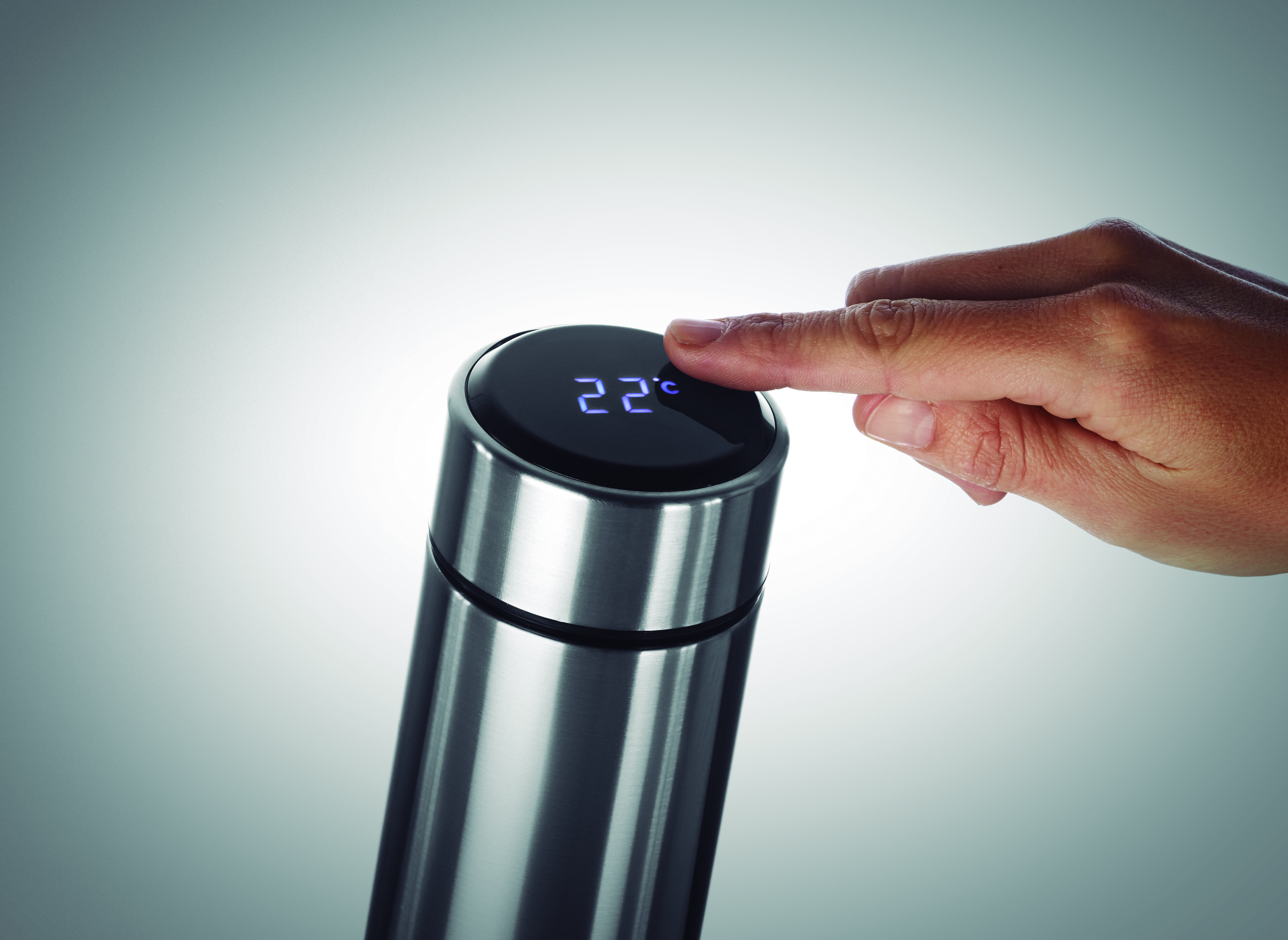 Butelka ze stali nierdzewnej, posiada podwójne ścianki z izolacyjną komorą próżniową. Wbudowany dotykowy termometr LED na pokrywie i zaparzacz do herbaty.Zawiera 1 wymienną bateria CR2032. Szczelna. Poj. 450 ml. Szczelna.