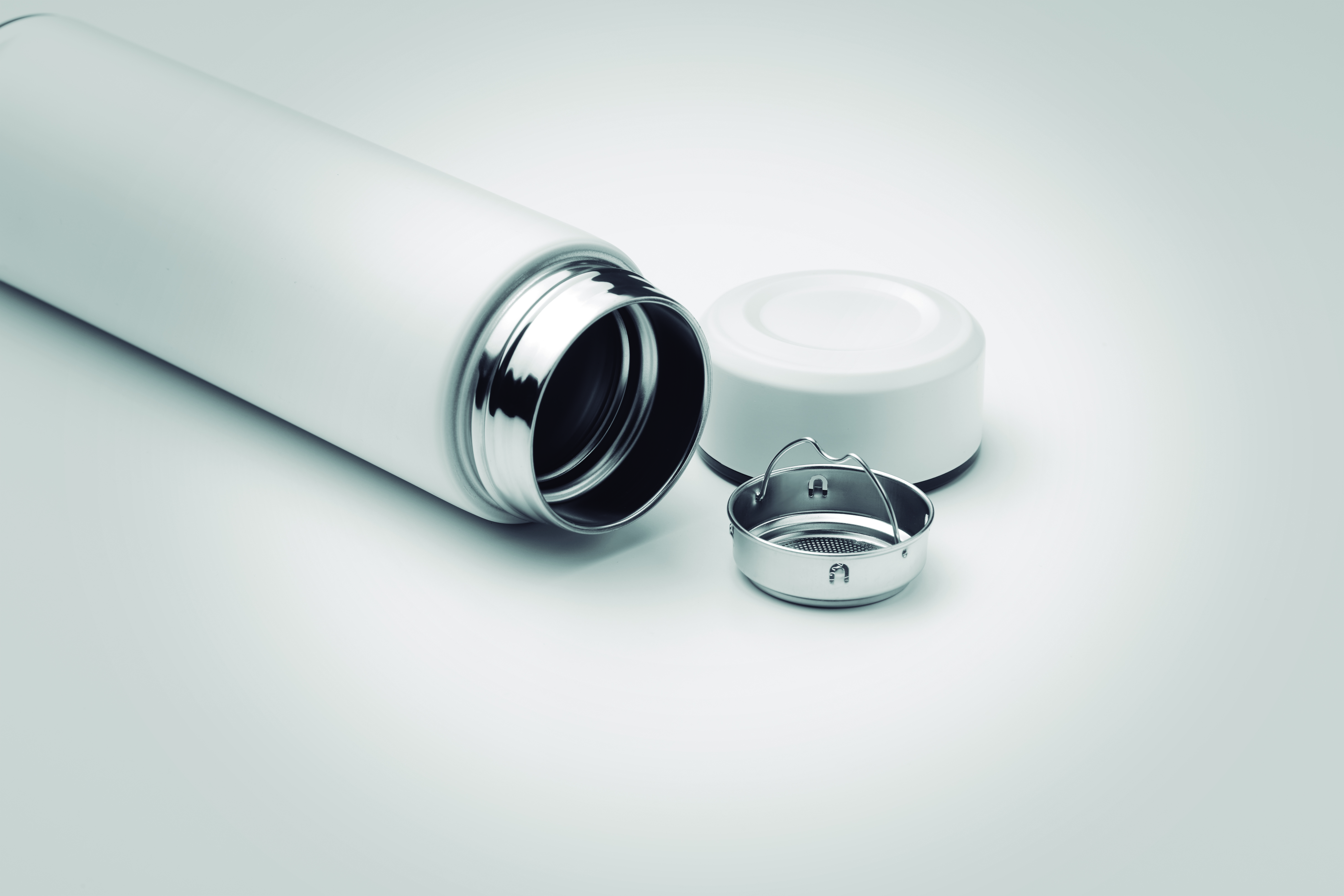 Izolowany termos ze stali nierdzewnej z podwójnymi ściankami i dodatkowym zaparzaczem do herbaty. Pojemność 425 ml. Szczelny.