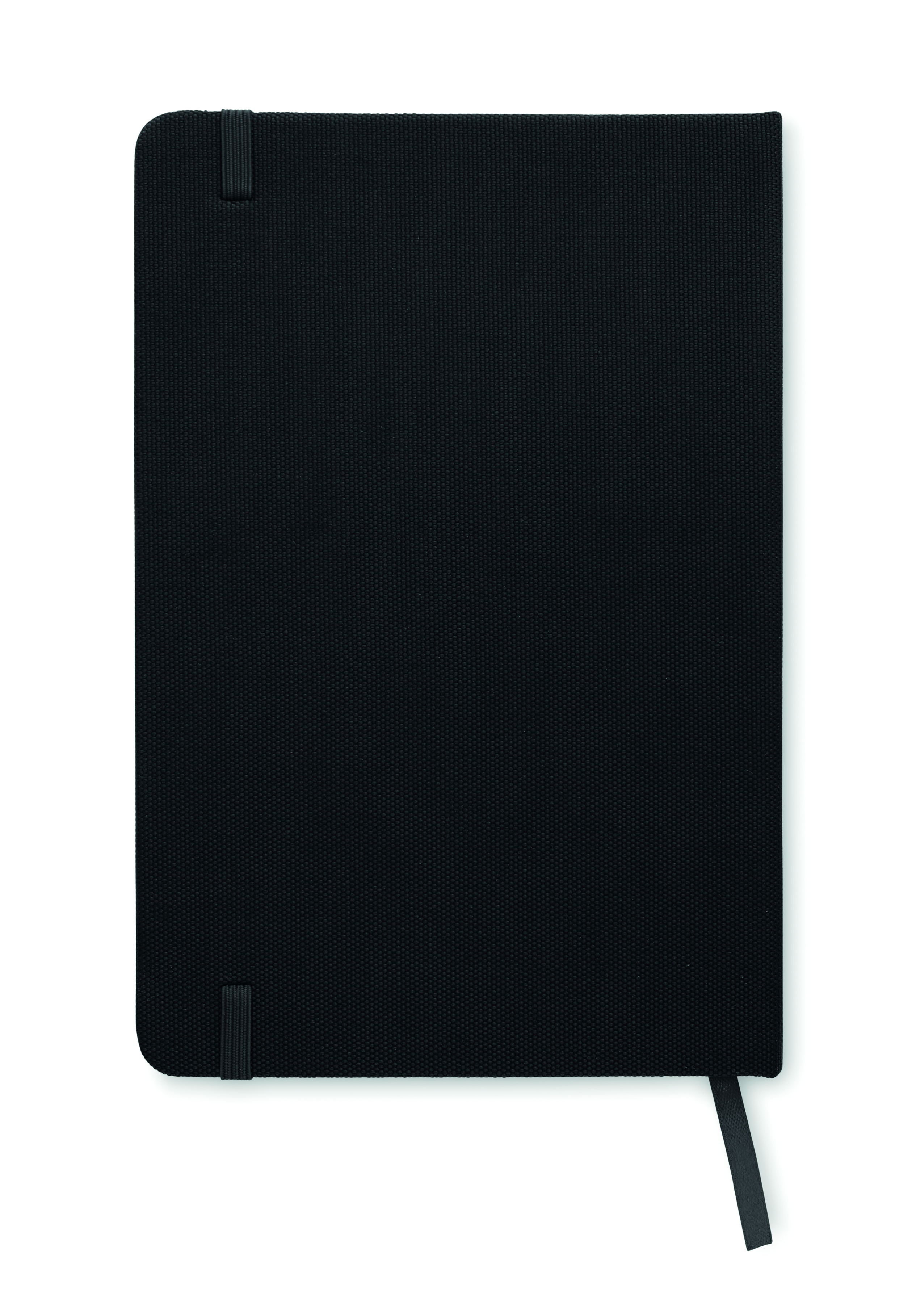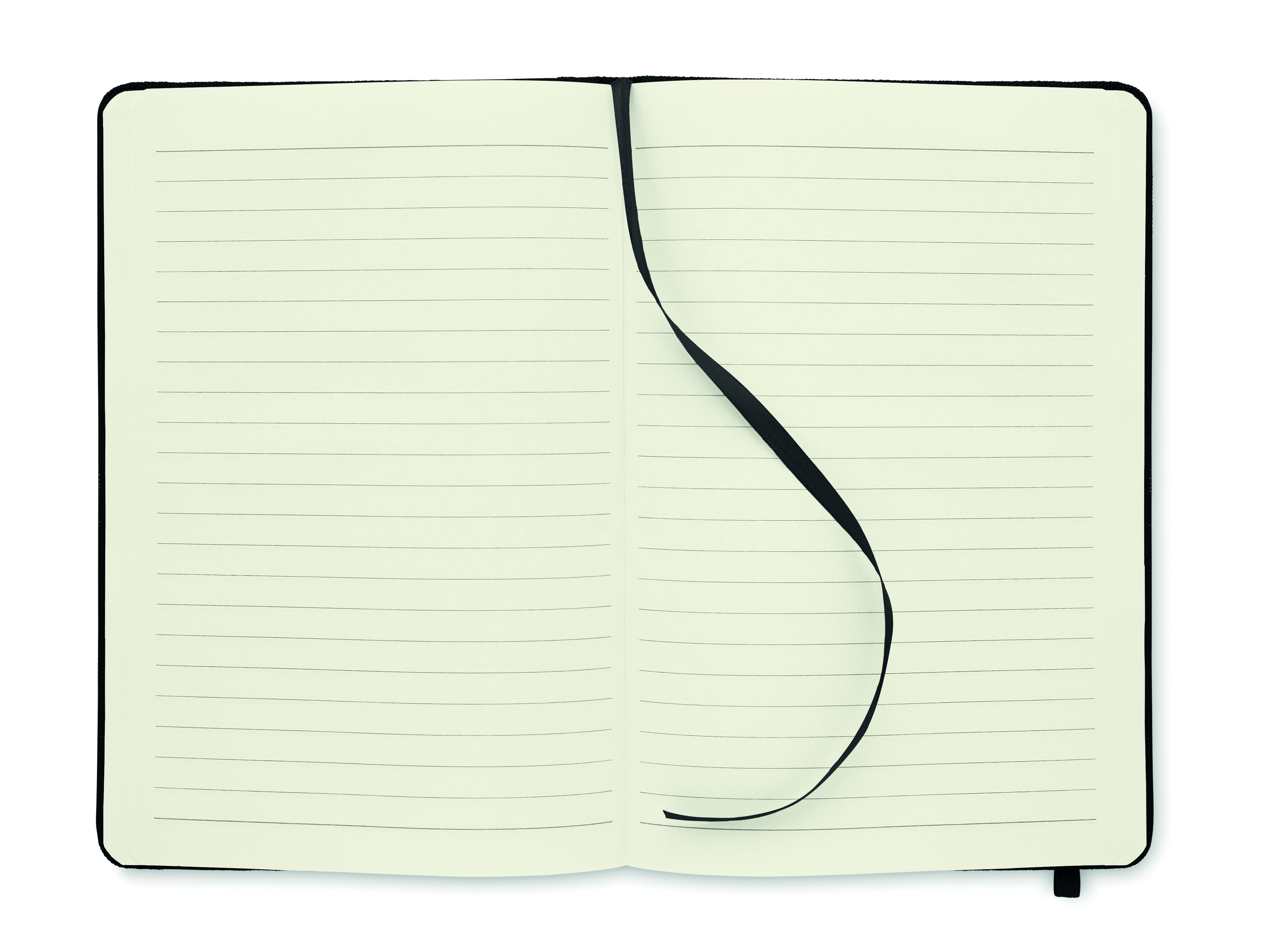Notatnik A5 z twardą okładką 600D RPET. 160 stron (80 kartek) w linie z papieru ekologicznego. Dopasowany elastyczny pasek zamykający i zakładka z tasiemki. FSC®-certified | FSC MIX CREDIT, P7.1, FSC-C213206