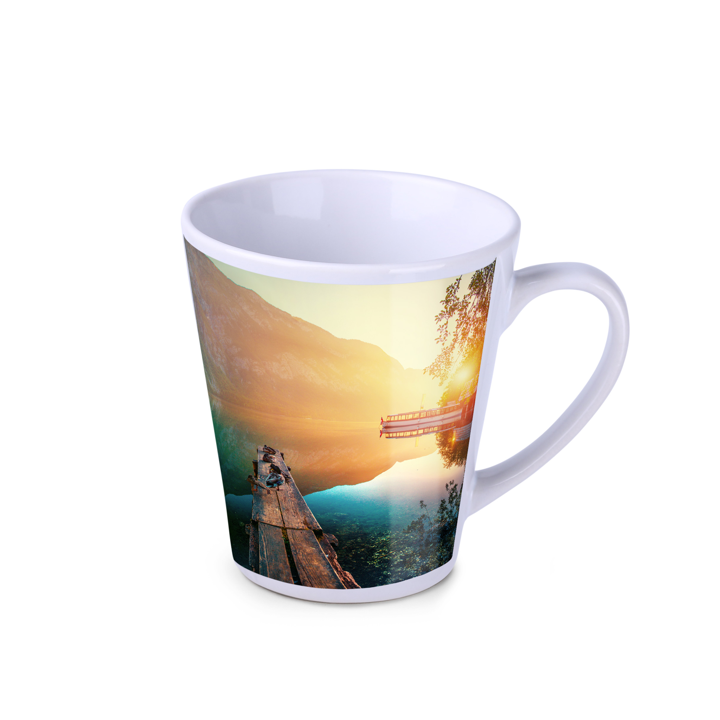 Kubek sublimacyjny o klasycznym trapezowym kształcie. Można nanosić na niego nadruki w fotograficznej jakości. Posiada ergonomiczne ucho.
