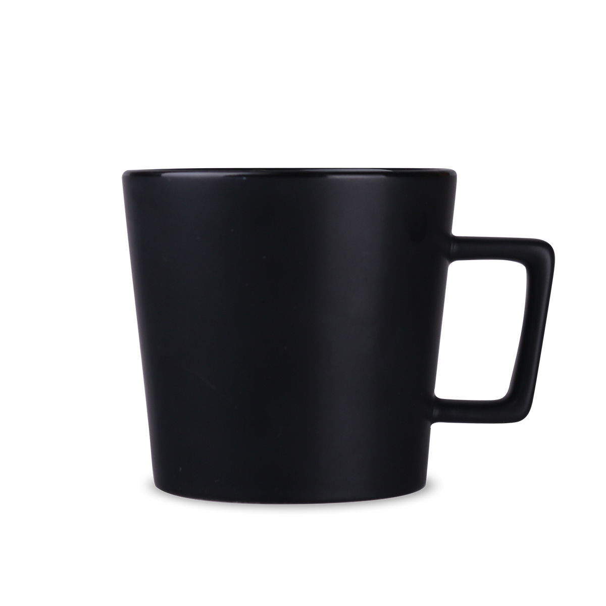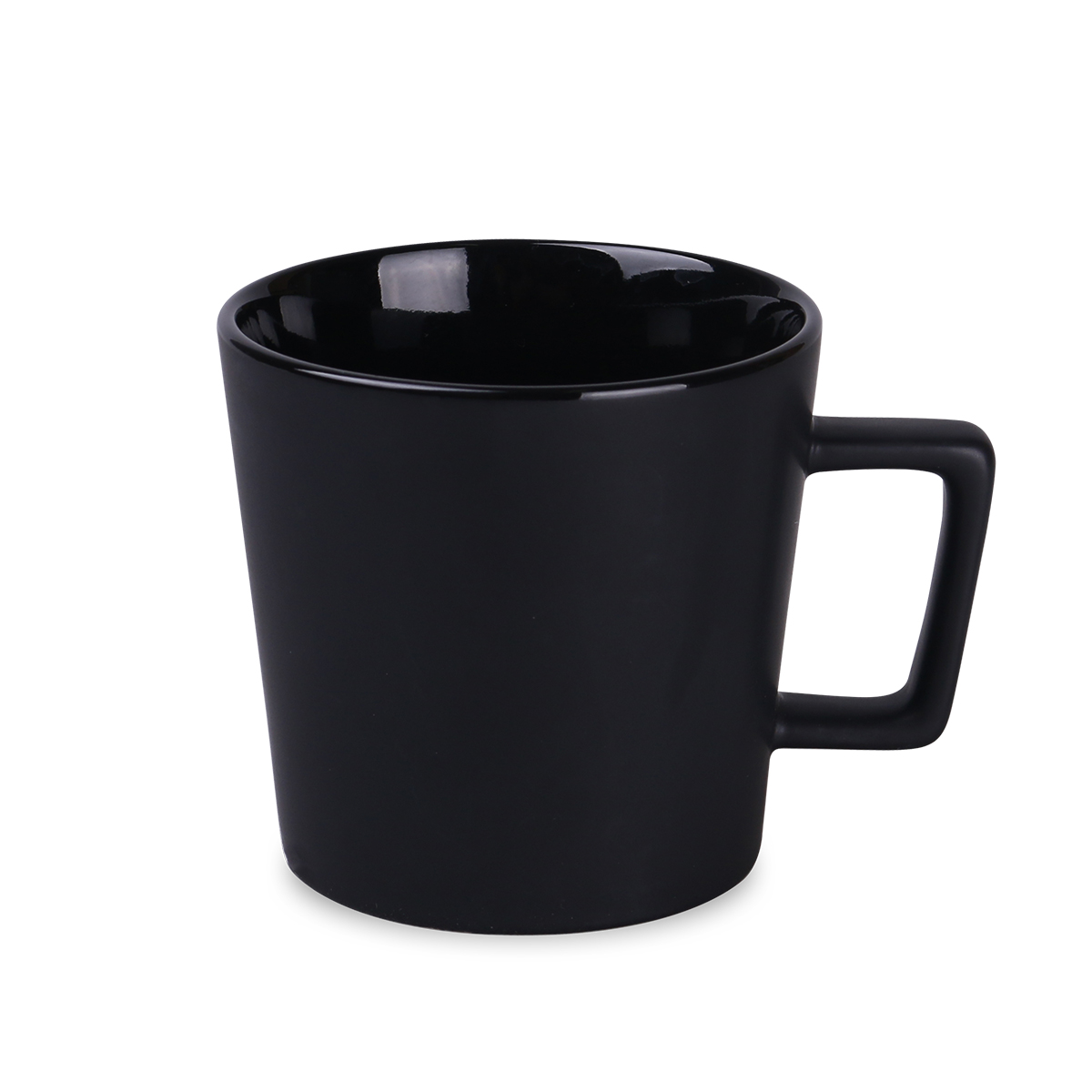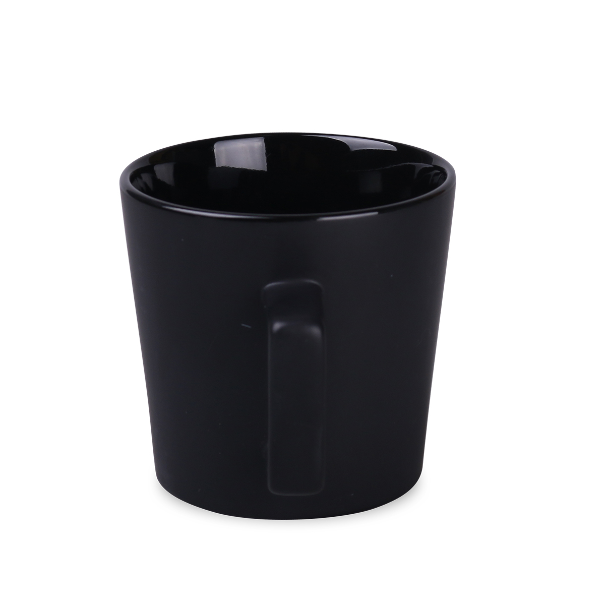 Nowoczesny kubek z czarną matową powierzchnią. Posiada ucho o ciekawym, designerskim kształcie. Posiada wnętrze w kilku kolorach.