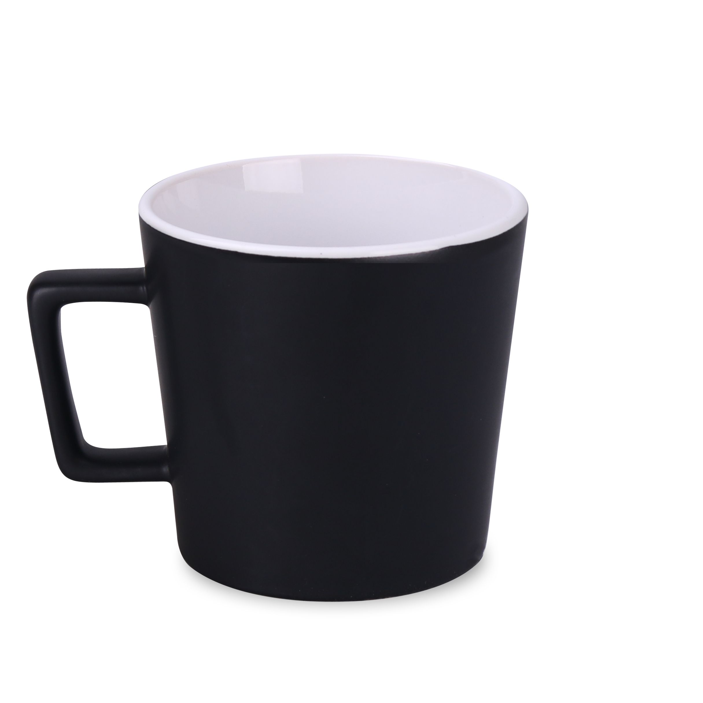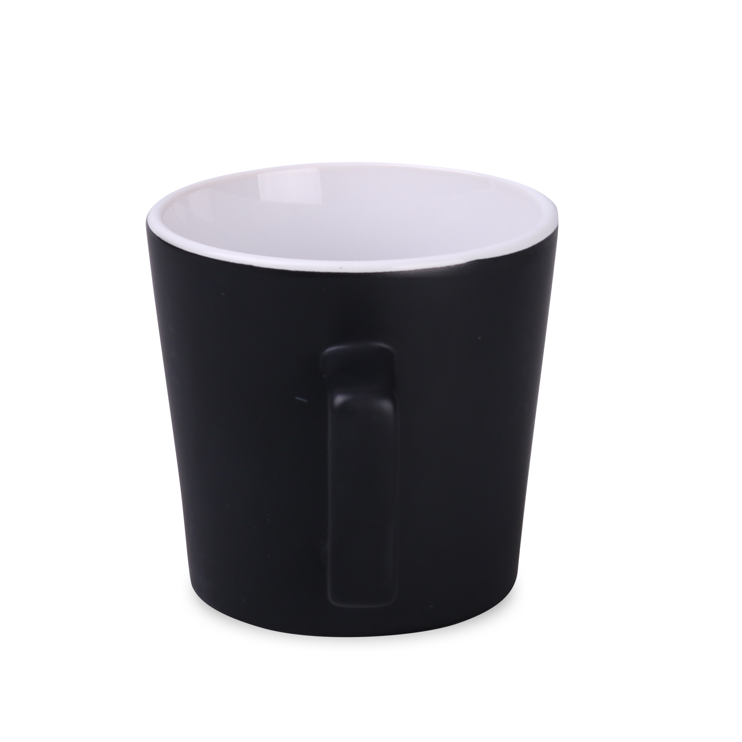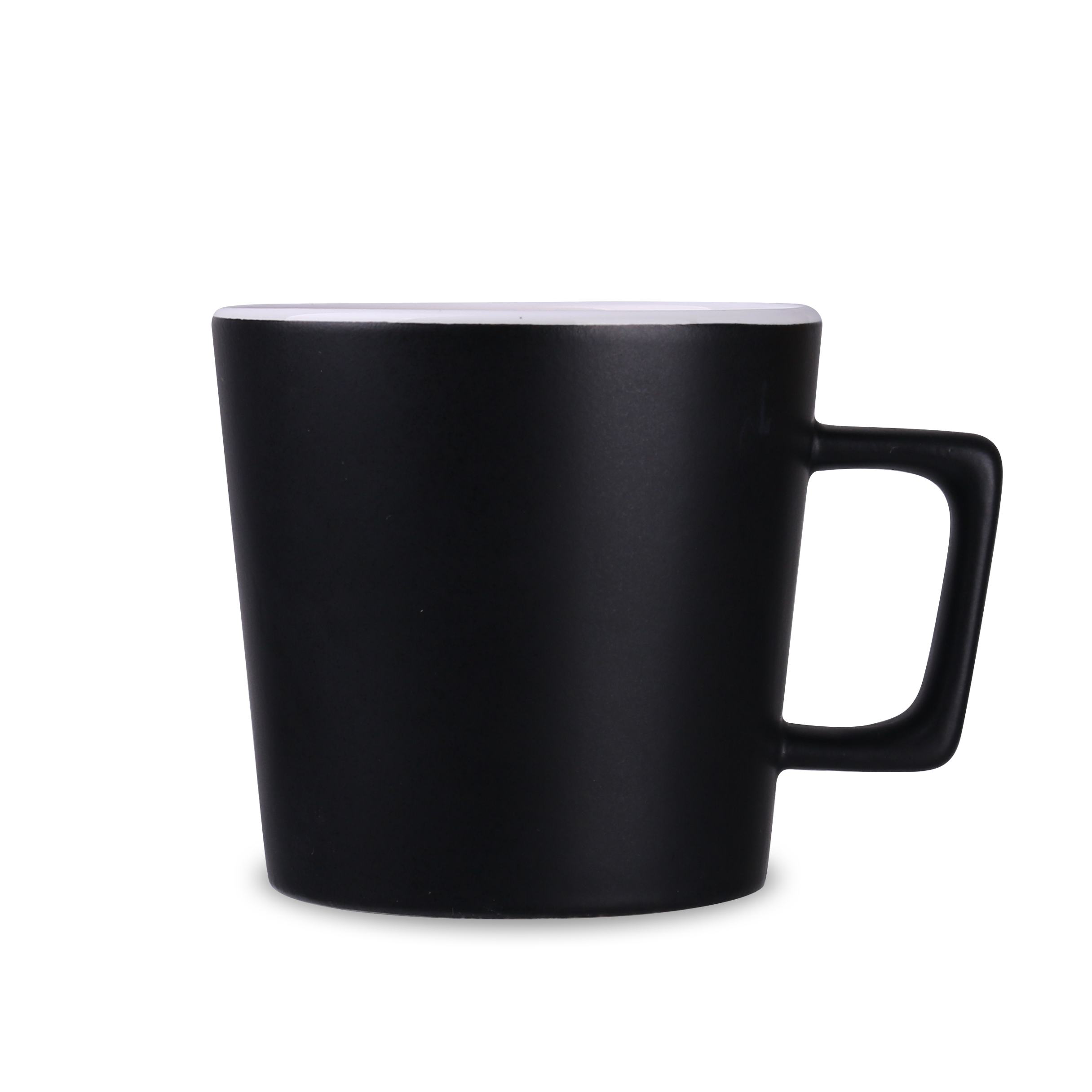 Nowoczesny kubek z czarną matową powierzchnią. Posiada ucho o ciekawym, designerskim kształcie. Posiada wnętrze w kilku kolorach.