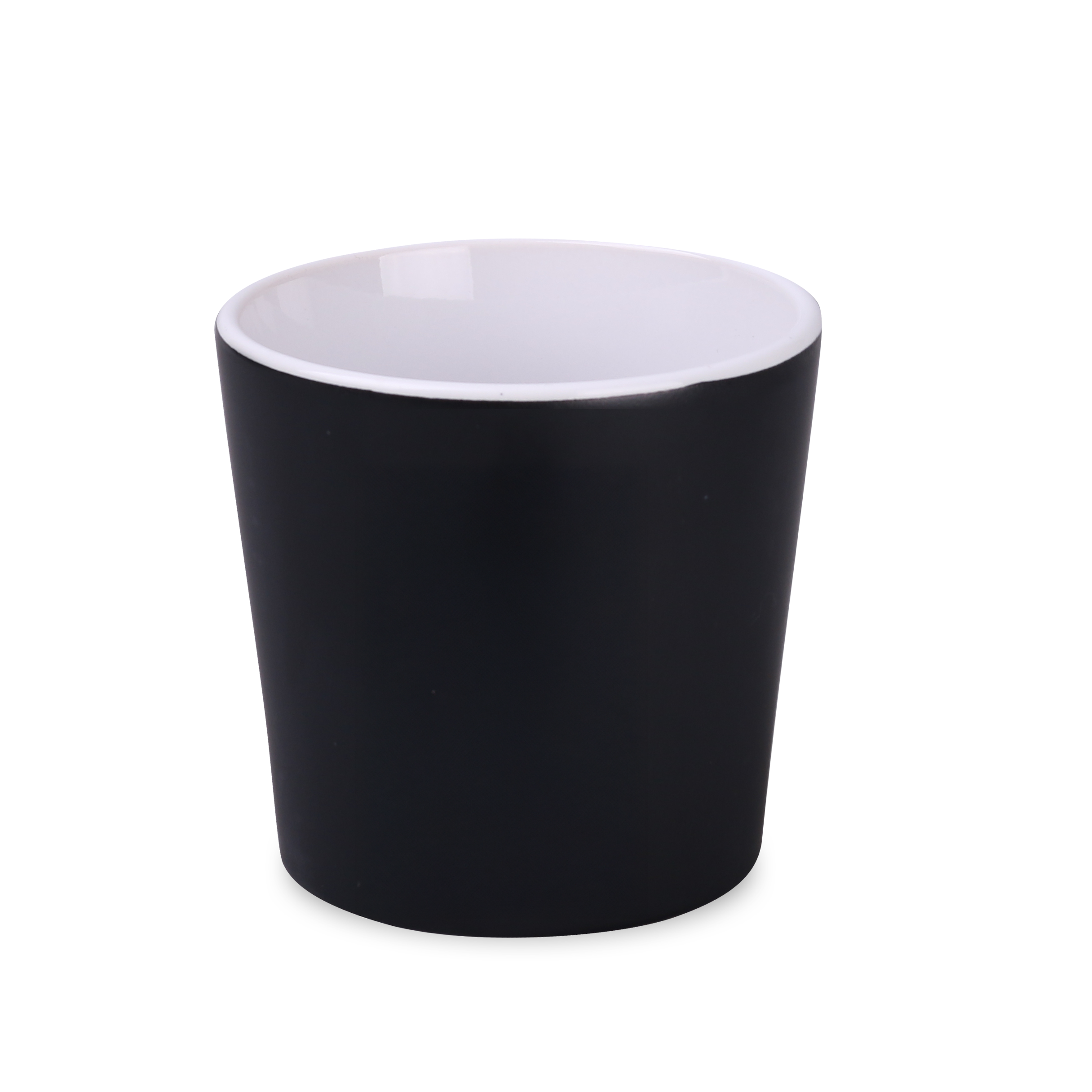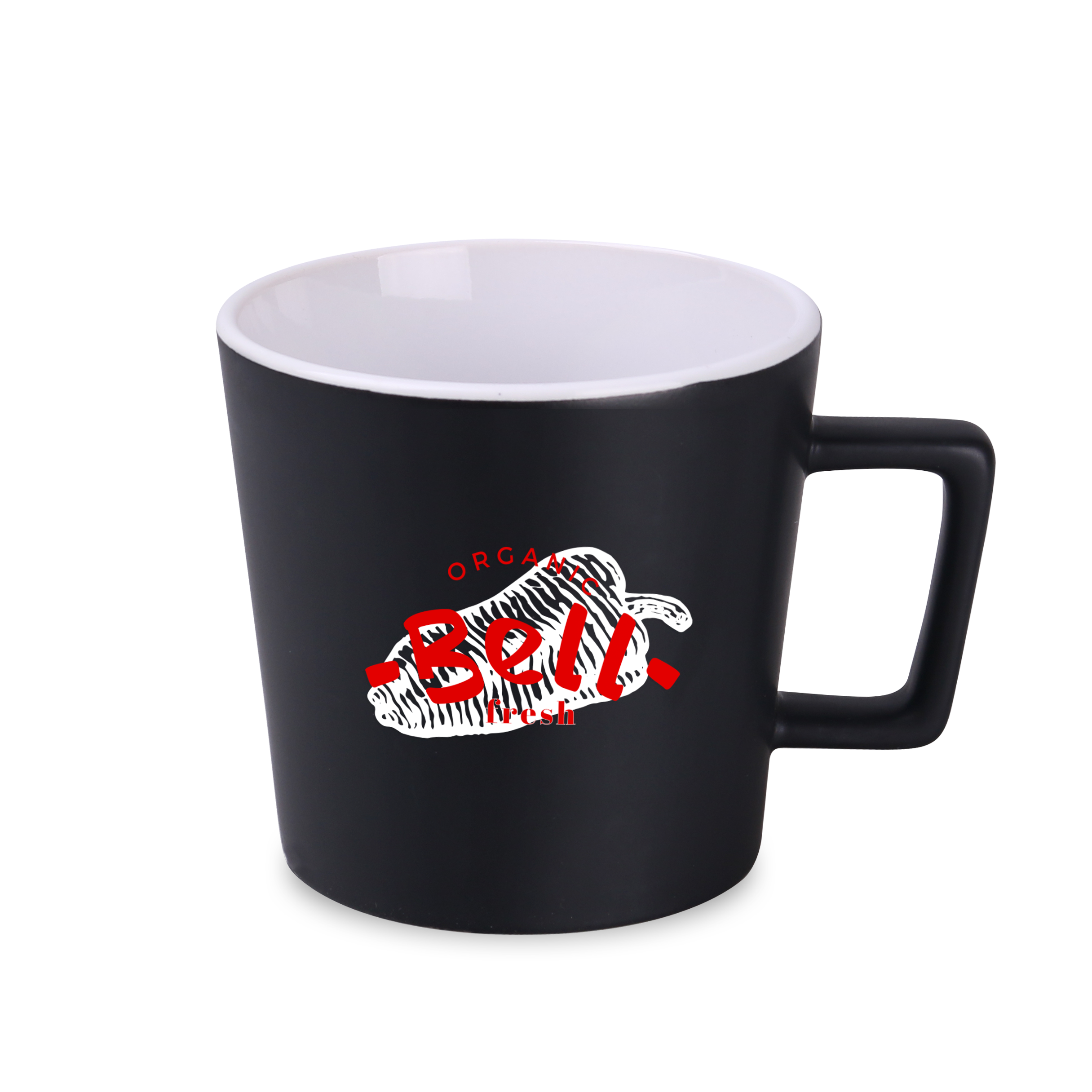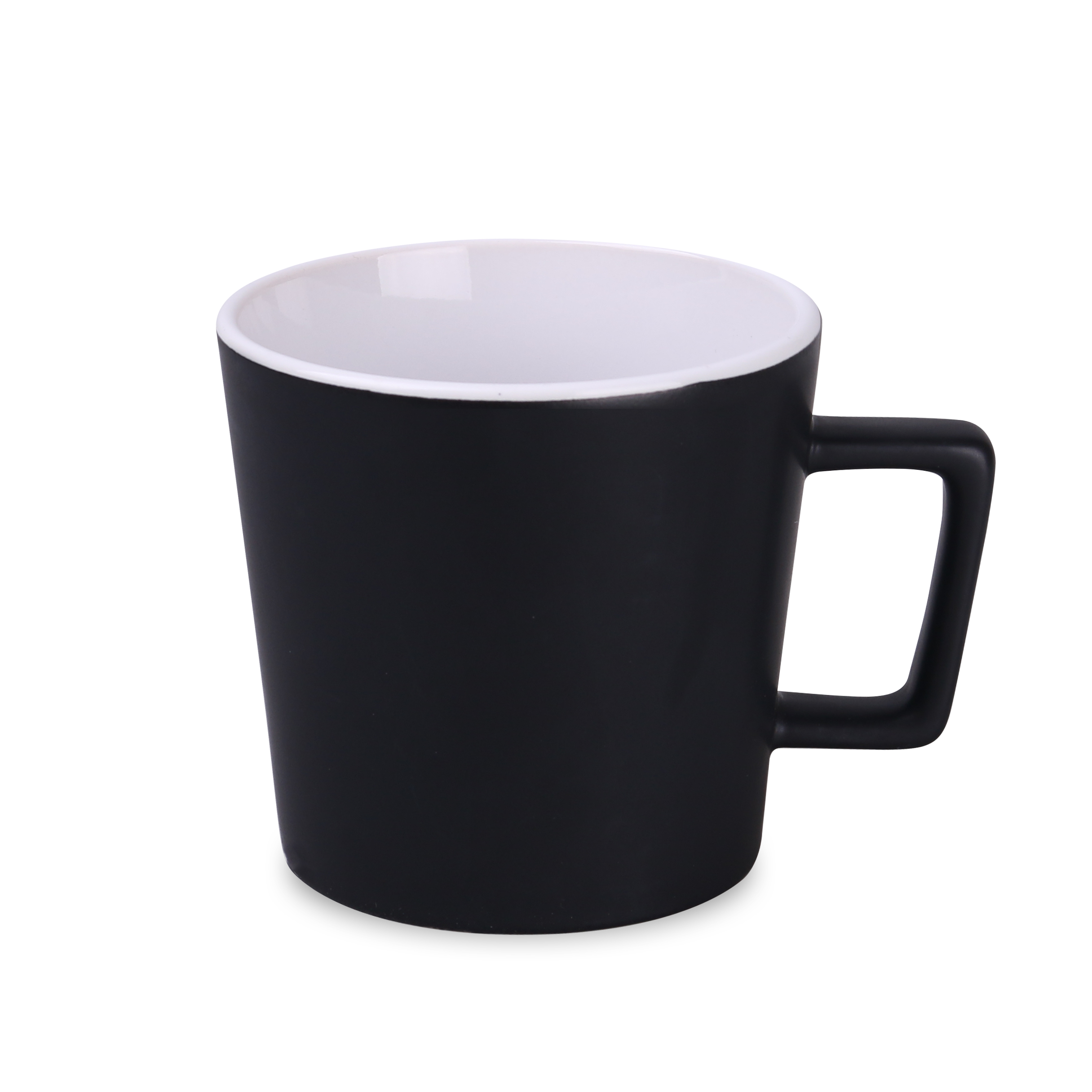 Nowoczesny kubek z czarną matową powierzchnią. Posiada ucho o ciekawym, designerskim kształcie. Posiada wnętrze w kilku kolorach.