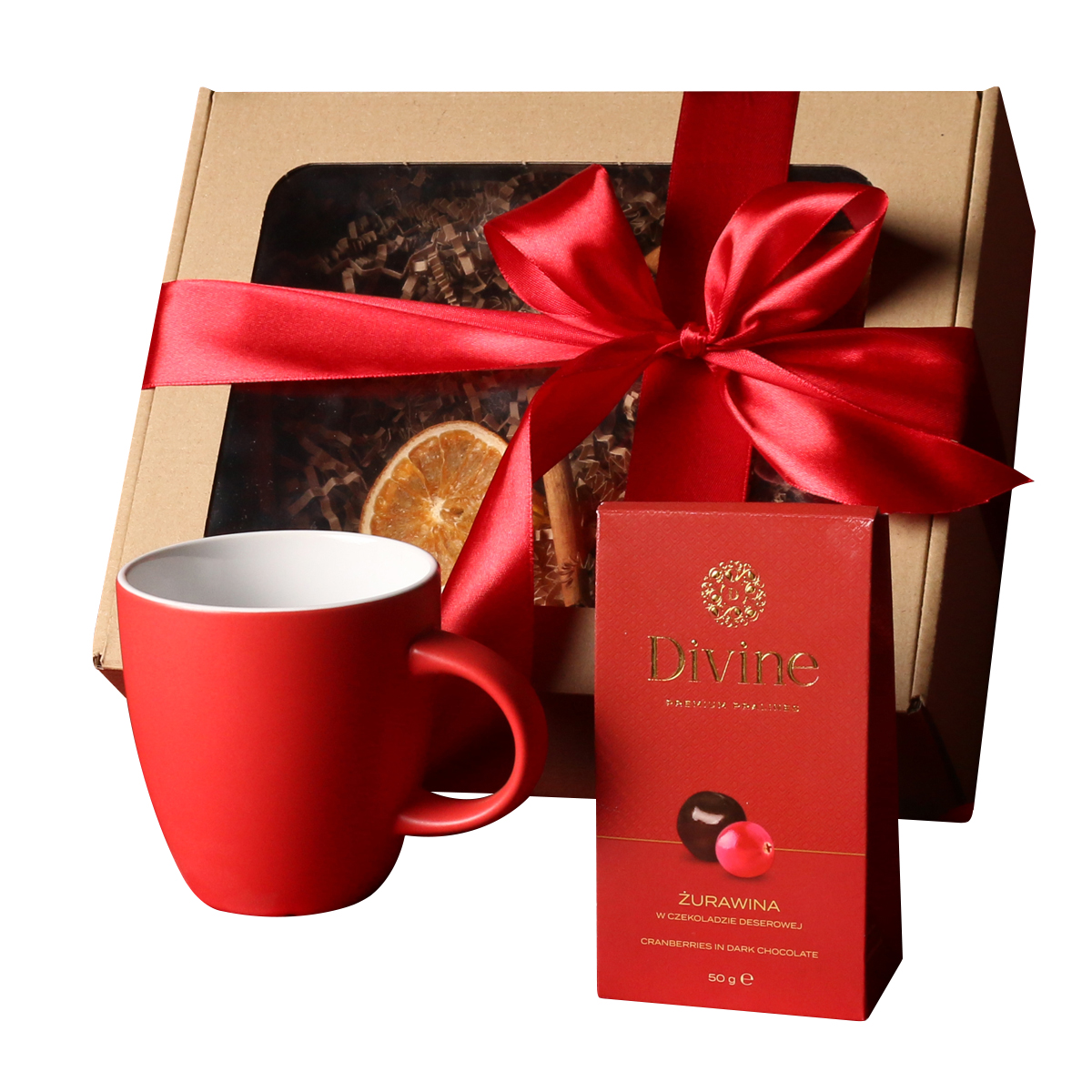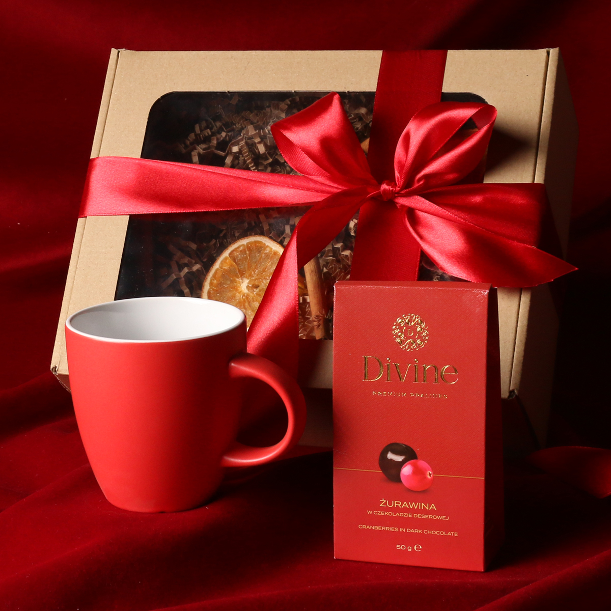 W skład zestawu wchodzą:kubek Fiord czerwono-biały / granatowy-biały / czarny-biały z możliwością zdobienia, Divine Pralines - żurawina w czekoladzie (czerwony) / borówki w czekoladzie (granatowy) / skórka pomarańczy w czekoladzie (czarny)Całość w stylowym opakowaniu z tektury eco z okienkiem. Opcje dodatkowej customizacji: nadruk na kubku, bilecik z logo firmy, wstążka lub obwoluta z motywem zimowym wzbogacona złoceniem