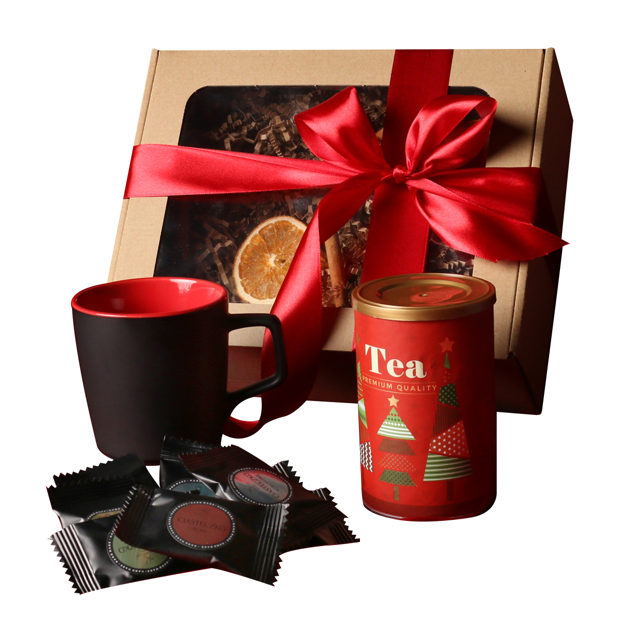 W skład zestawu wchodzą: kubek Barrel Supreme czarno-czwrwony / czarny-reflex blue / czarny-czarny z możliwością zdobienia, zielona herbata Sencha z wiśniami, płatkami róży zapakowana w tubę z motywem zimowym, 8 stuk czekoladek - mix smaków. Całość w stylowym opakowaniu z tektury eco z okienkiem. Opcje dodatkowej customizacji: nadruk na kubku, bilecik z logo firmy, wstążka lub obwoluta z motywem zimowym wzbogacona złoceniem.