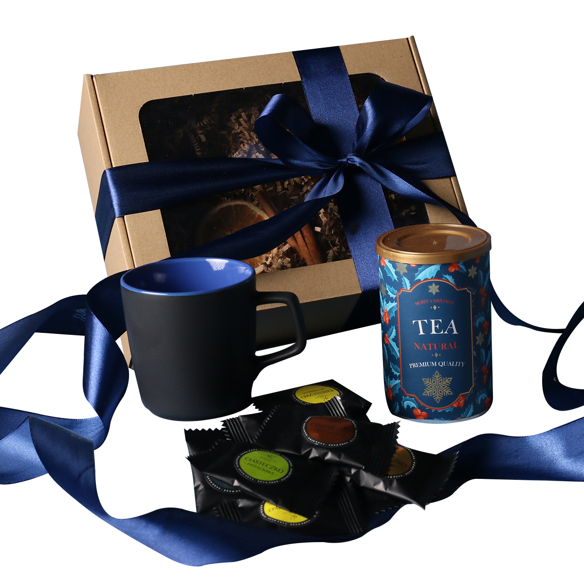 W skład zestawu wchodzą: kubek Barrel Supreme czarno-czwrwony / czarny-reflex blue / czarny-czarny z możliwością zdobienia, zielona herbata Sencha z wiśniami, płatkami róży zapakowana w tubę z motywem zimowym, 8 stuk czekoladek - mix smaków. Całość w stylowym opakowaniu z tektury eco z okienkiem. Opcje dodatkowej customizacji: nadruk na kubku, bilecik z logo firmy, wstążka lub obwoluta z motywem zimowym wzbogacona złoceniem.