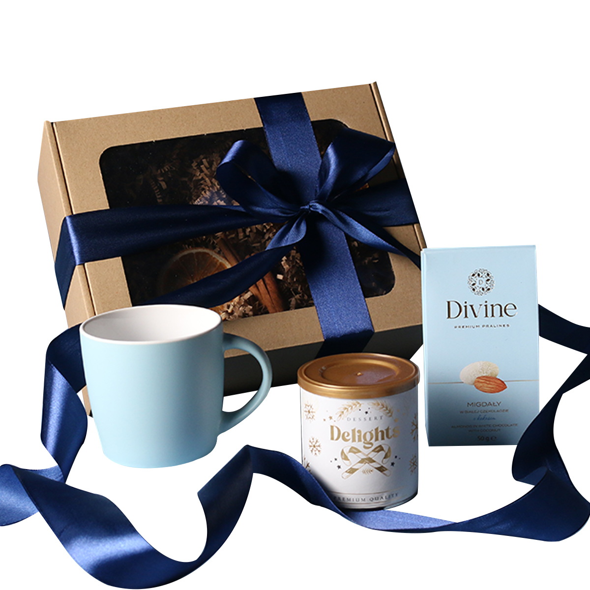 W skład zestawu wchodzą: kubek Handy Velvet rose pink-biały / baby blue-biały / Handy Cool szary-biały z możliwością zdobienia, Divine Pralines - migdały w czekoladzie z malinowym pudrem (różowy) / migdały w czekoladzie z kokosem (niebieski), skórka pomarańczy w czekoladzie deserowej (szary) Dessert Delights - Czarna porzeczka w białej czekoladzie z pudrem malinowym zapakowana w tubę z motywem zimowym. Całość w stylowym opakowaniu z tektury eco z okienkiem. Opcje dodatkowej customizacji: nadruk na kubku, bilecik z logo firmy, wstążka lub obwoluta z motywem zimowym wzbogacona złoceniem.