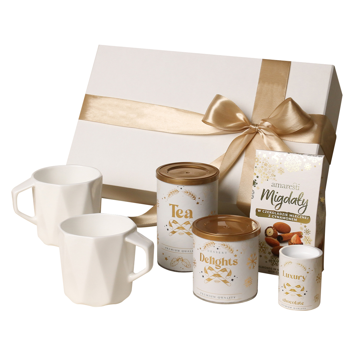 W skład zestawu wchodzą:kubek Crown biały (2 szt.) z możliwością zdobienia, zielona herbata Sencha z wiśniami, płatkami róży zapakowana w tubę z motywem zimowym, Amaresti Pralines - Migdały w czekoladzie z cynamonem, Dessert Delights - Czarna porzeczka w białej czekoladzie, Luxury Chocolate - Czekolada Belgijska do picia w tubie z motywem zimowym. Całość w stylowym, śnieżnobiałym opakowaniu z magnesem. Opcje dodatkowej customizacji: nadruk na kubkach, bilecik z logo firmy, wstążka lub obwoluta z motywem zimowym wzbogacona złoceniem.