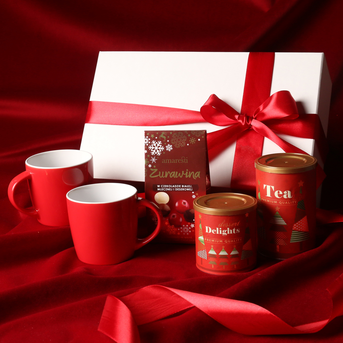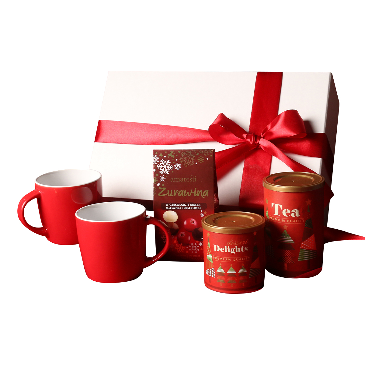 W skład zestawu wchodzą: kubek Handy czerwony/biały (2 szt.) z możliwością zdobienia, zielona herbata Sencha z wiśniami, płatkami róży zapakowana w tubę z motywem zimowym, Amaresti Pralines - Żurawina w czekoladzie mlecznej i deserowej, Dessert Delights - Czarna porzeczka w białej czekoladzie, Całość w stylowym, śnieżnobiałym opakowaniu z magnesem. Opcje dodatkowej customizacji: nadruk na kubkach, bilecik z logo firmy, wstążka lub obwoluta z motywem zimowym wzbogacona złoceniem.
