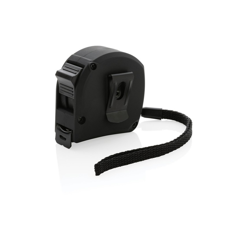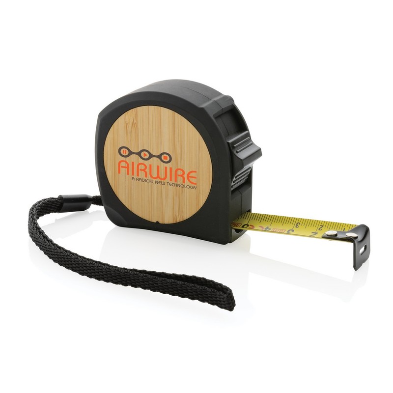 Miara 5 m, taśma o szerokości 19 mm z haczykiem i magnesami, przycisk blokady, wykonana z ABS pochodzącego z recyklingu z certyfikatem RCS (Recycled Claim Standard) który gwarantuje, że wykorzystane materiały pochodzą z recyklingu, całkowita zawartość materiału z recyklingu obliczona w oparciu o wagę całkowitą przedmiotu: 11%, uchwyt z TPR, bambusowy element, w pudełku z papieru kraftowego z certyfikatem FSC® mix (Forest Stewardship Council), ślad węglowy produktu: 0,76 kg CO2