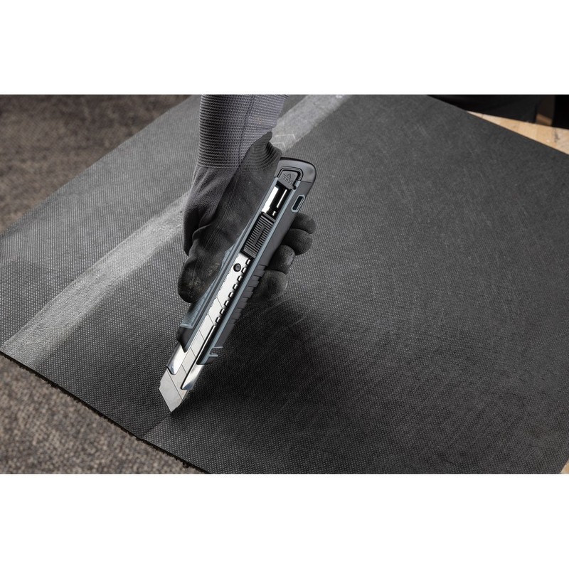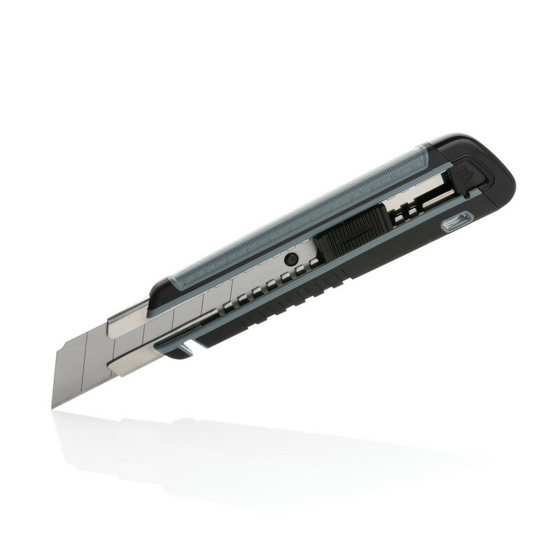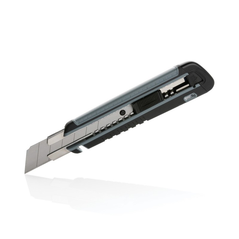 Nóż do tapet, wymienne ostrza, wykonany z ABS z recyklingu z certyfikatem RCS, łamane ostrze ze stali nierdzewnej, całkowita zawartość materiałów z recyklingu obliczona na podstawie wagi przedmiotu: 41%, produkt jest dostarczany z 1 ostrzem wewnątrz noża oraz 2 ostrzami zapasowymi, w pudełku papieru kraftowego z certyfikatem FSC® mix, ślad węglowy produktu: 0,95 kg CO2