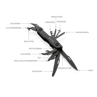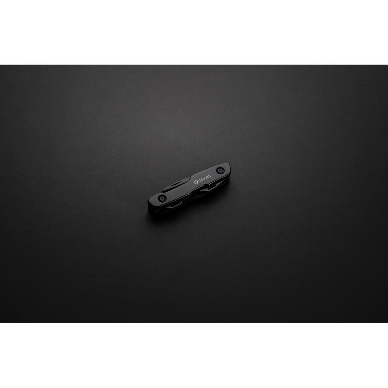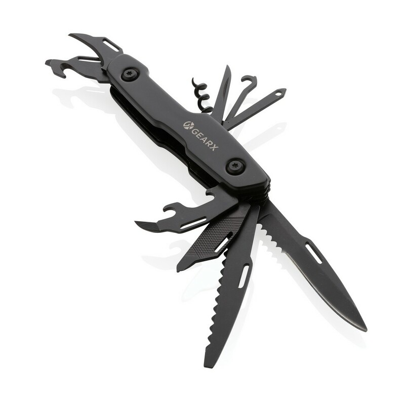 Narzędzie wielofunkcyjne, obudowa wykonana z aluminium, narzędzia ze stali nierdzewnej 420, 13 funkcji: nóż, piła, śrubokręt płaski, otwieracz do puszek, pilnik, mały śrubokręt krzyżakowy, śrubokręt krzyżakowy, korkociąg, szydło, przebijak, otwieracz do kartonów, otwieracz do butelek i małe ostrze, w pudełku podarunkowym, ślad węglowy produktu: 1,77 kg CO2