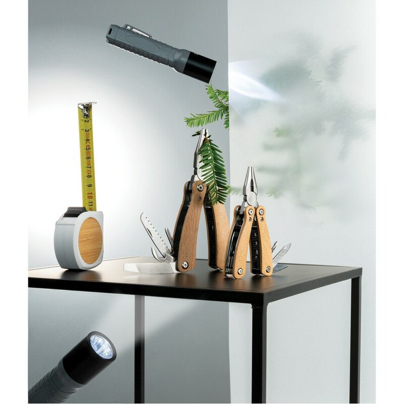 Trwałe i kompaktowe narzędzie wielofunkcyjne, wykonane z wysokiej jakości stali nierdzewnej, uchwyt z drewna bukowego, 12 funkcji: długie szczypce, kombinerki, przecinak do kabli i drutu, ostrze ząbkowane, mały nóż, średni śrubokręt płaski, otwieracz do butelek, duży śrubokręt płaski, nóż, mały śrubokręt płaski, śrubokręt krzyżakowy, pilnik i skrobak, w ozdobnym pudełku, ślad węglowy produktu: 0,56 kg CO2