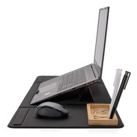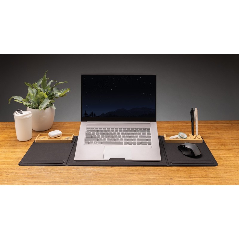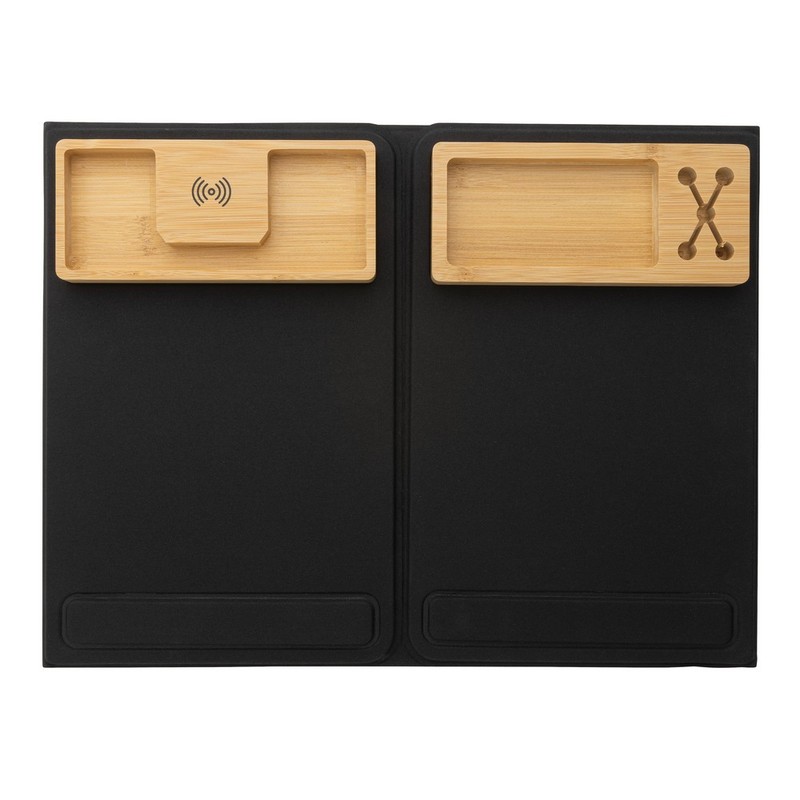 Składany organizer na biurko, podstawka na laptopa do 17", bambusowa ładowarka bezprzewodowa 10W, bambusowy stojak na długopisy, ładowarka i stojak przymocowane na magnes, organizer wykonany z materiałów pochodzących z recyklingu do produkcji których zostało ponownie wykorzystanych 11 butelek PET o pojemności 0,5 l, dzięki zastosowaniu technologii śledzącej AWARE™ wykorzystane włókna są identyfikowalne z pochodzenia, 2% wpływów z każdego sprzedanego produktu jest przekazywane na rzecz Water.org, kabel micro USB w komplecie