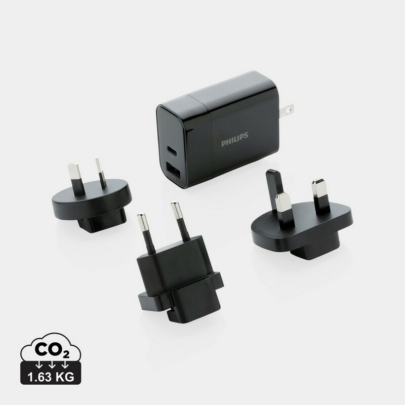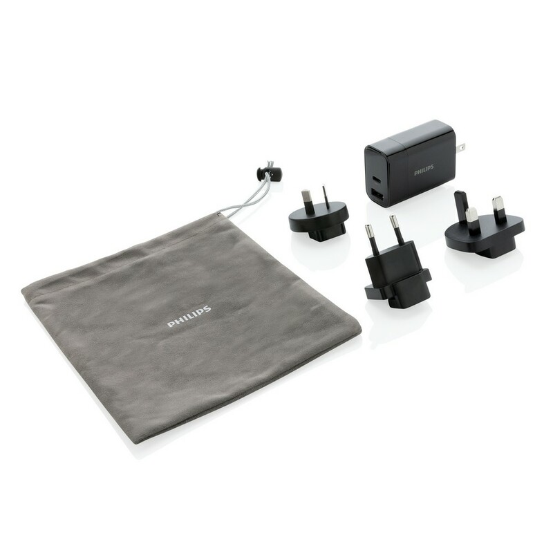 Uniwersalna ładowarka Philips 30W, adapter podróżny, wtyczki z USA, Australii, UK i UE, wejście 100-240V, wyjście USB 5V/2.4A, wyjście typu C 5V/3A, 9V/2A, 12V/1.5A, pokrowiec w komplecie, w ozdobnym pudełku Philips, ślad węglowy produktu: 1,63 kg CO2