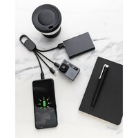 Kabel do ładowania 4 w 1 z karabińczykiem z 4 końcówkami: USB, micro USB, USB typu C oraz końcówką 2 w 1 (micro USB oraz kompatybilną z urządzeniami iOS), obudowa wykonana z ABS, nylonowe kable o długości 10 cm, obsługuje ładowanie do 2.1A, ślad węglowy produktu: 0,47 kg CO2