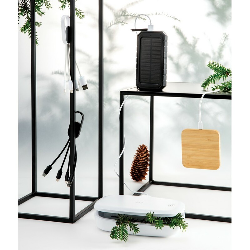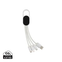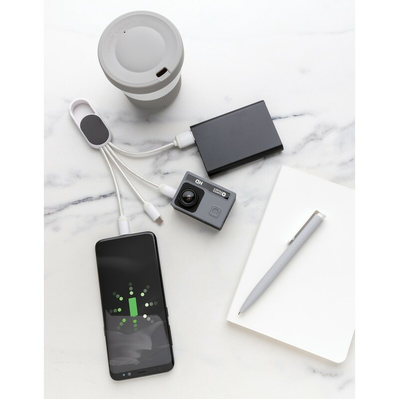 Kabel do ładowania 4 w 1 z karabińczykiem z 4 końcówkami: USB, micro USB, USB typu C oraz końcówką 2 w 1 (micro USB oraz kompatybilną z urządzeniami iOS), obudowa wykonana z ABS, nylonowe kable o długości 10 cm, obsługuje ładowanie do 2.1A, ślad węglowy produktu: 0,47 kg CO2