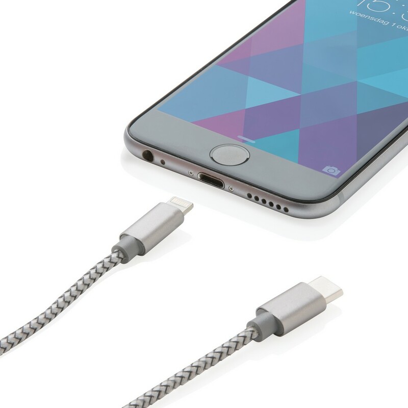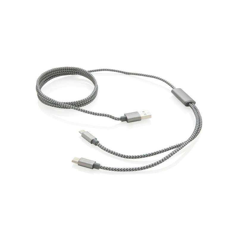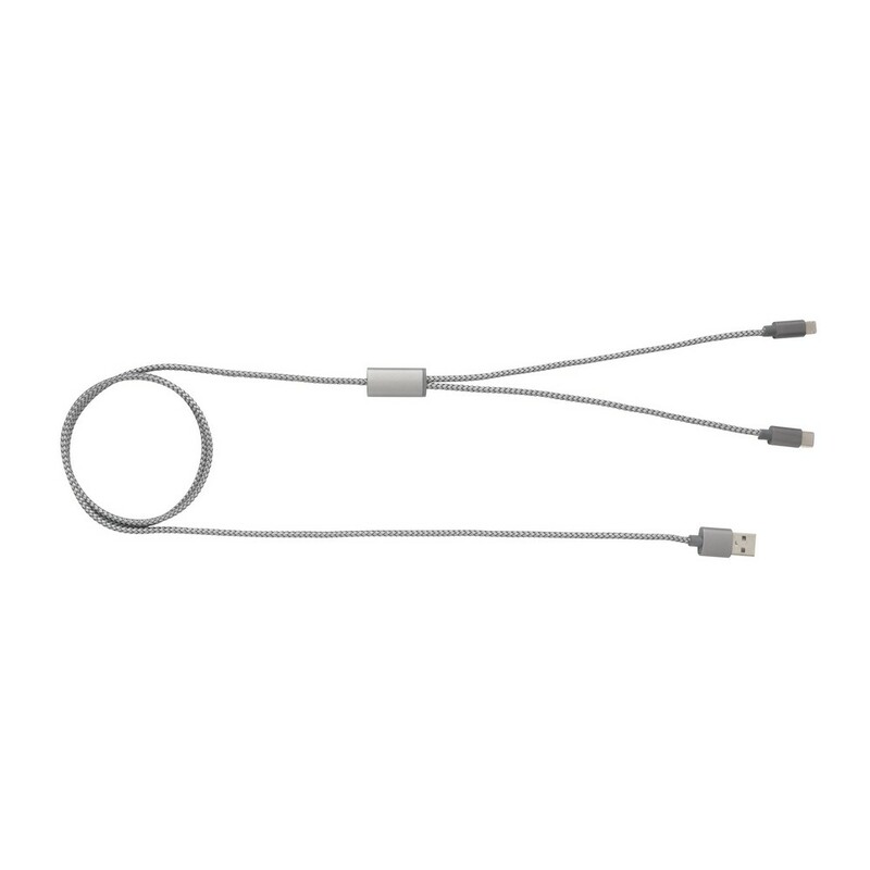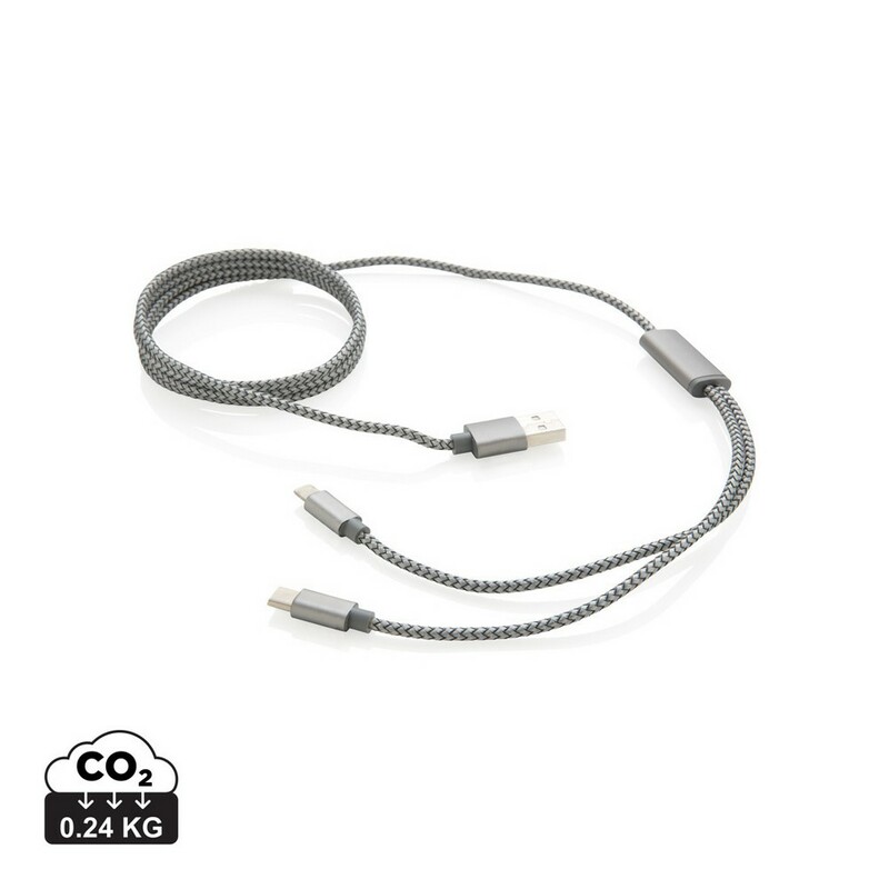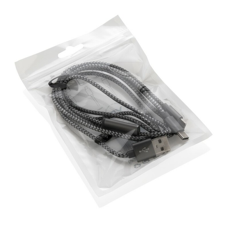 Pleciony kabel do ładowania 3 w 1 z 3 końcówkami: USB, typu C i 2 w 1 (micro USB oraz kompatybilną z urządzeniami iOS), wykonany z plecionego nylonu, długość 120 cm, ślad węglowy produktu: 0,24 kg CO2
