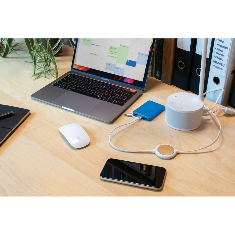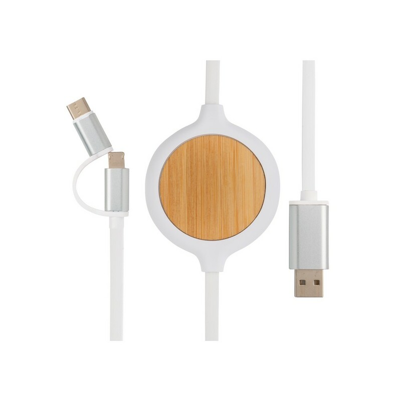 Bambusowy kabel do ładowania 3 w 1, ładowarka bezprzewodowa 5W, 3 końcówki: USB, USB typu C oraz 2 w 1 (micro USB oraz kompatybilna z urządzeniami iOS), bezprzewodowe ładowanie jest kompatybilne ze wszystkimi urządzeniami posiadającymi możliwość ładowania indukcyjnego, wejście 5V/2A, 9V/2A, wyjście bezprzewodowe 5V/1A, 9V/1.1A, maksymalne wyjście kabla 5V/1A, ślad węglowy produktu: 0,72 kg CO2