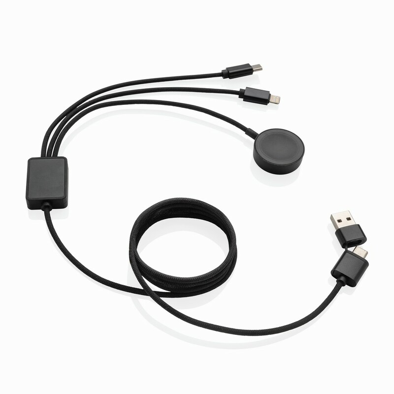 Kabel do ładowania 6 w 1 Terra, bezprzewodowa ładowarka do zegarka, wykonany z recyklingowanego aluminium, PET, ABS i TPE z certyfikatem RCS, podwójne wejście: USB-A i USB-C, podwójne wyjście: Lightning i USB-C, ładowarka 2,5W do zegarków (Apple Watch, Samsung Watch), pleciony kabel z PET o długości 120 cm, obsługuje ładowanie do 5V/2A, opakowanie FSC® mix